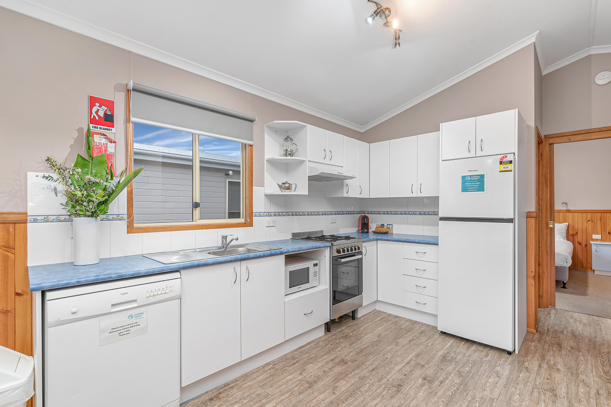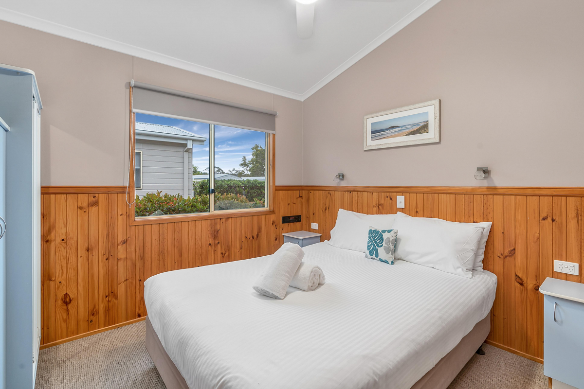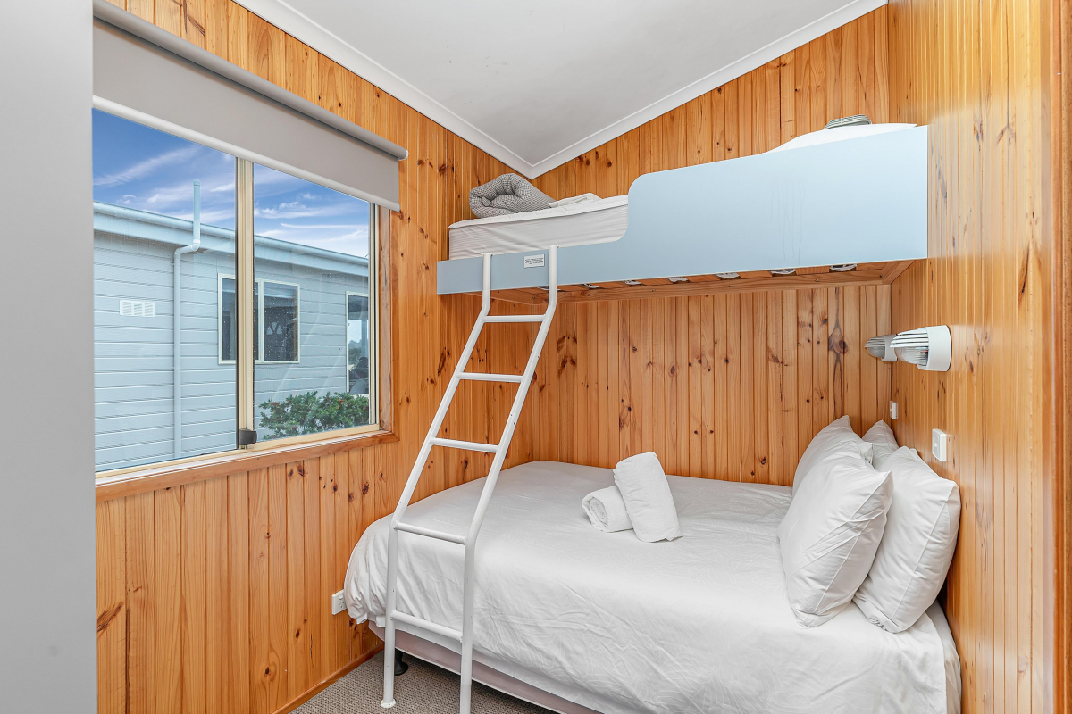 These cabins feature a queen bed in the main bedroom and a double bed with single bunk over the top in the second bedroom with all linen and bath towels provided.