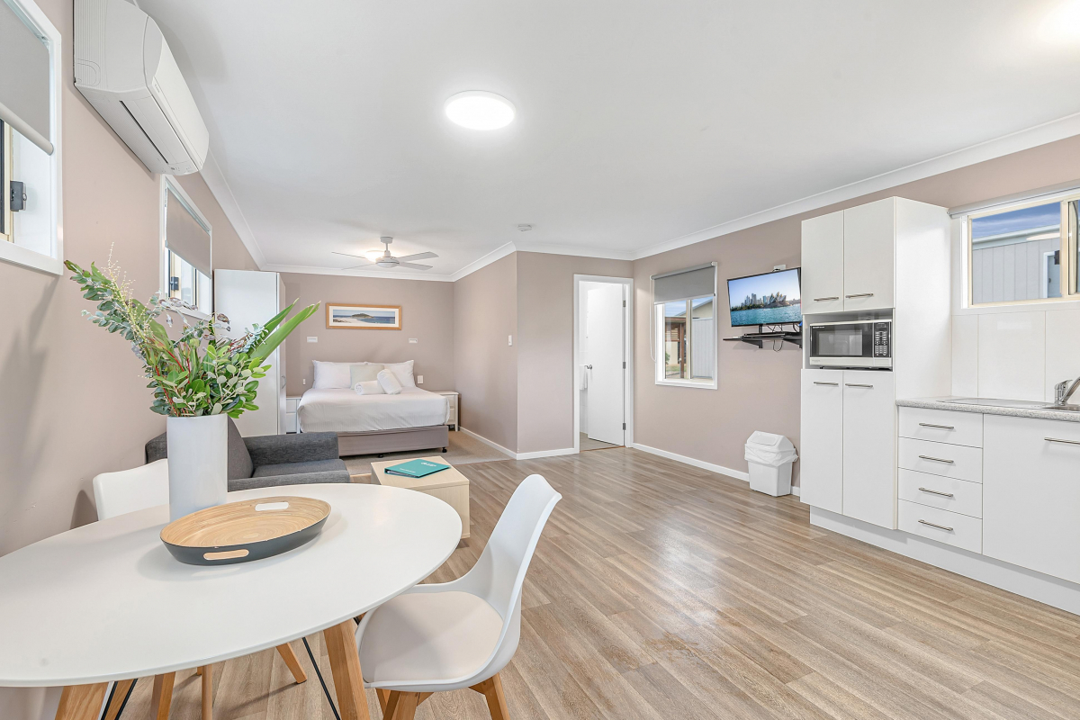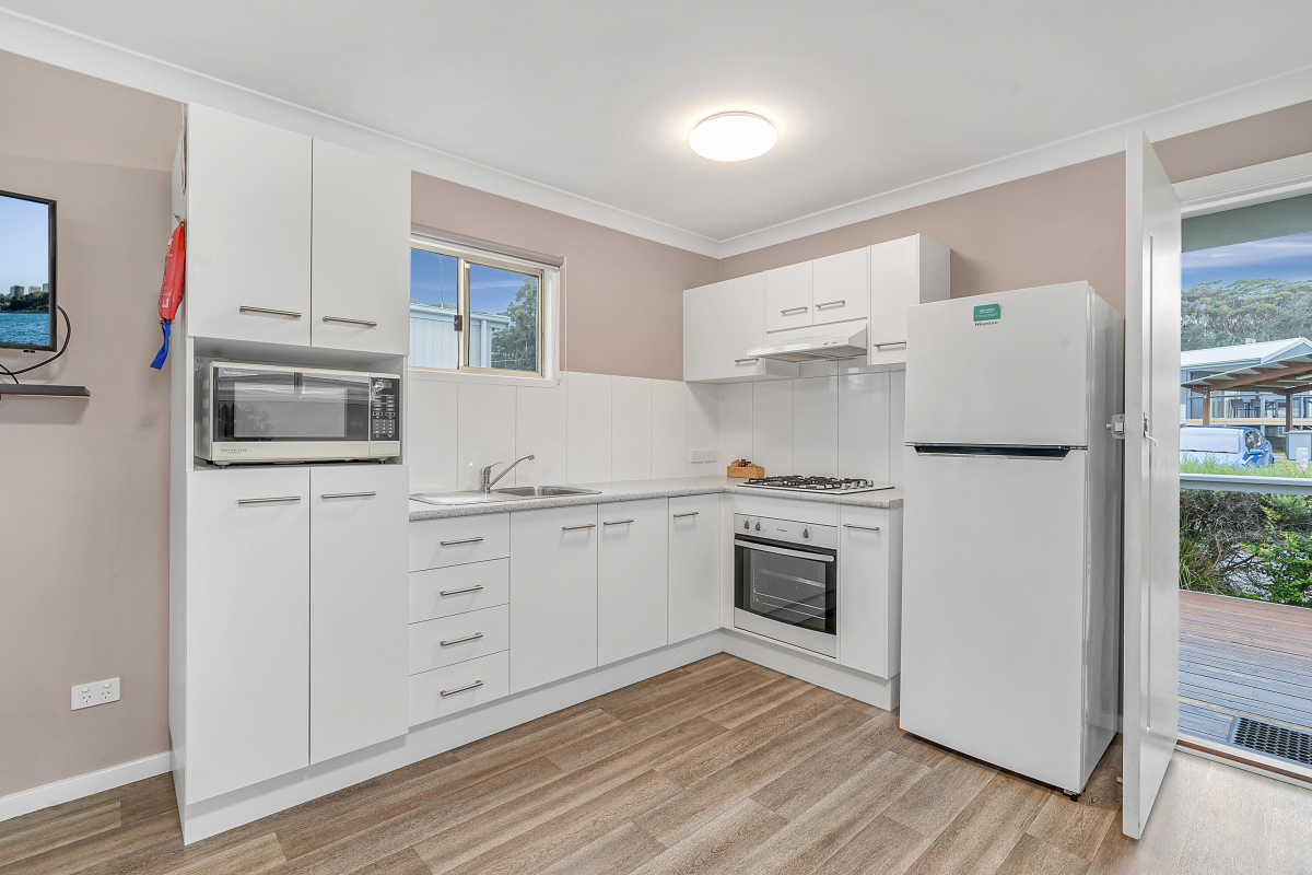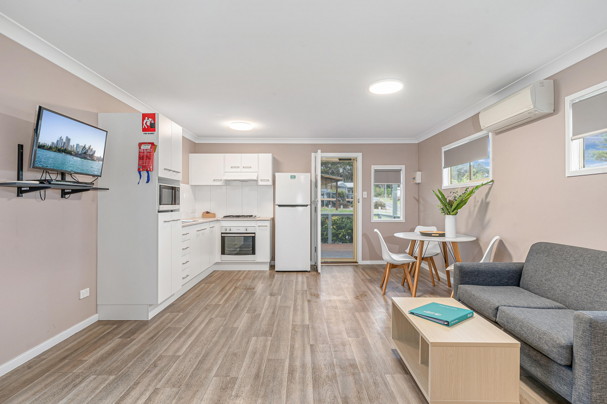The Studio Cabin suitable for a couple featuring a queen bed in the main bedroom with all linen and bath towels provided. The kitchen offers a gas stove with electric oven, full sized fridge and microwave. The cabin also offers a flat screen TV, DVD player, reverse cycle air conditioning and a fully covered deck with Jack and Jill seating.
