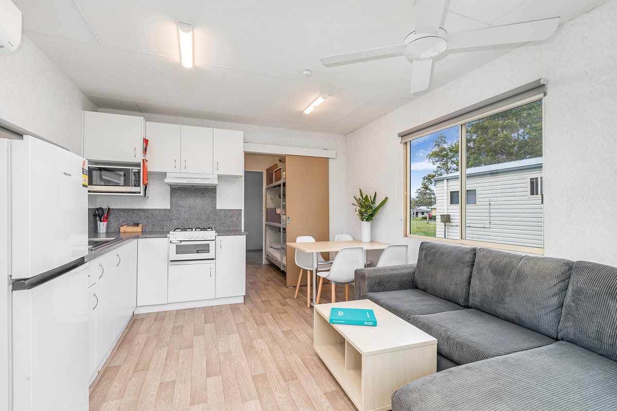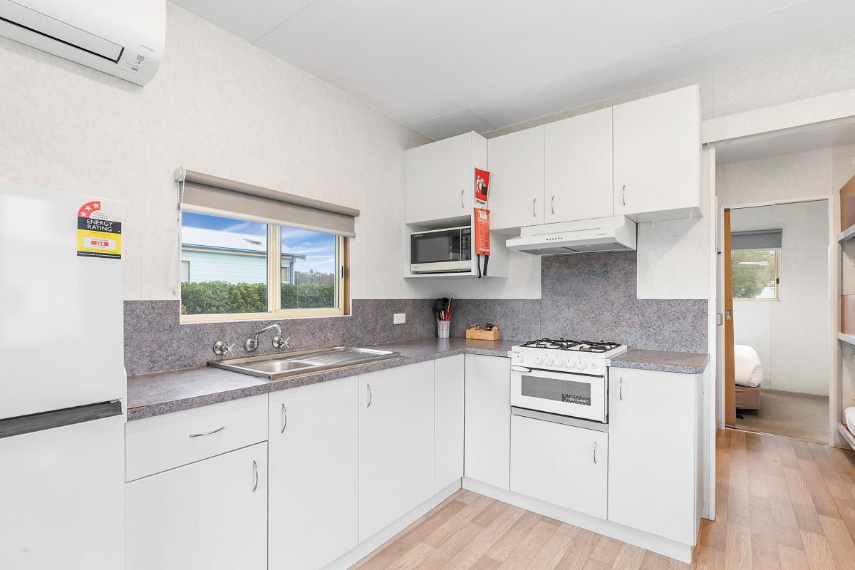 The kitchen features a gas stove with electric grill, microwave and full sized fridge. This cabin also offers reverse cycle air conditioning, ceiling fan, flat screen TV, DVD and a partially covered deck with seating.