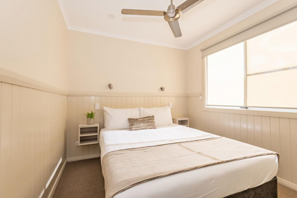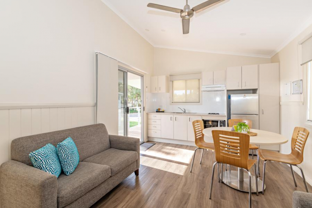 The Bolong Cabins are a modern & very comfortable 2 bedroom cabin with a queen bed in the main bedroom & 2 single beds in the second bedroom. Our Bolong cabins are fully self contained, the kitchen is equipped with a full sized fridge, a two burner gas cooktop and microwave. The spacious lounge area also features an R/C air conditioner, ceiling fans, a flat screen TV and DVD player. This cabin also includes a private ensuite with toilet, hand basin and shower to make your home away from home even more comfortable.