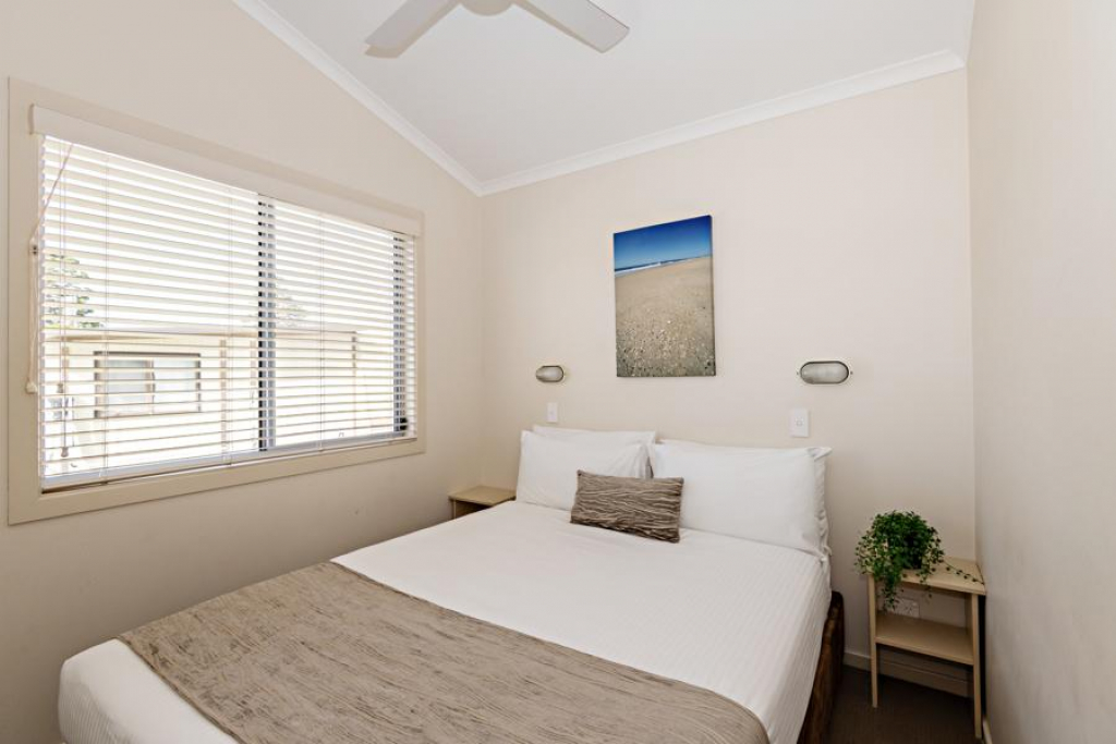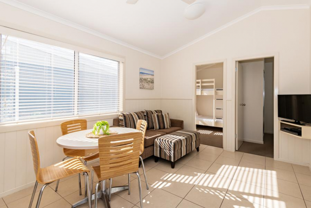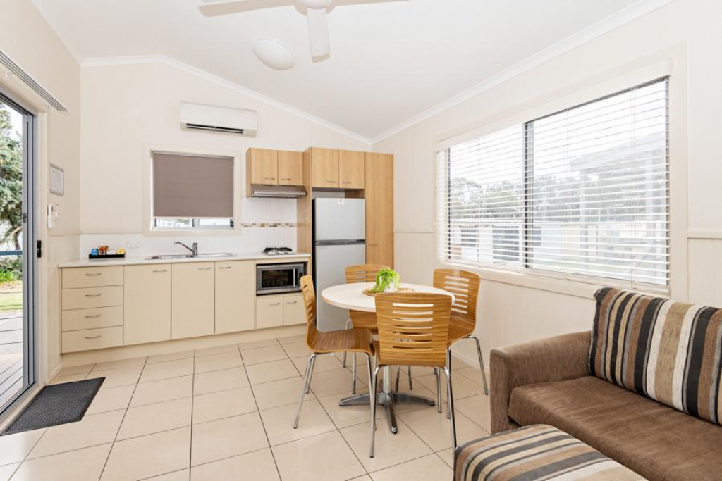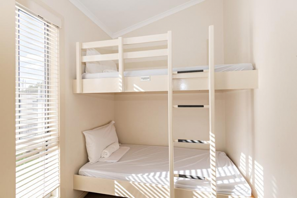 Our Broughton cabins are a cosy and comfortable 2 bedroom home away from home perfect for a family of 4. This cabin has a queen bed & TV in the main bedroom and a set of single bunks in the second bedroom. The Broughton cabins are conveniently situated in the centre of the park close to all park facilities. The kitchen is equipped with a two-burner gas cooktop, microwave oven, and full-size fridge. The lounge area also features a TV, DVD player, reverse cycle air conditioner, as well as ceiling fans to create a comfortable stay all year round. All linen is provided. 3 adults max.