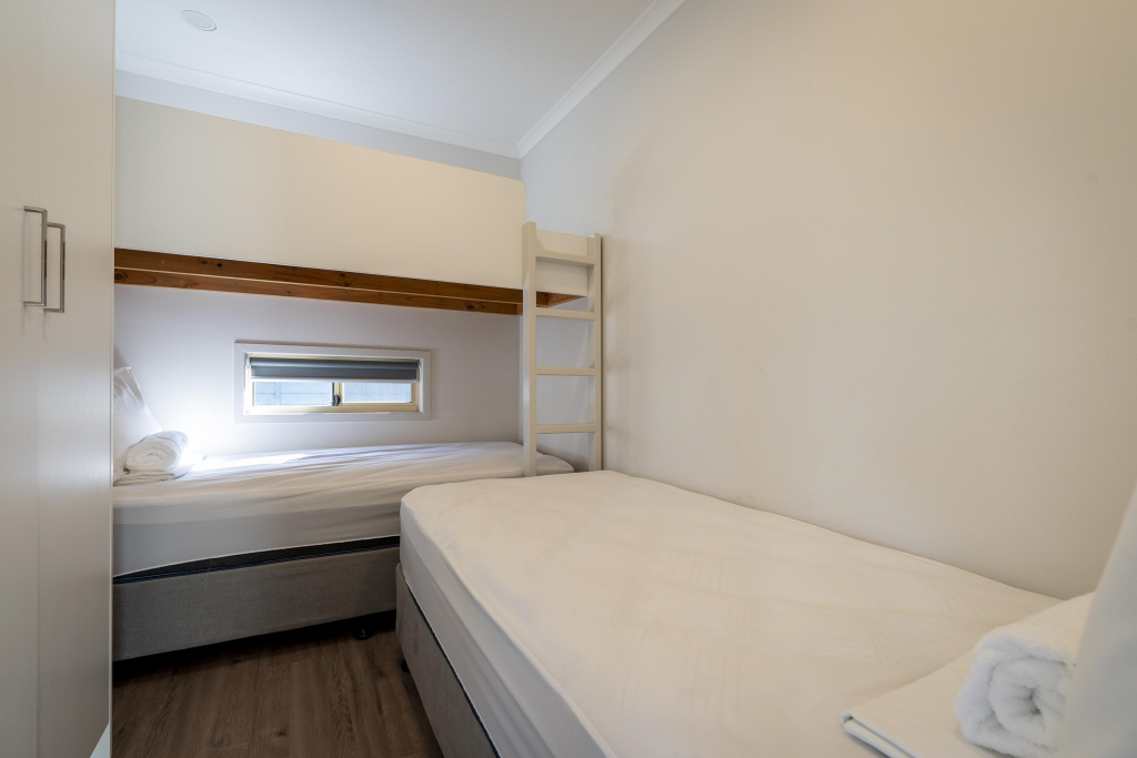 The cabin sleeps 5 with a queen bed in the spacious main bedroom and single bunks and a single bed in the second bedroom, all linen and towels provided.