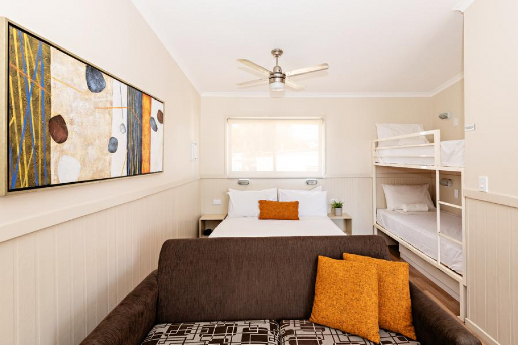 This open plan cabin sleeps 4 people with a queen bed and a set of single bunk beds. There is a small kitchenette equipped with a bar fridge, microwave, kettle and toaster.