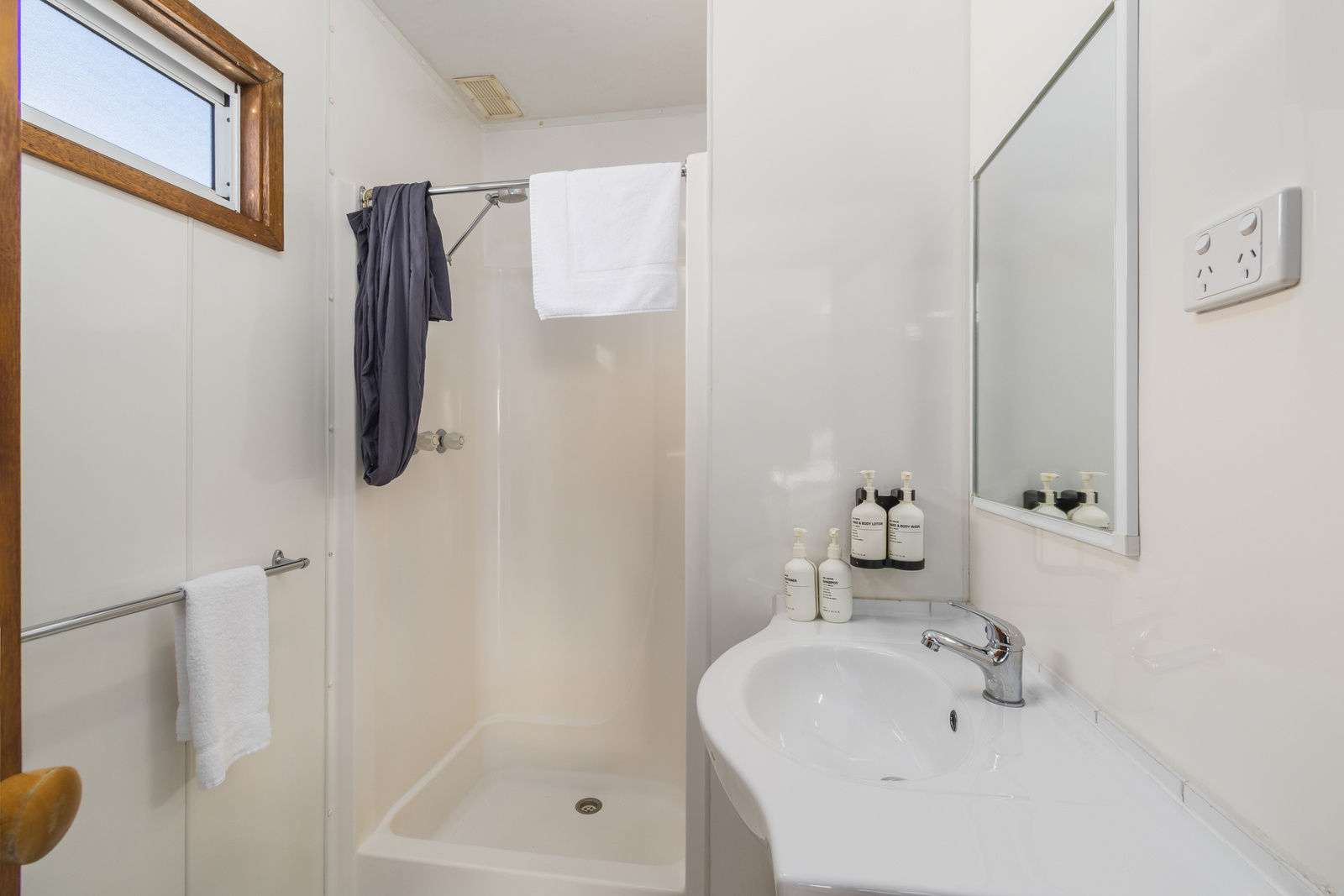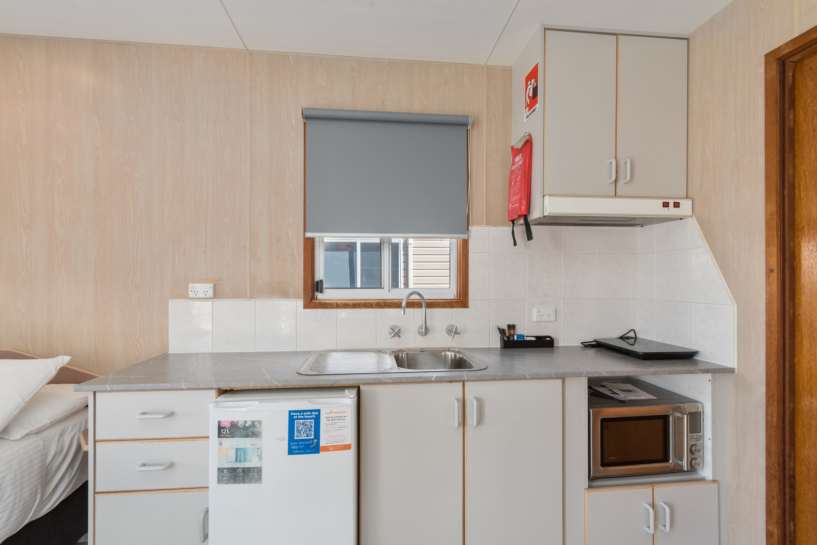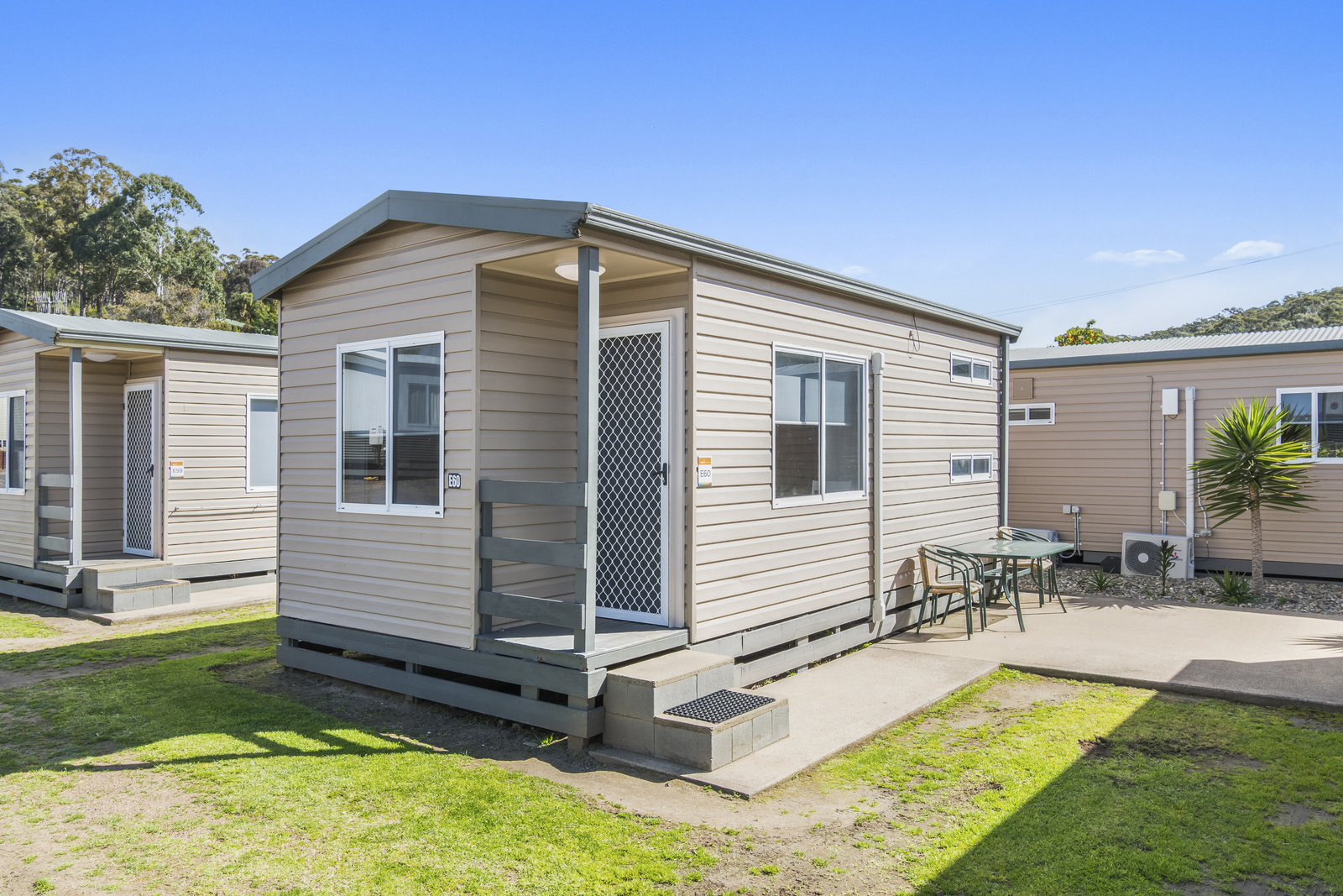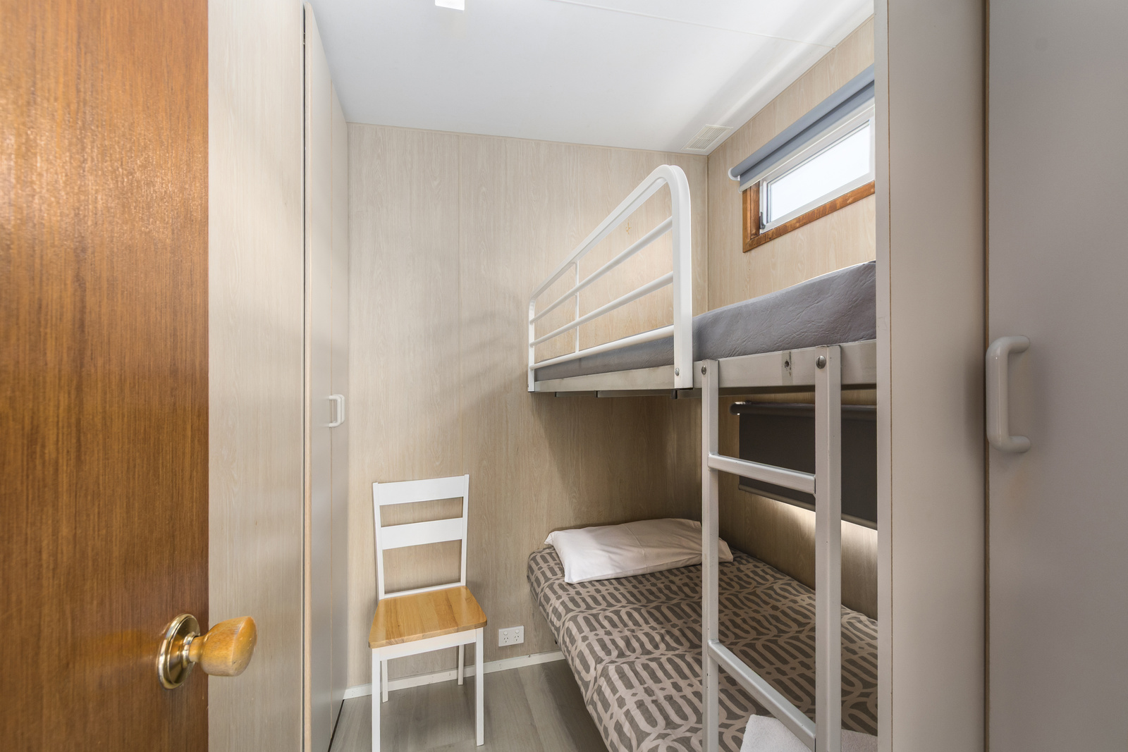 Our Budget Studio Cabins sleep up to four guests with a double bed and bunk in the open plan space, as well as an ensuite bathroom, living area, kitchenette, and outdoor patio.