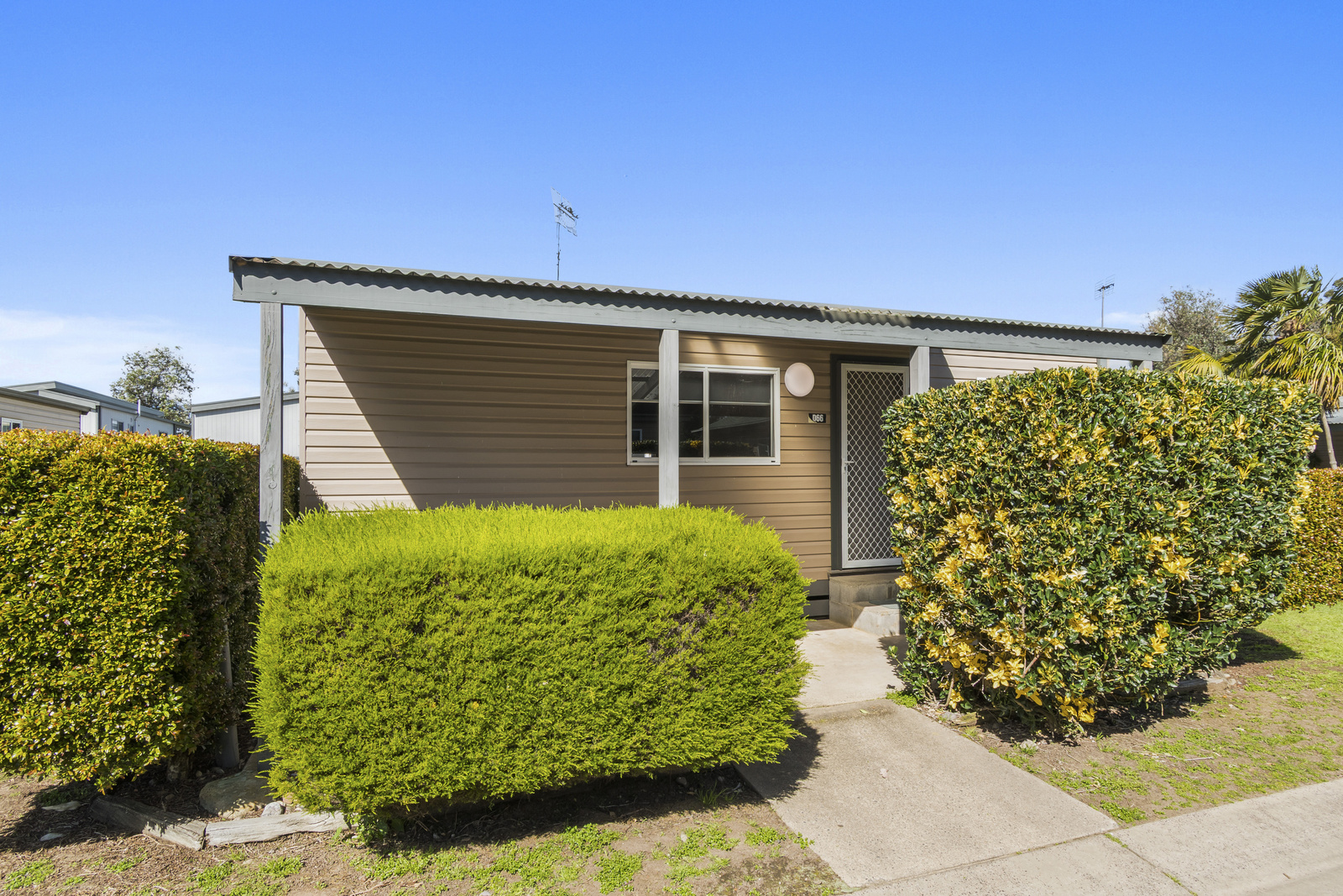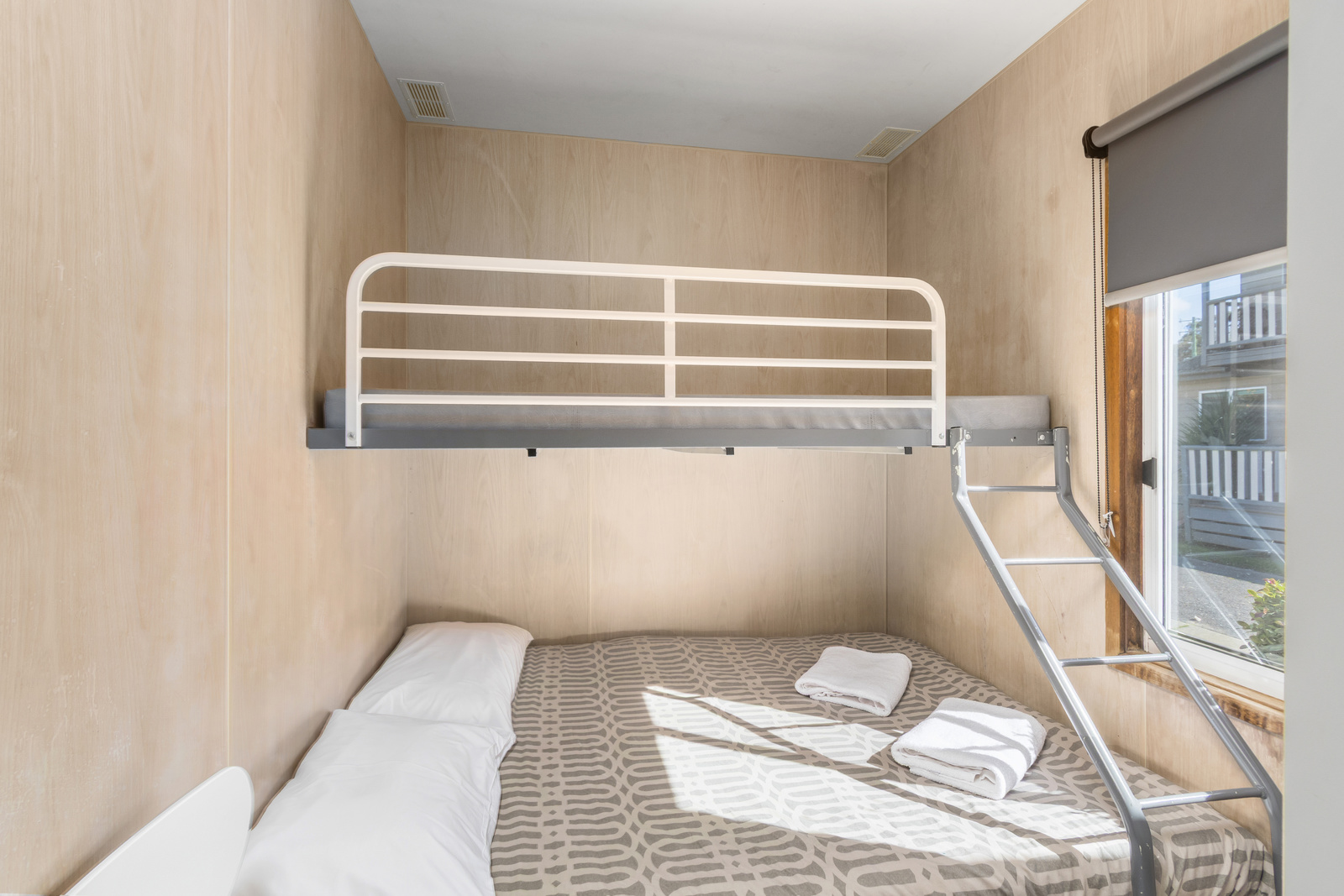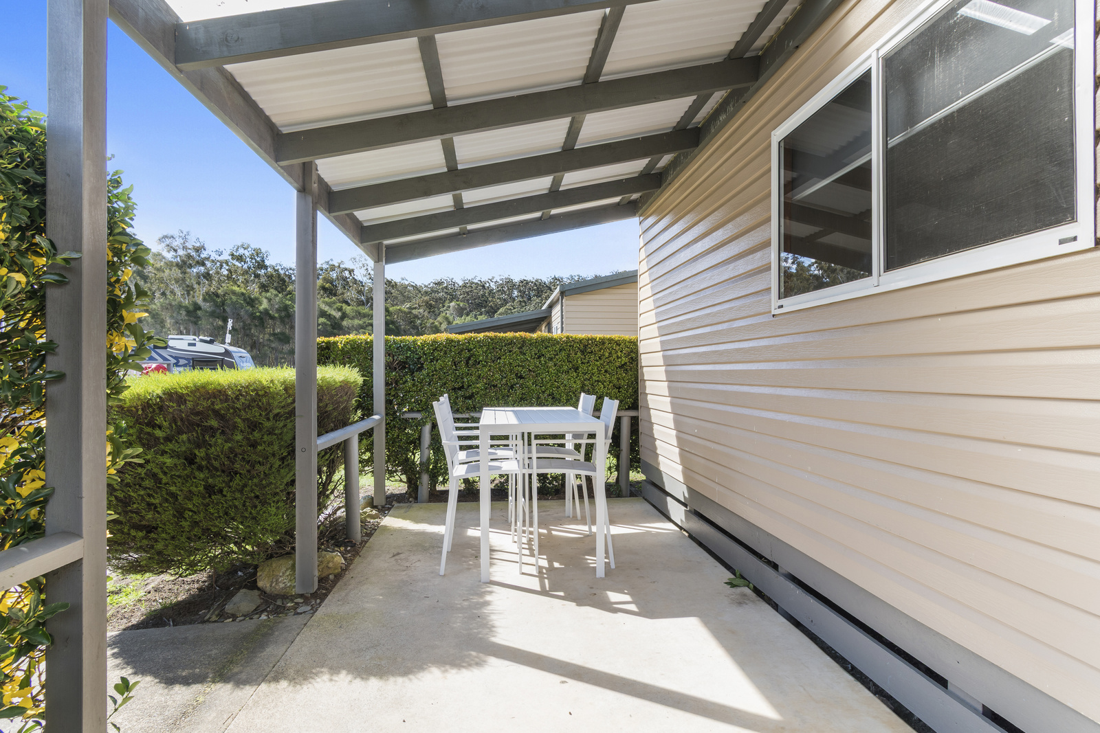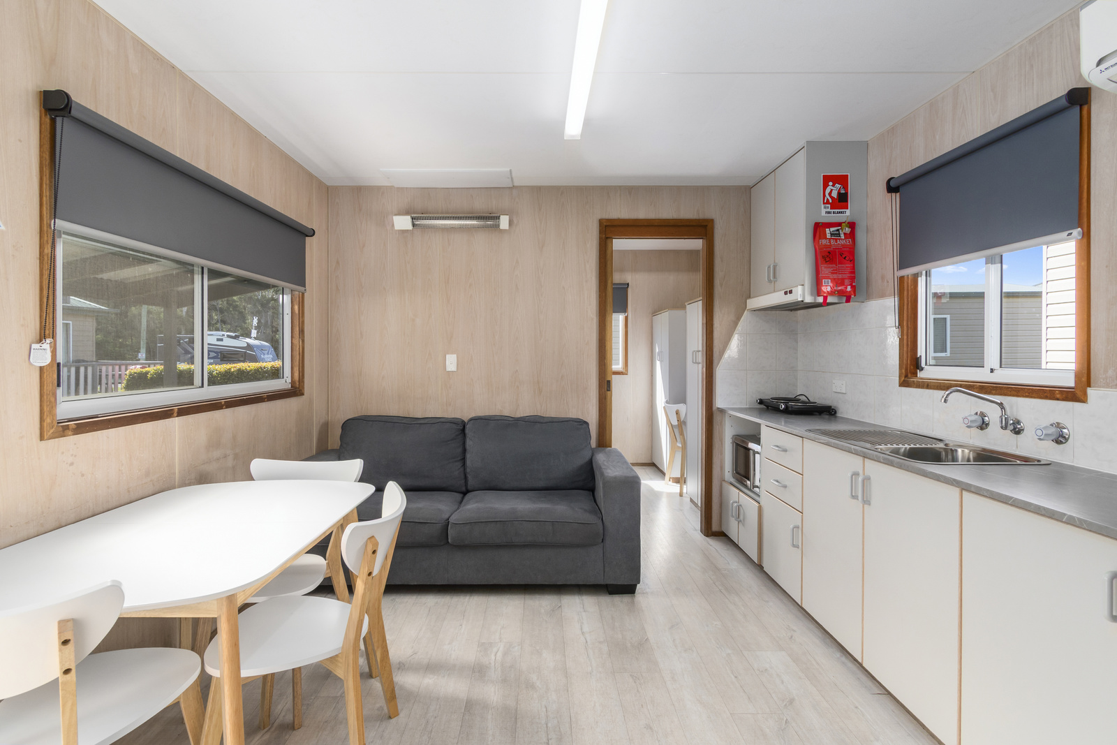 Our 2 Bedroom Standard Cabins sleep up to five guests with a double bed in the main bedroom and a single bunk above a double bed in the second bedroom, as well as a bathroom, living area, kitchenette, and undercover outdoor patio.