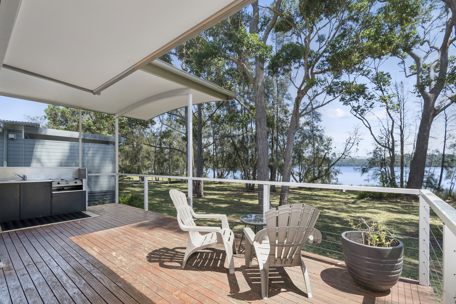 Our Lakefront Apartments sleep up to six guests with a king bed in the main bedroom and two bunks in the second bedroom, as well as a large bathroom, living area, kitchen, laundry facilities and private deck with BBQ offering lovely views of the surrounding bush setting and lake.