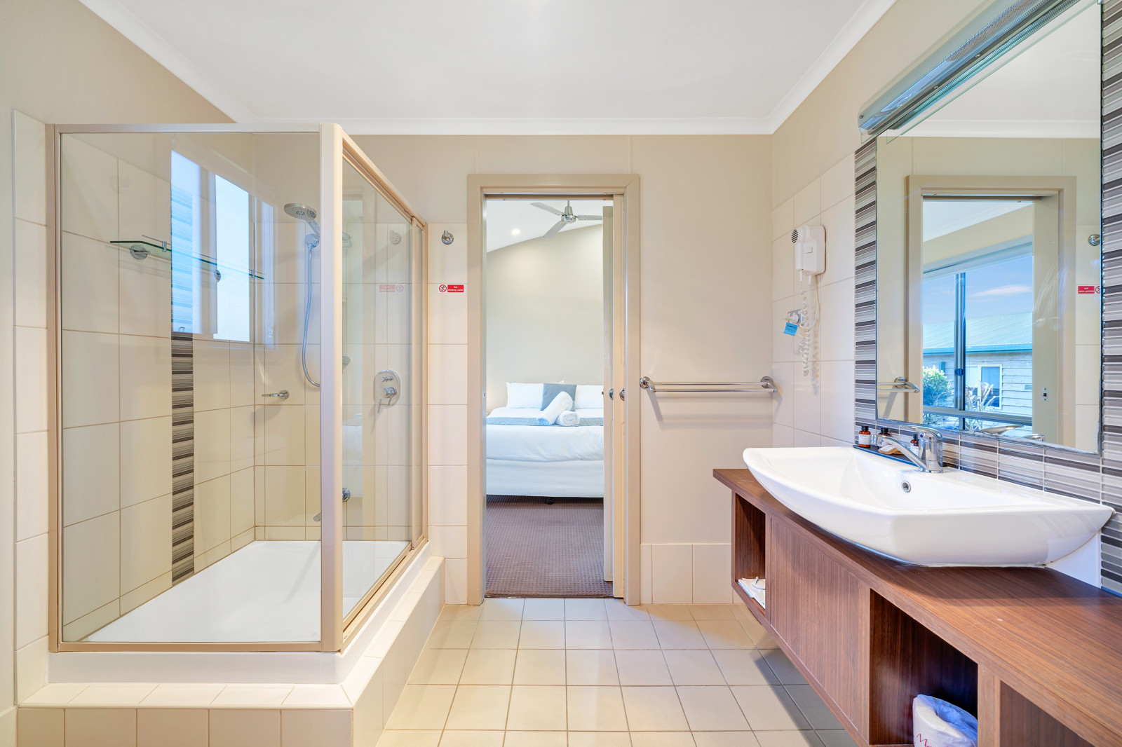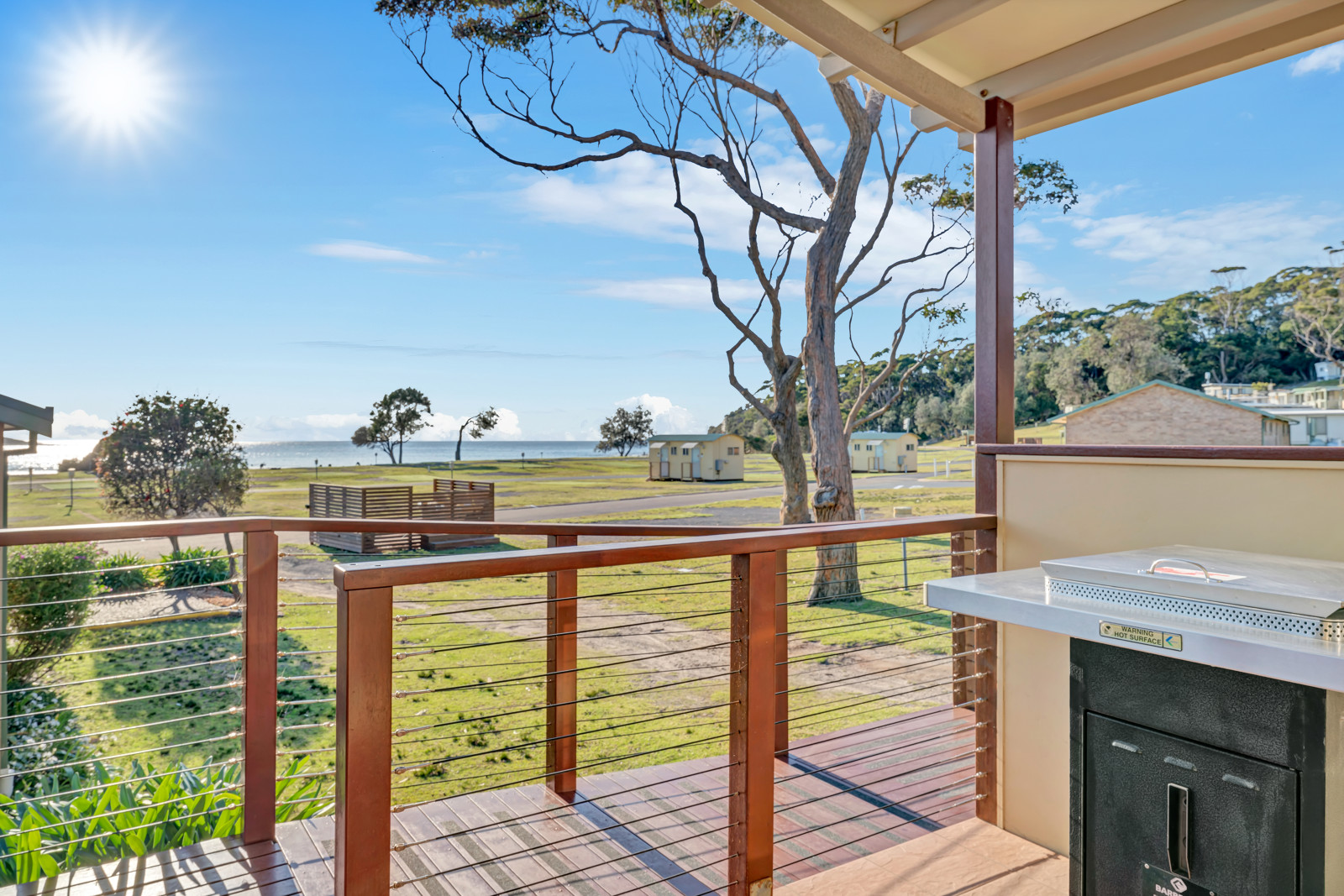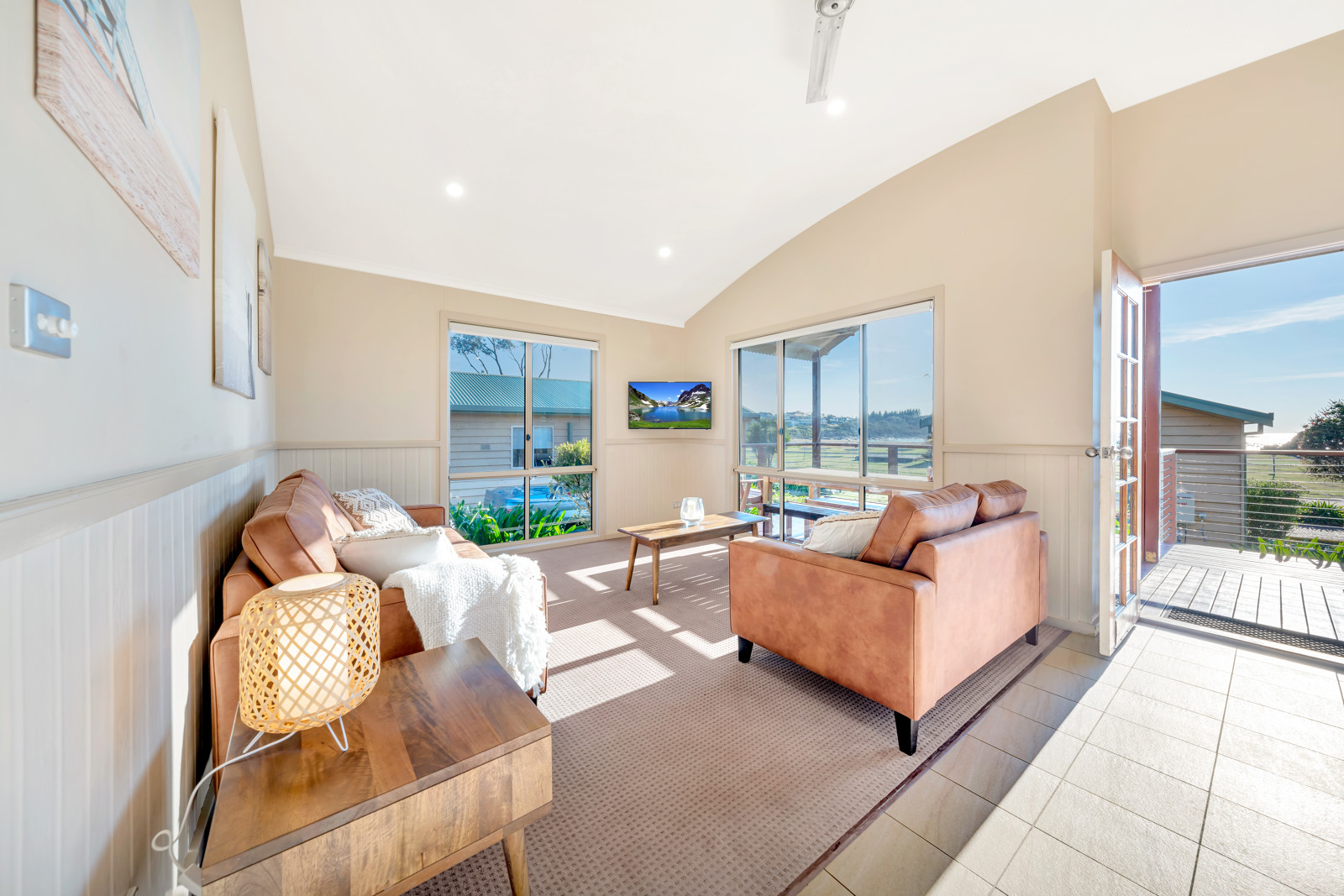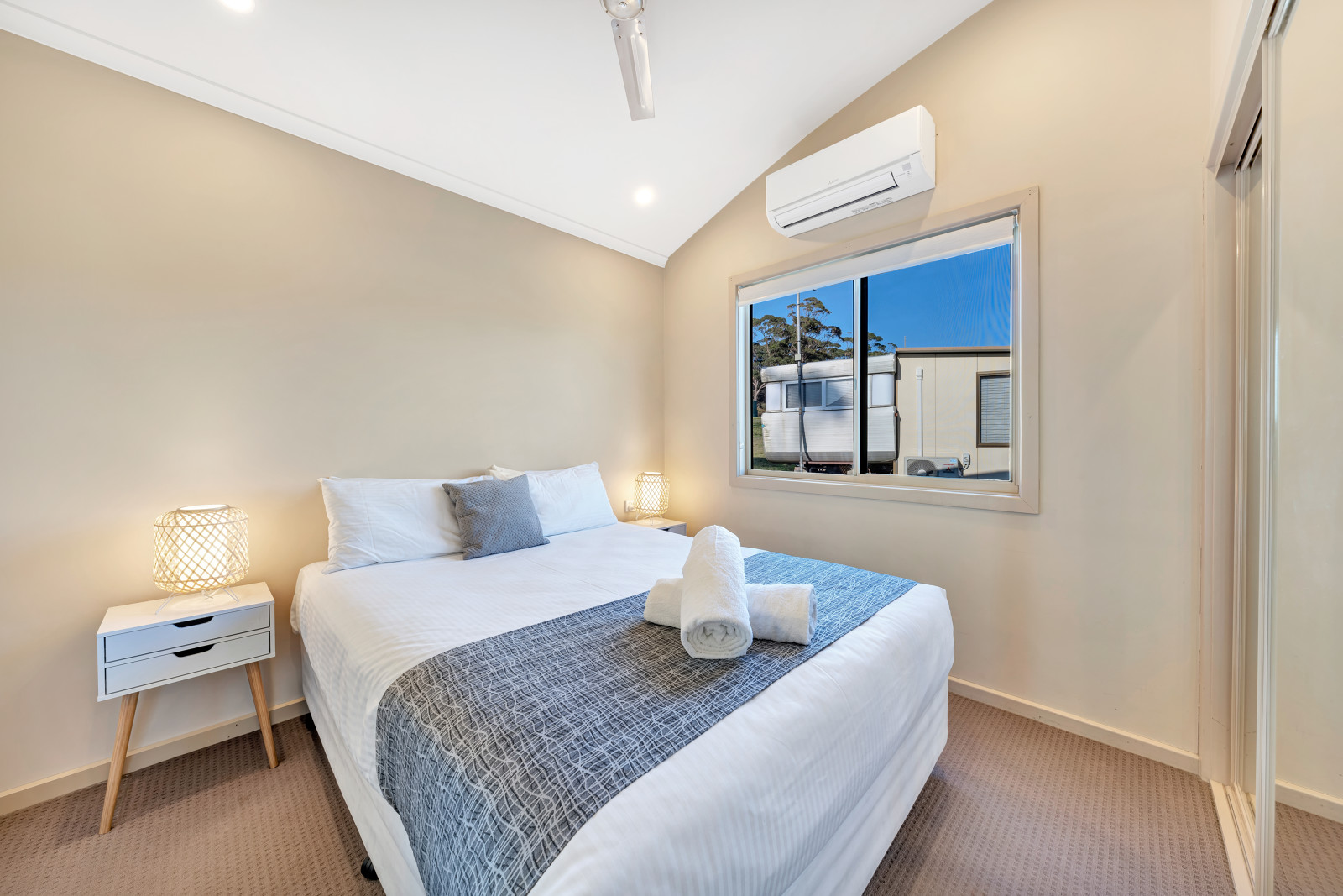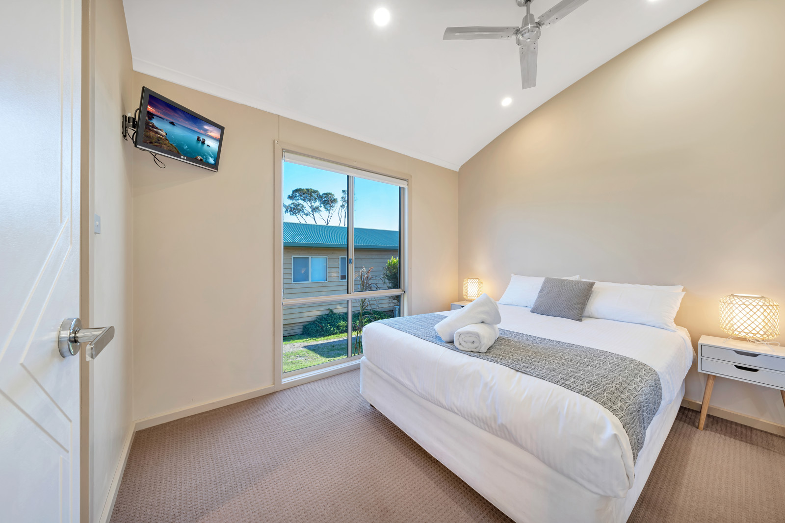 Stay in comfort and luxury, close to the beach. Our Haven Villa sleeps up to eight guests (maximum six adults) with a queen bed and ensuite in the first bedroom, a queen bed and shared ensuite in the second bedroom and two bunks in the third bedroom. Also features a kitchen, living area, and private deck with BBQ.