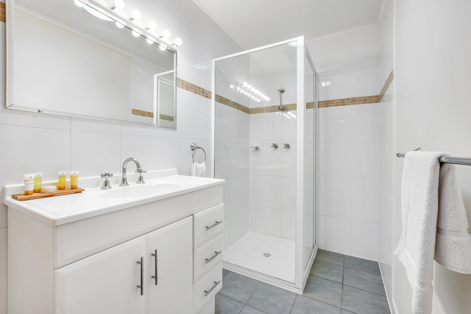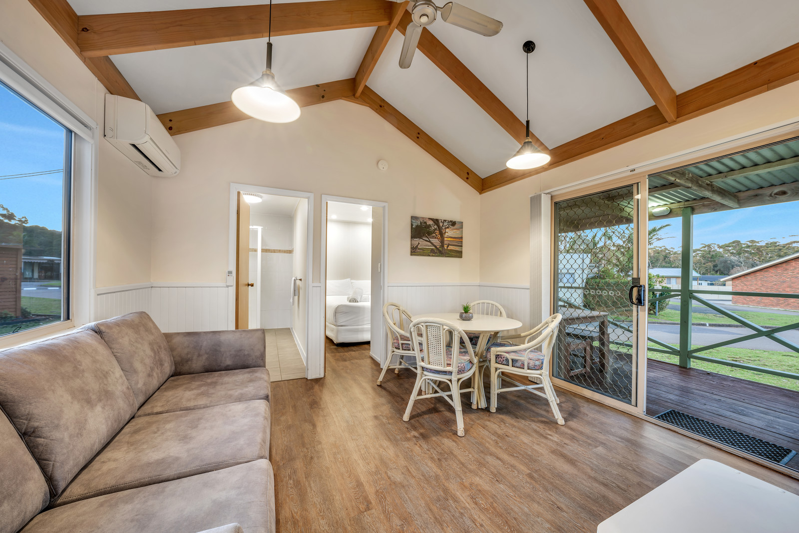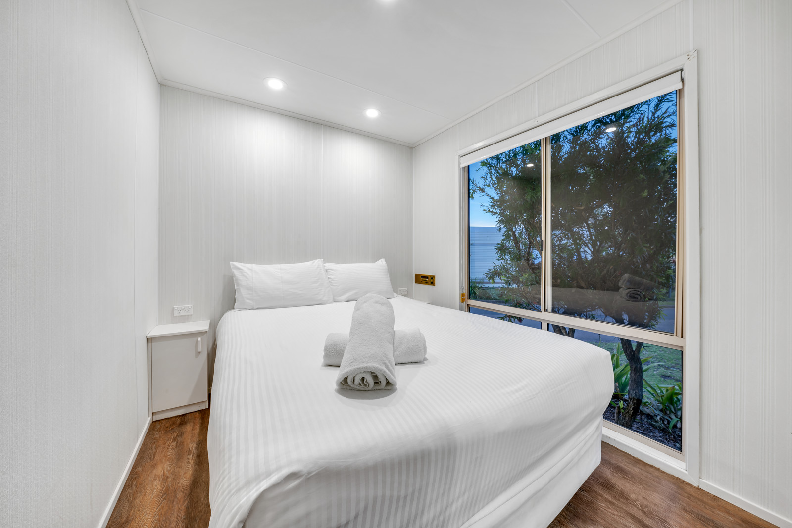 Enjoy poolside comfort near the beach during your stay. Our Budget Poolside Cabins sleep up to five guests (maximum 3 adults) with a queen bed in the main bedroom and a bunk and single bed in the second bedroom, as well as a bathroom, kitchen, living area, and private deck.