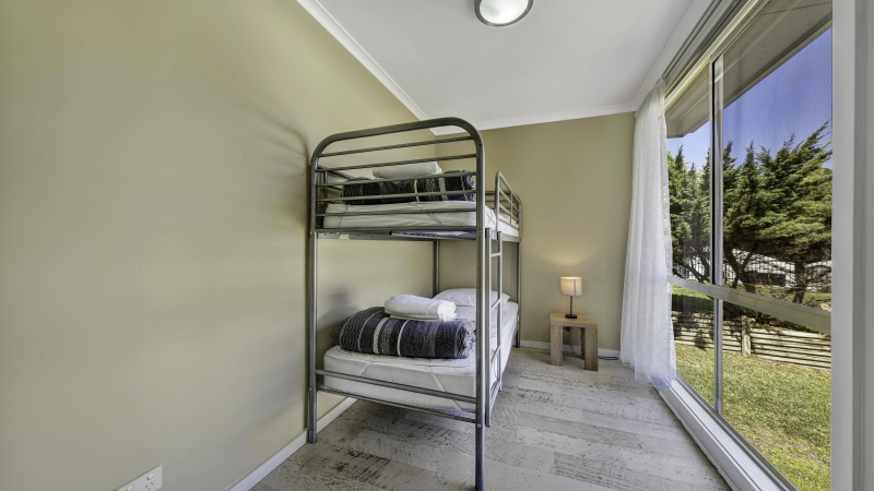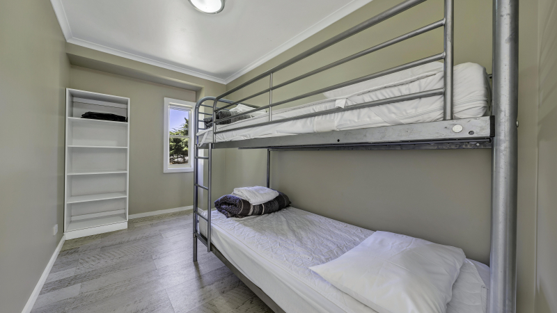 Our 3 Bedroom Deluxe Villa sleeps up to six guests with a queen bed in the main bedroom plus a bunk in the second and third bedroom, as well as two bathrooms, living area, kitchen, and private deck.