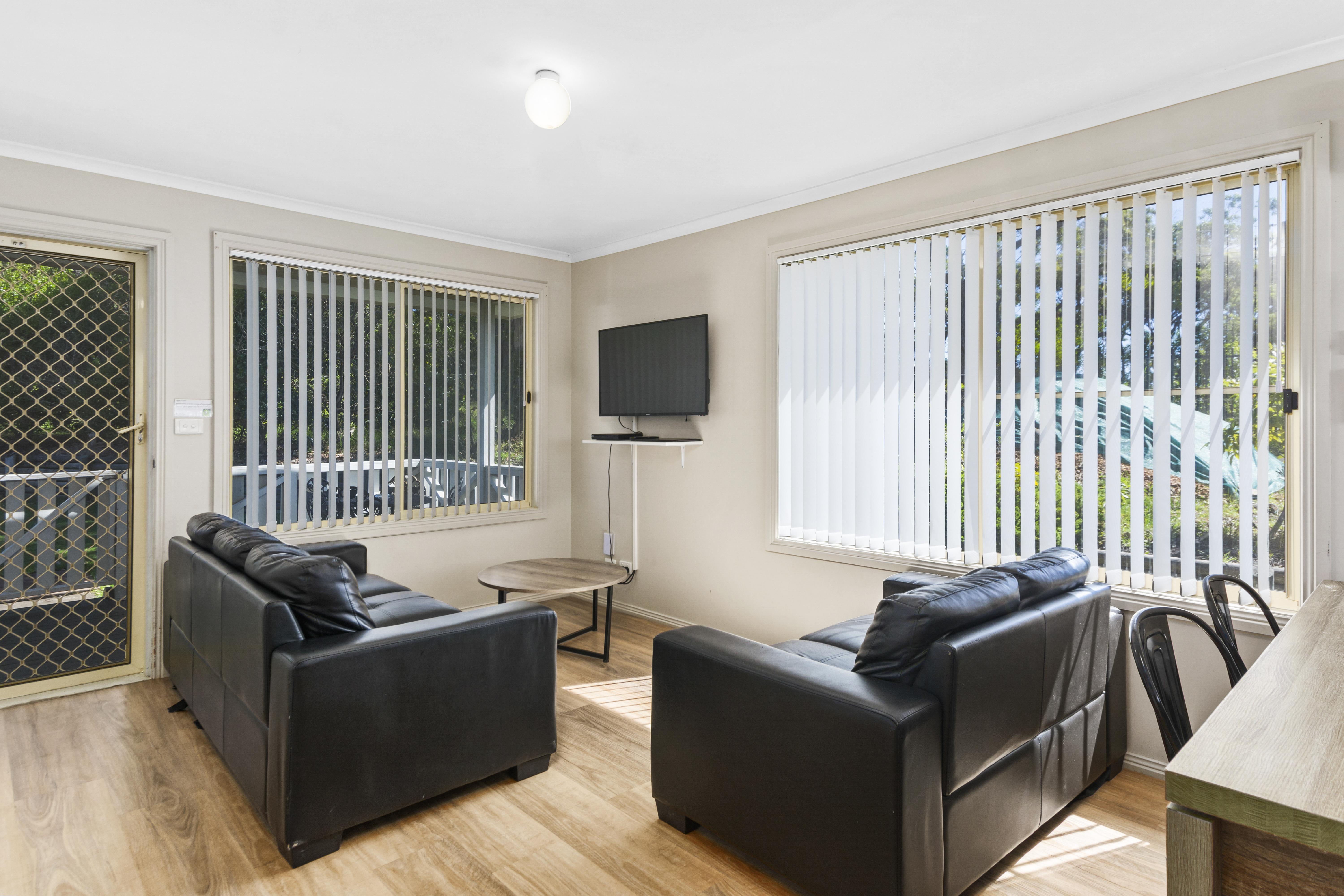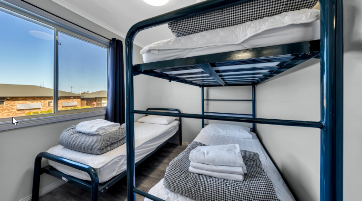 Our Deluxe Cottage sleeps up to five guests with a queen bed in the main bedroom and a bunk plus single bed in the second bedroom, as well as a bathroom, living area, kitchen, and private deck.