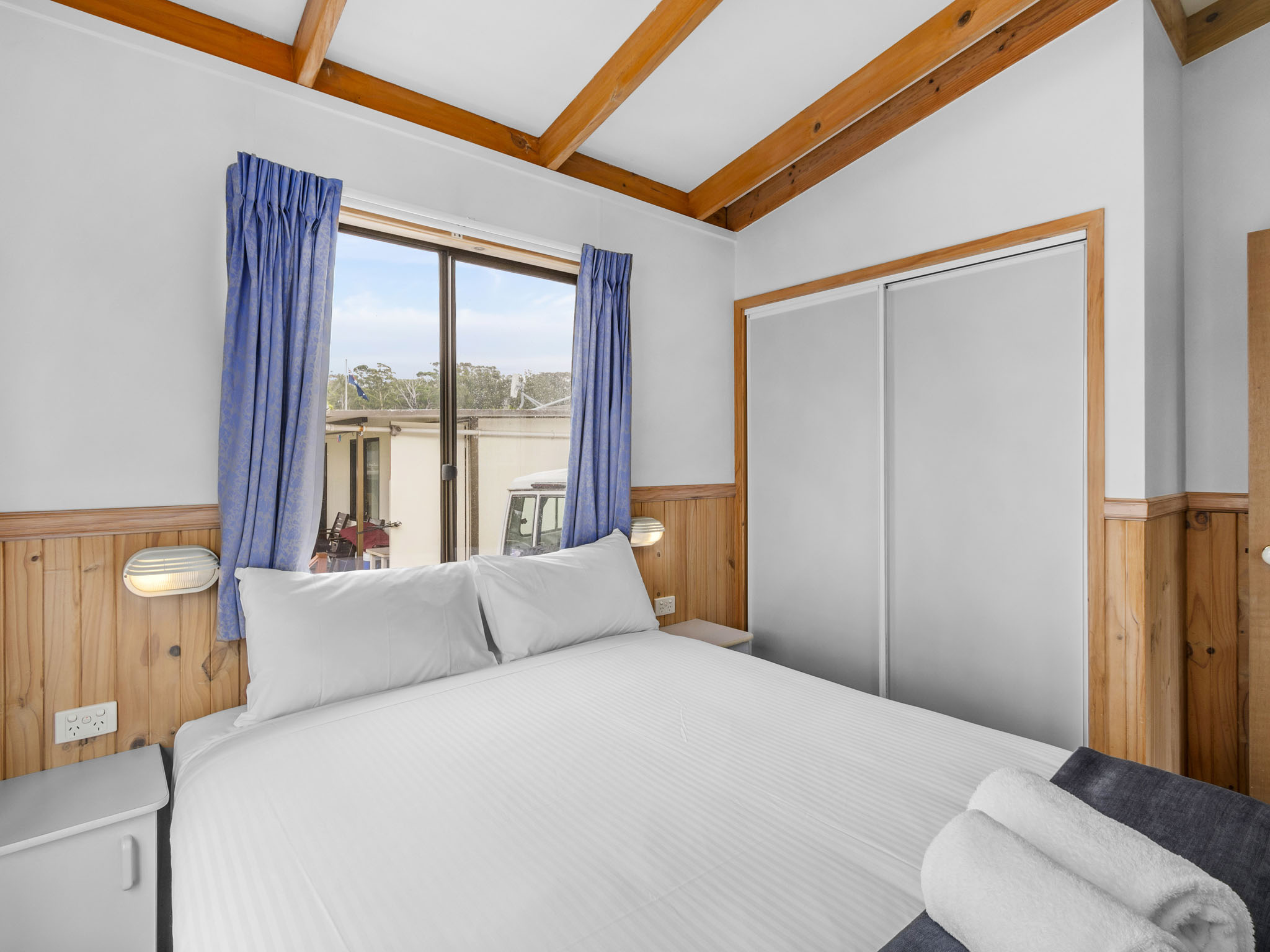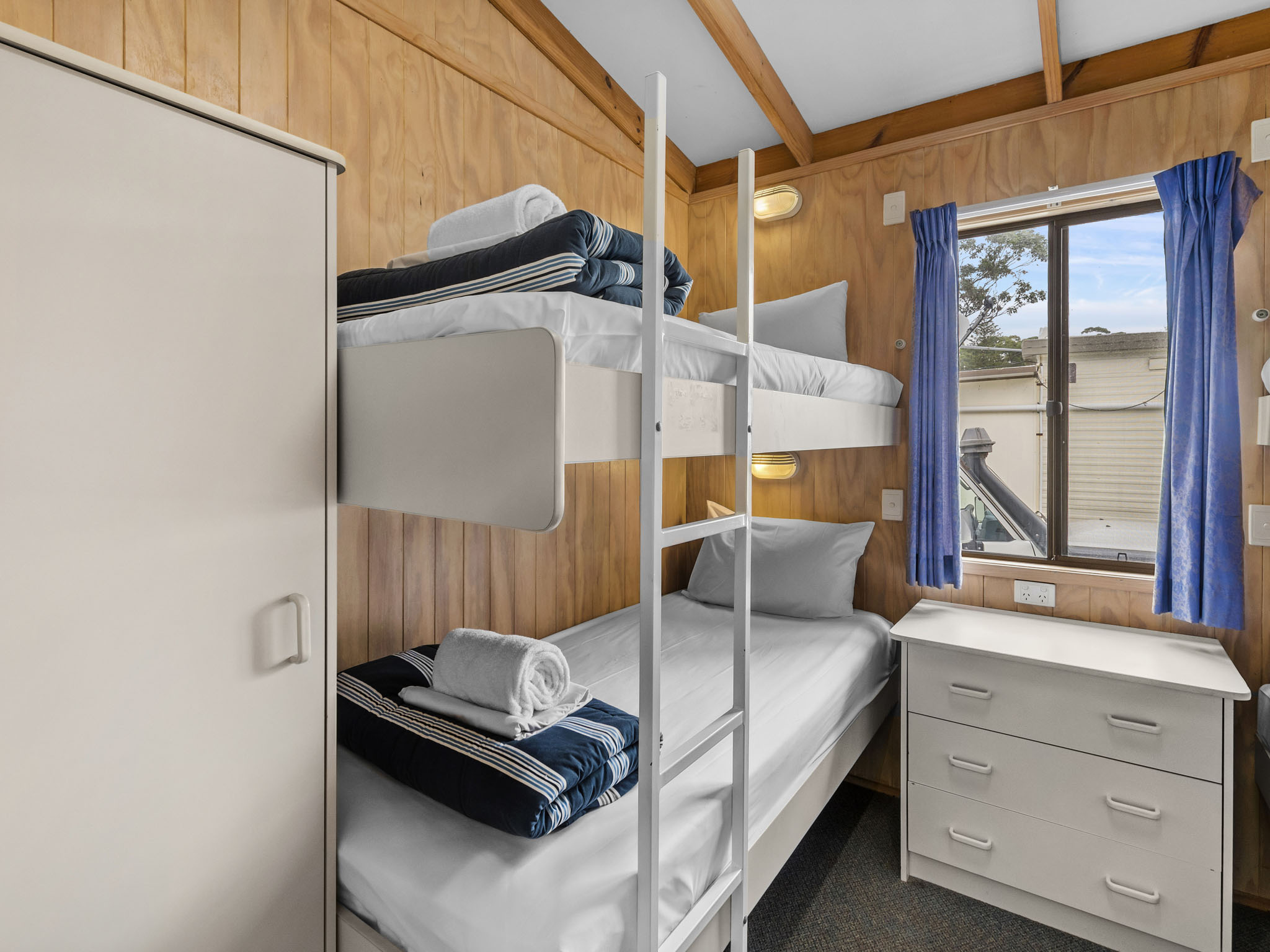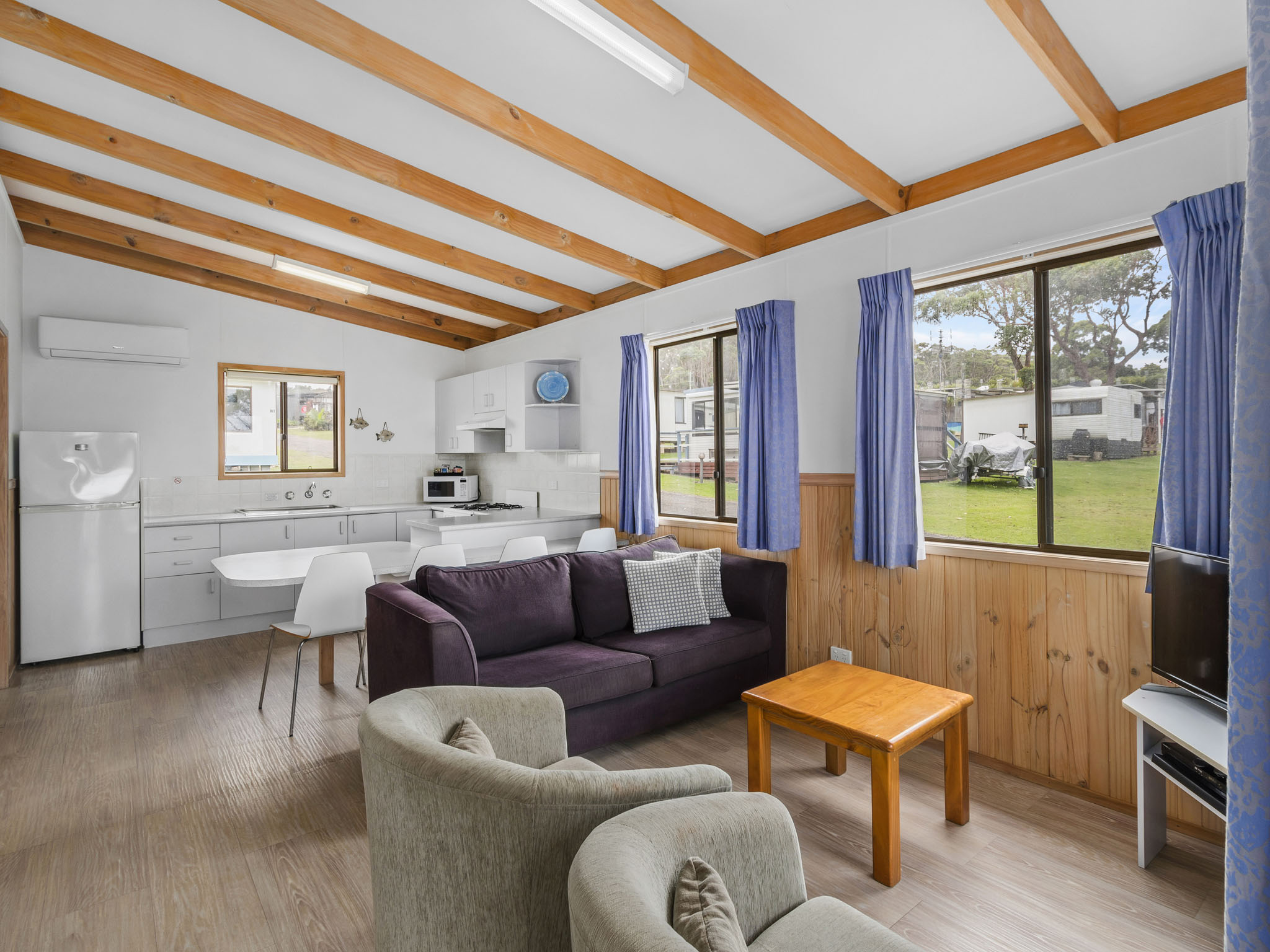 Ideal for families, this two-bedroom cabin sleeps up to six guests with a double bed and two single bunk sets. The full kitchen includes a gas cooktop, oven, microwave, and fridge. With air conditioning and an outdoor area with wood BBQ and seating, it’s a great option for relaxed stays near the lake.
