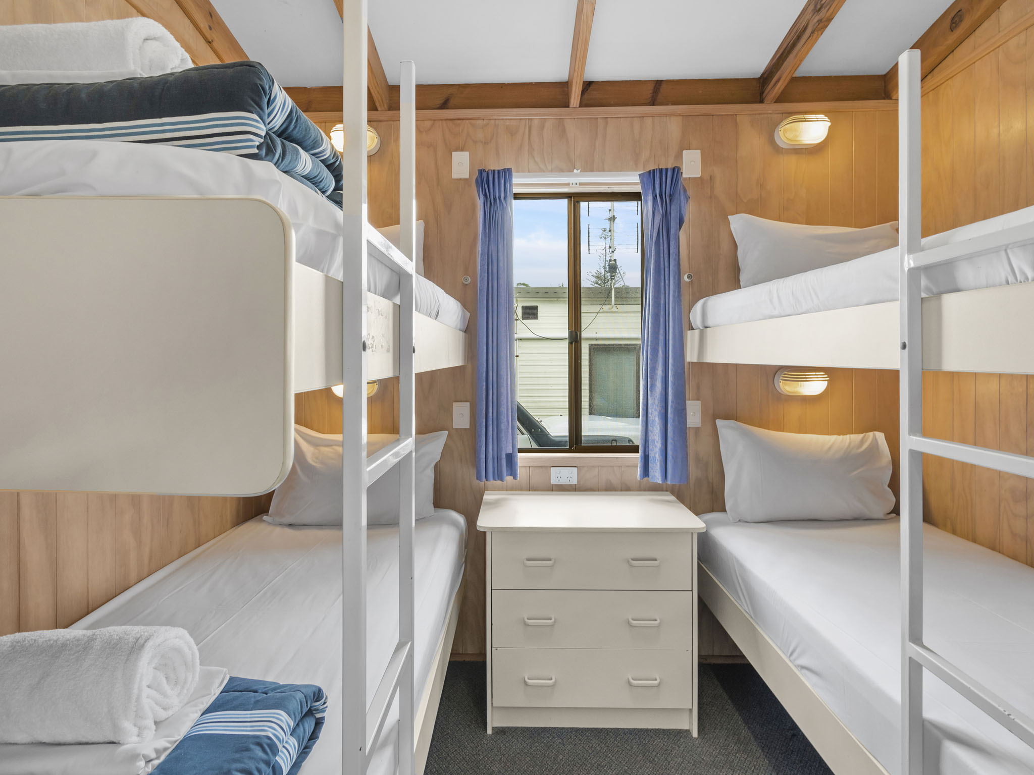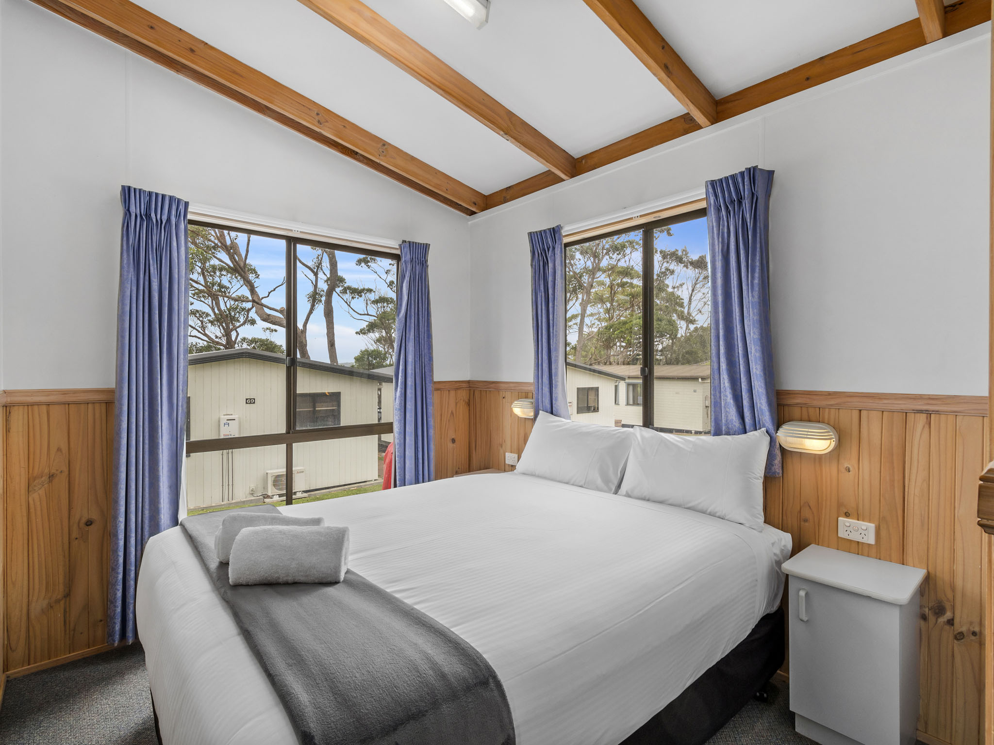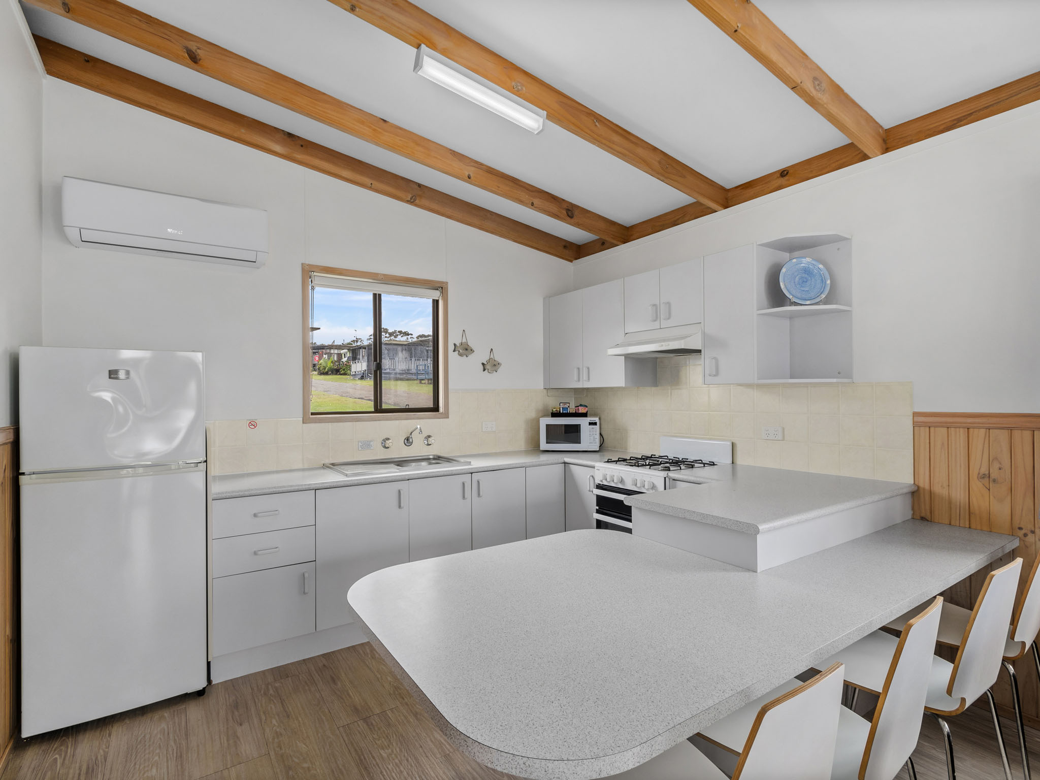 Ideal for families, this two-bedroom cabin sleeps up to six guests with a double bed and two single bunk sets. The full kitchen includes a gas cooktop, oven, microwave, and fridge. With air conditioning and an outdoor area with wood BBQ and seating, it’s a great option for relaxed stays near the lake.
