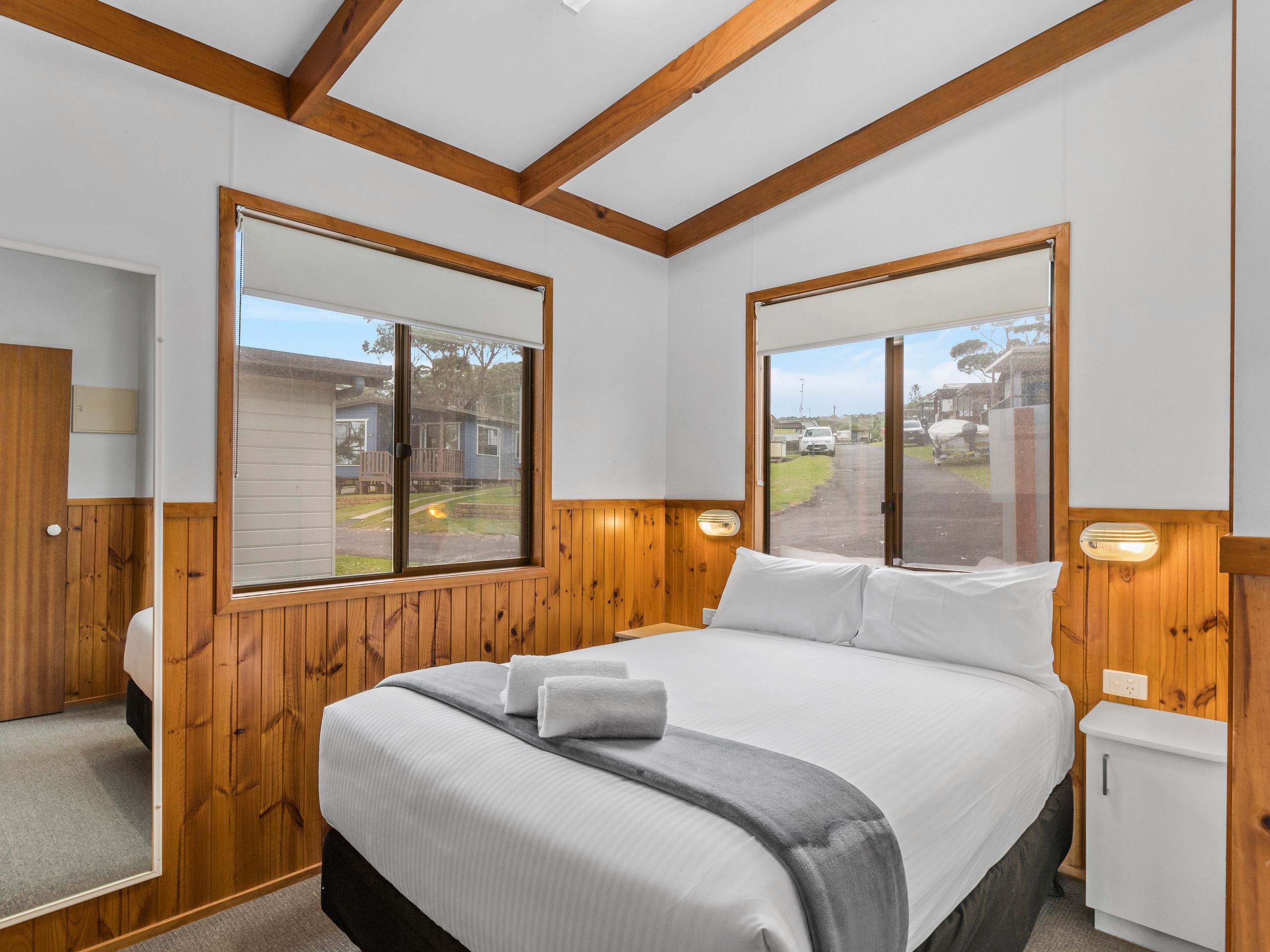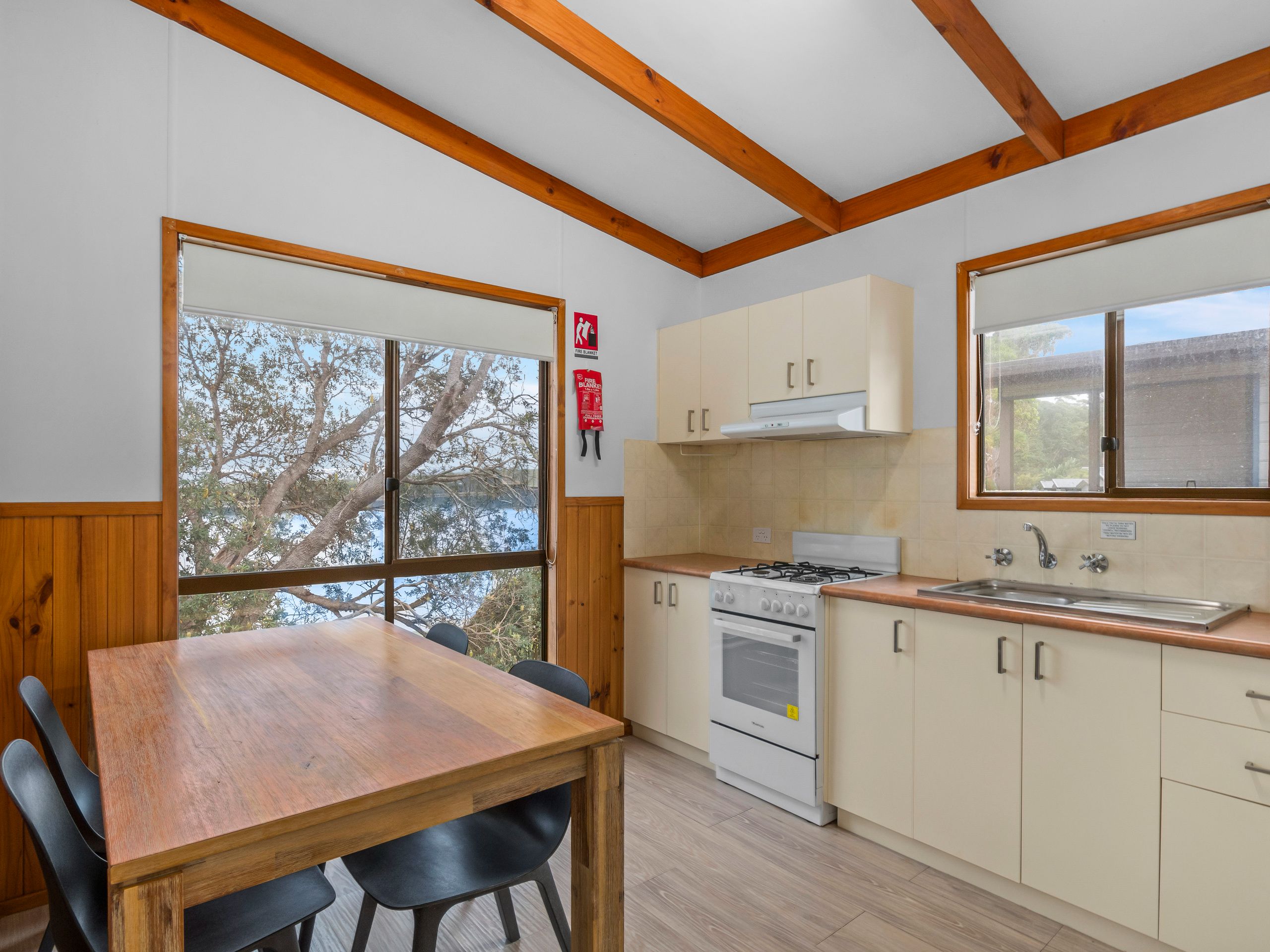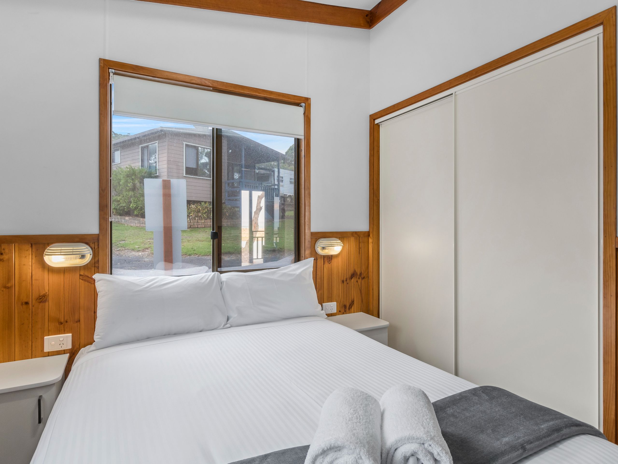 Comfortably accommodating five guests, this two-bedroom cabin features a double bed and a bunk with double base and single top. A full kitchen and dining area offer easy meal prep, while air conditioning and an outdoor area with wood BBQ and seating ensure comfort throughout your stay.