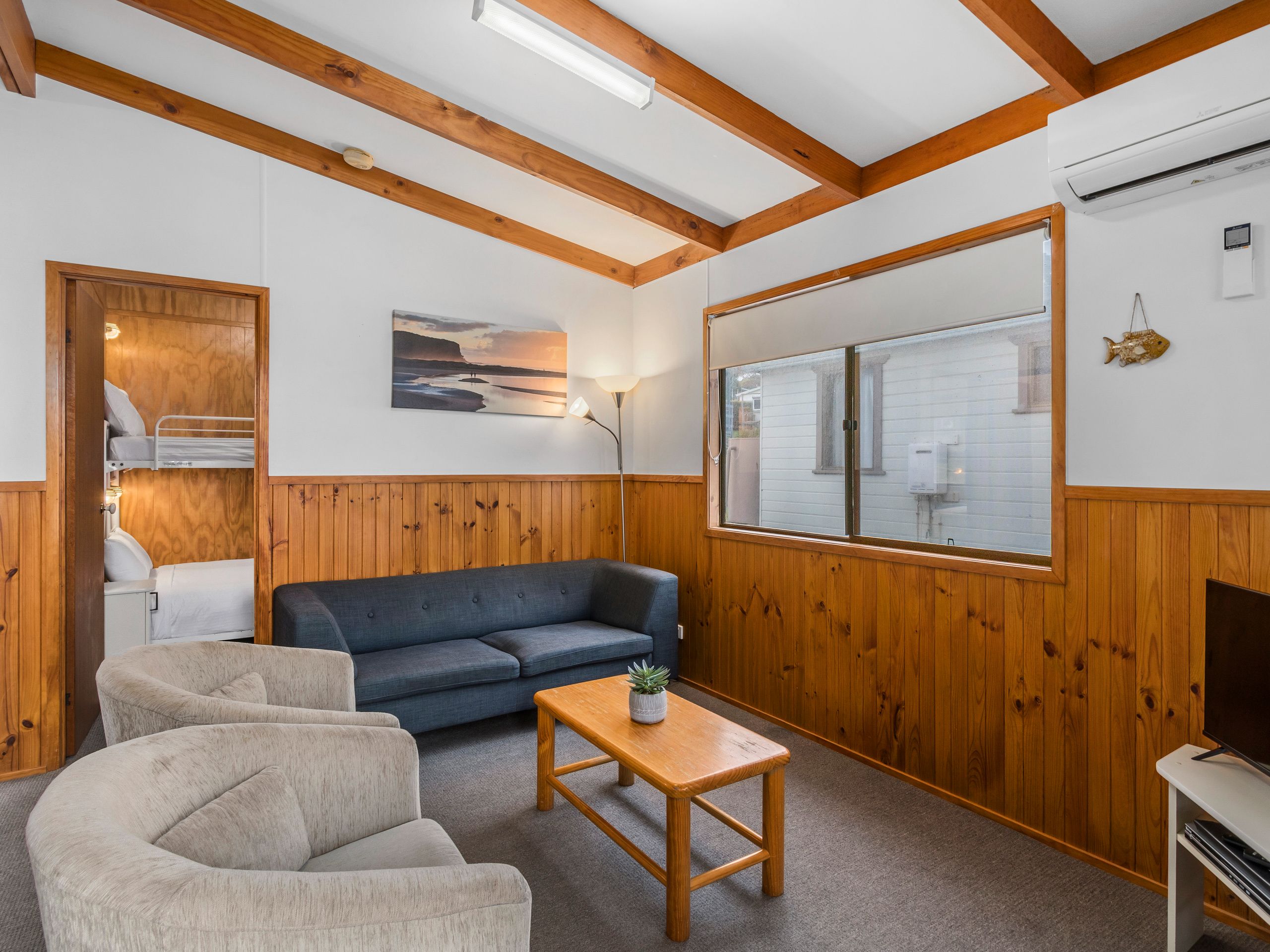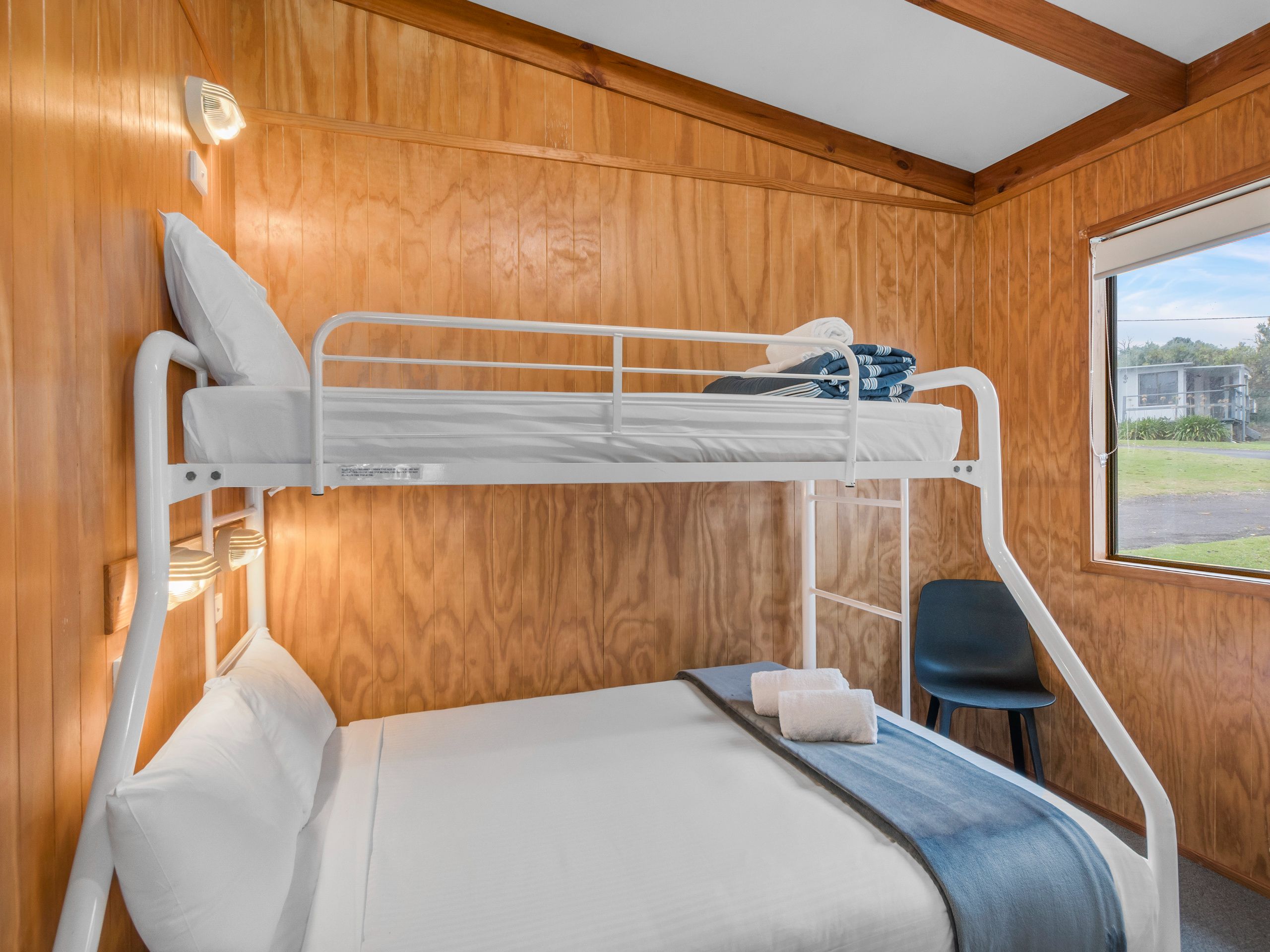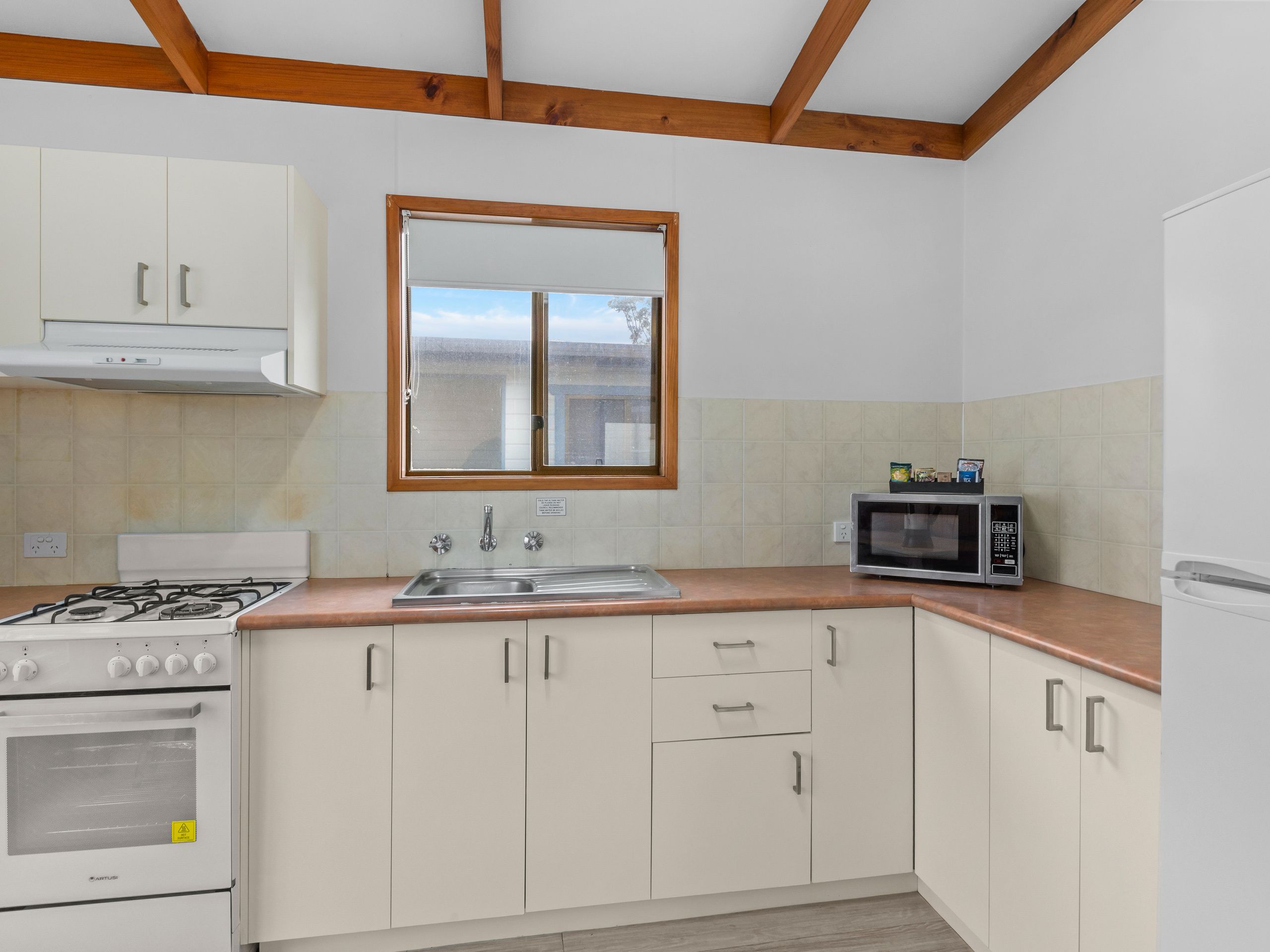 Comfortably accommodating five guests, this two-bedroom cabin features a double bed and a bunk with double base and single top. A full kitchen and dining area offer easy meal prep, while air conditioning and an outdoor area with wood BBQ and seating ensure comfort throughout your stay.
