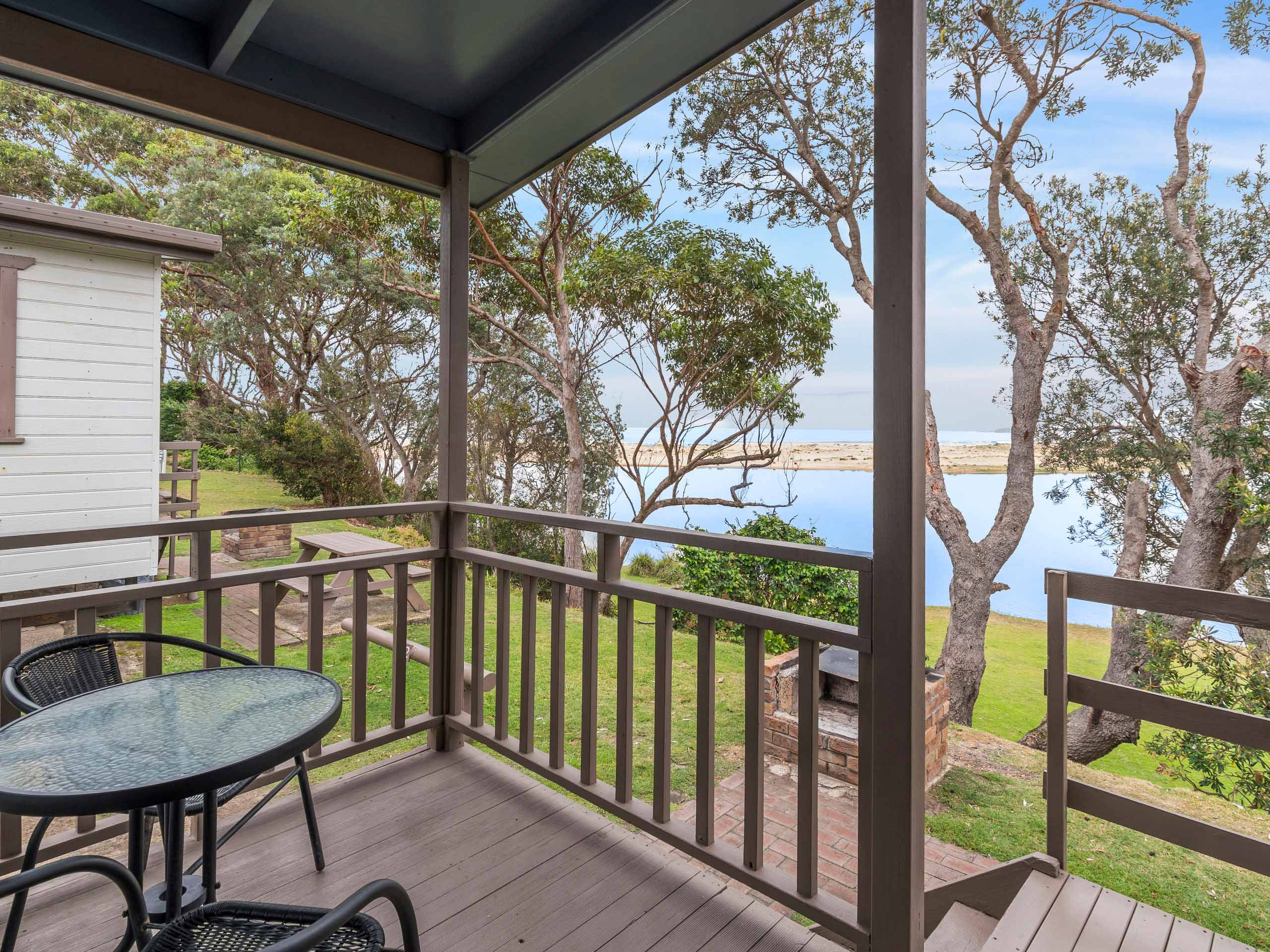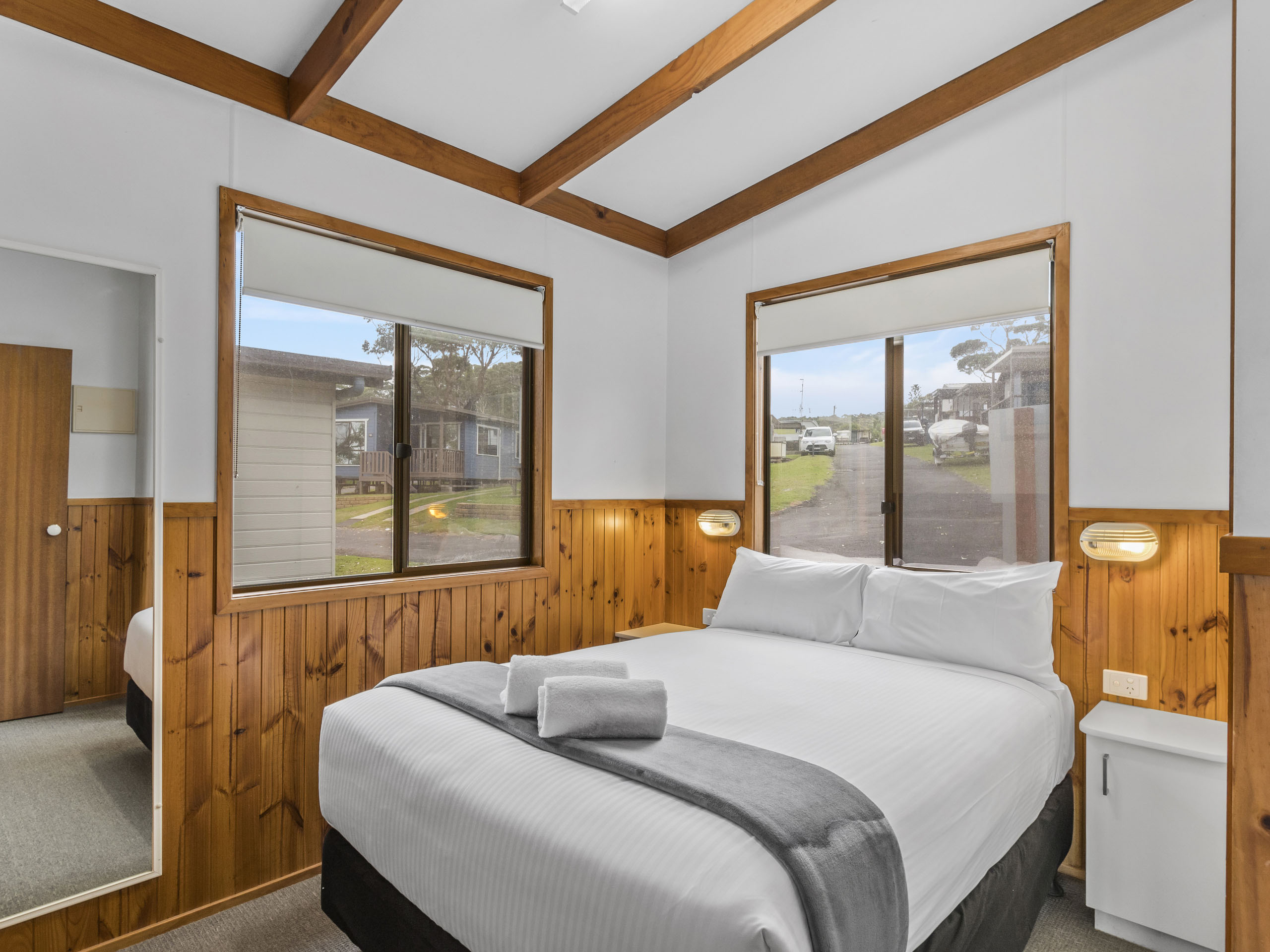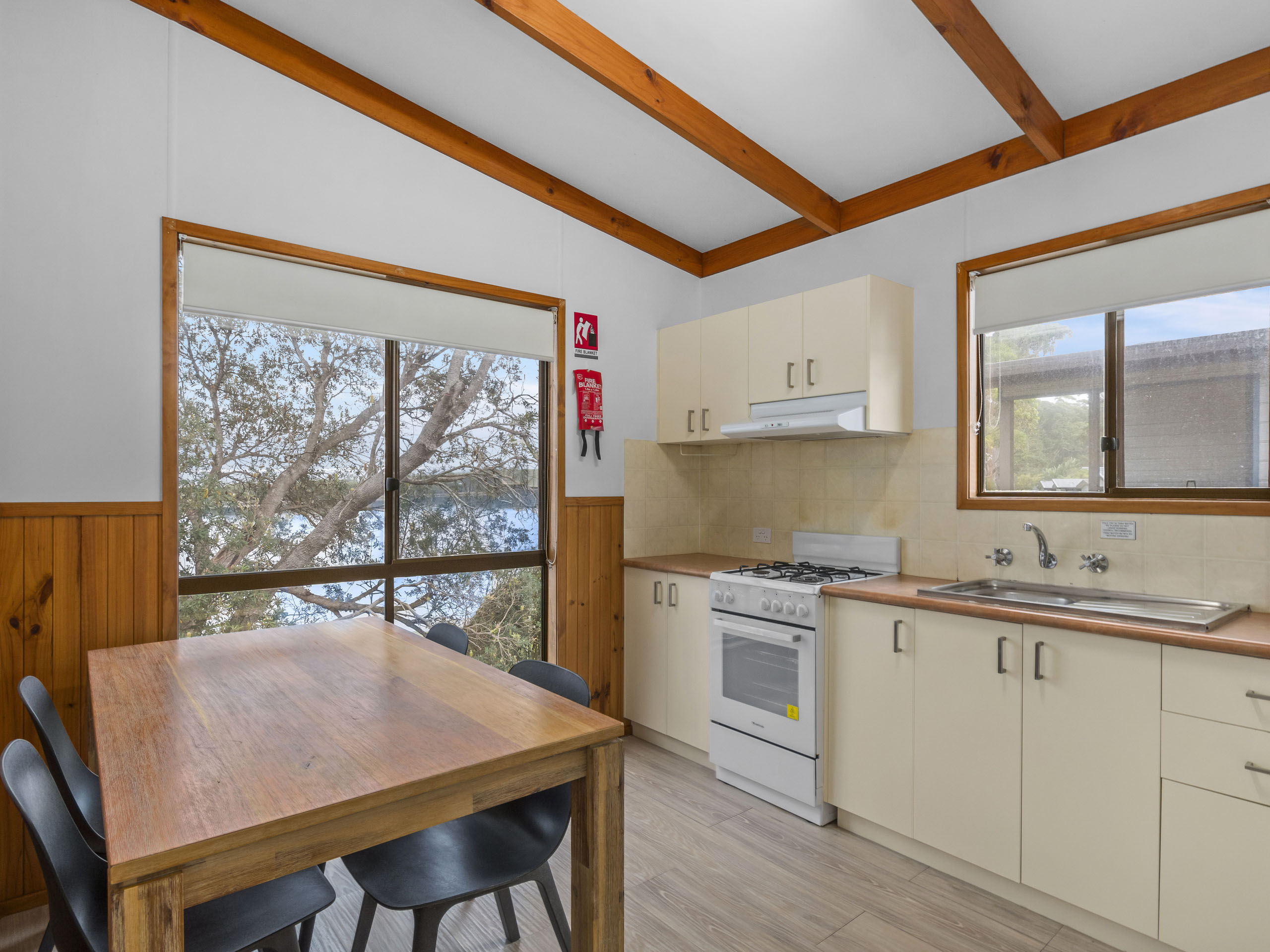 This two-bedroom waterfront cabin sleeps up to four guests across two double beds. A full kitchen and dining area offer everything you need for self-catering. Enjoy air conditioning, indoor lounge space, a verandah perfect for taking in the views and your own private wood fireplace.