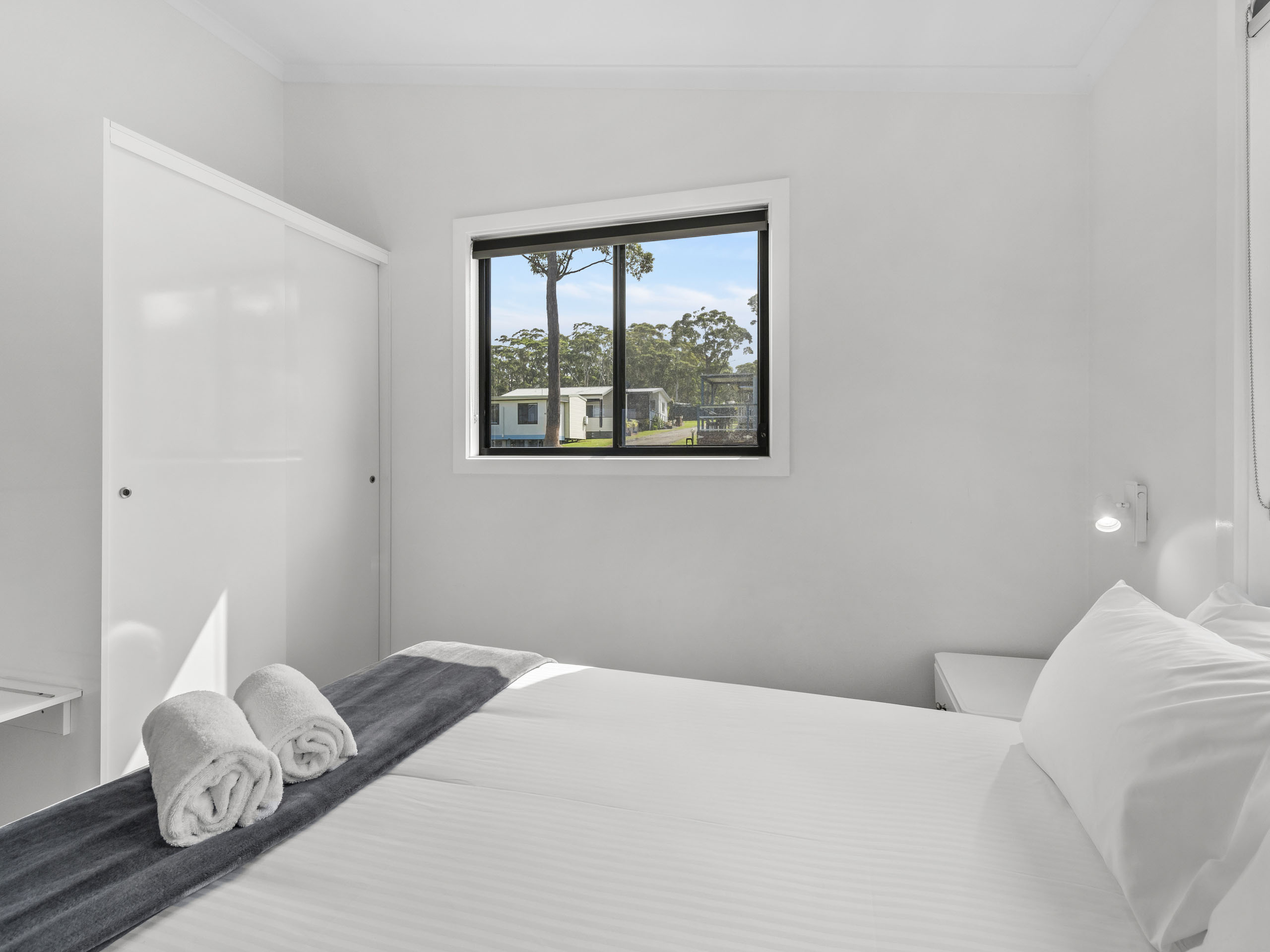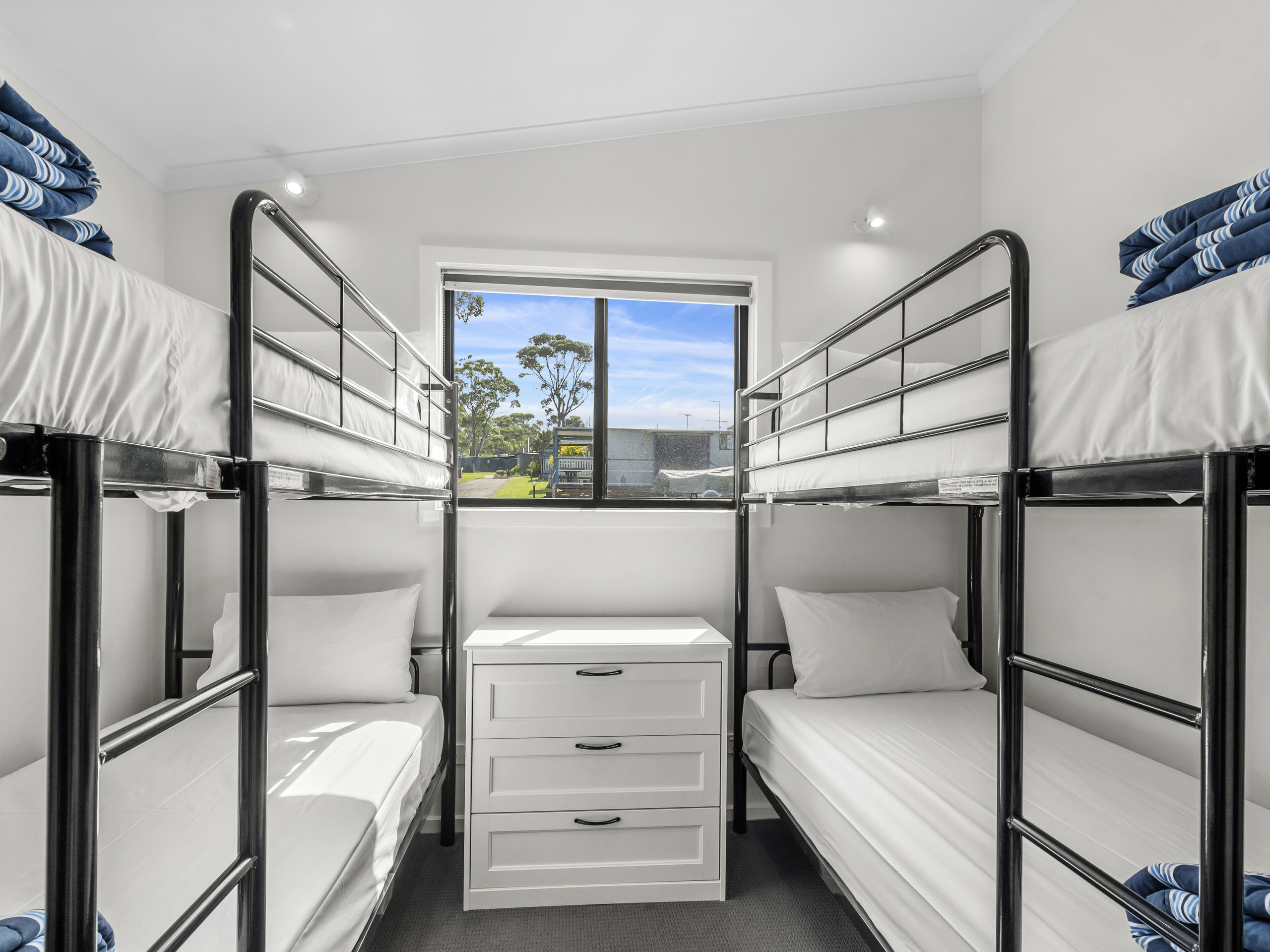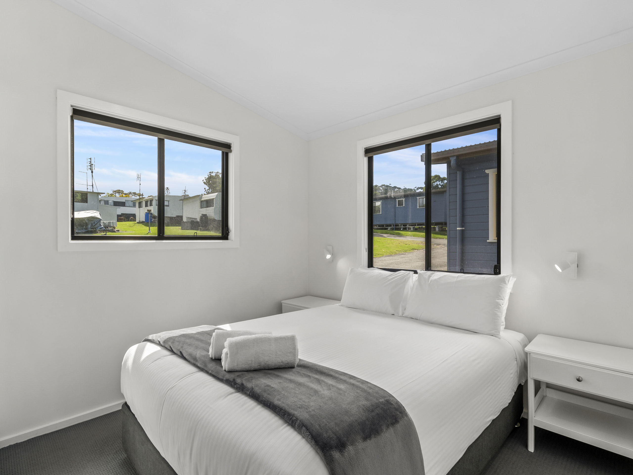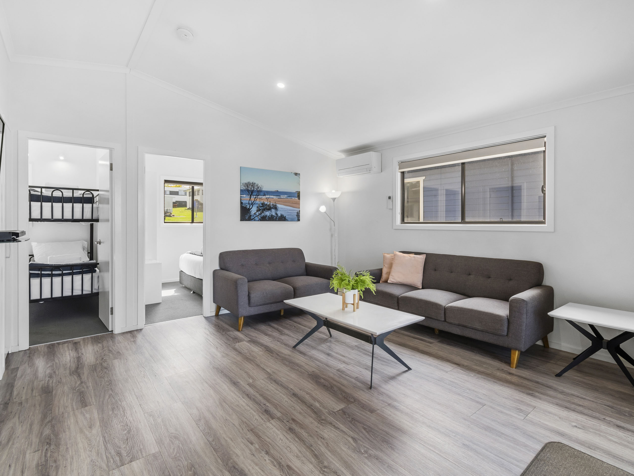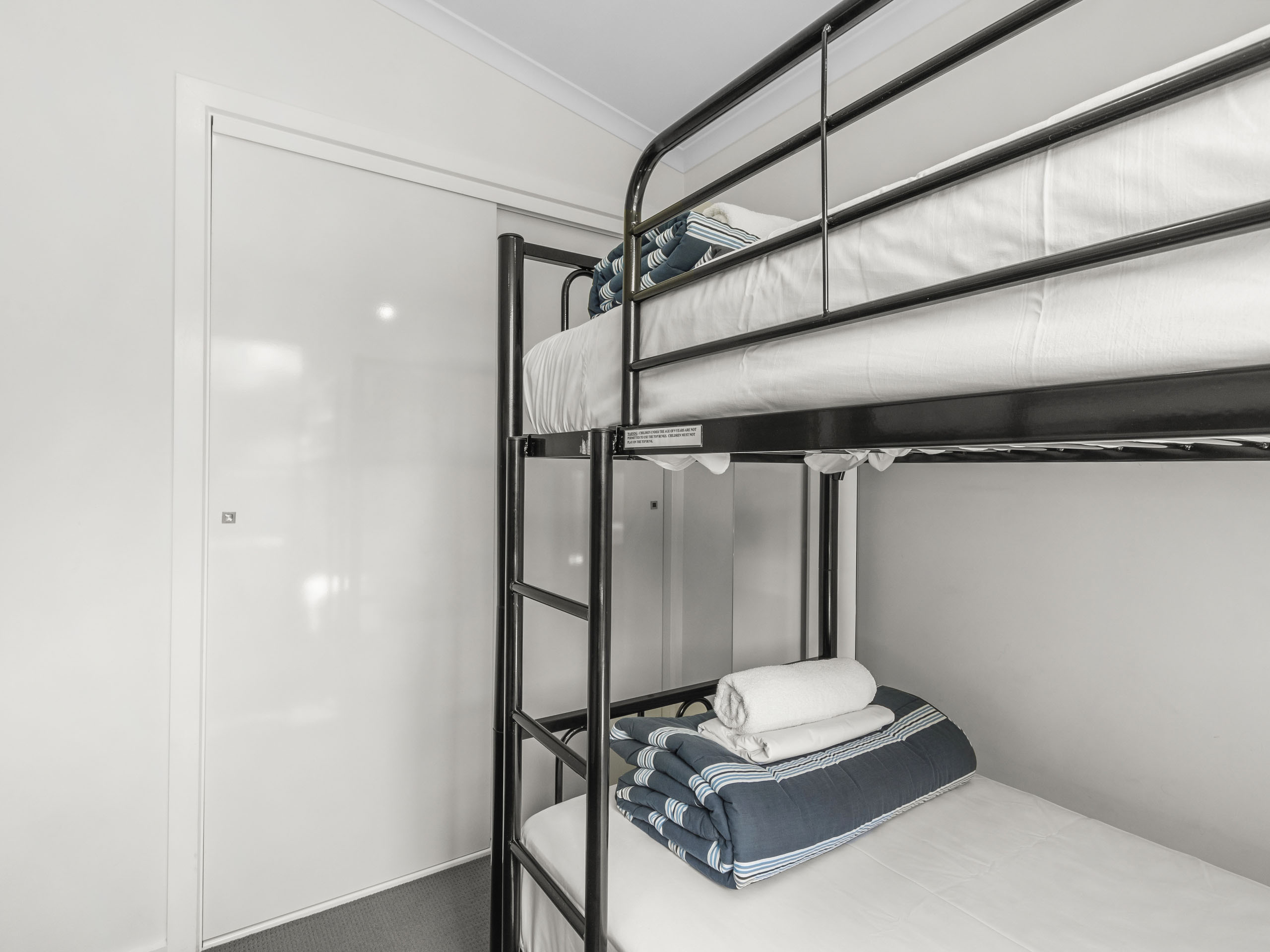 Enjoy elevated comfort just steps from the lake in this self-contained cabin. Sleeping up to six guests across two bedrooms with a queen bed and two bunk sets, it’s ideal for families. The full kitchen includes a gas cooktop, electric oven, dishwasher, coffee machine, and full fridge. Relax in air-conditioned comfort or unwind on the verandah with outdoor seating, gas BBQ and private fireplace.