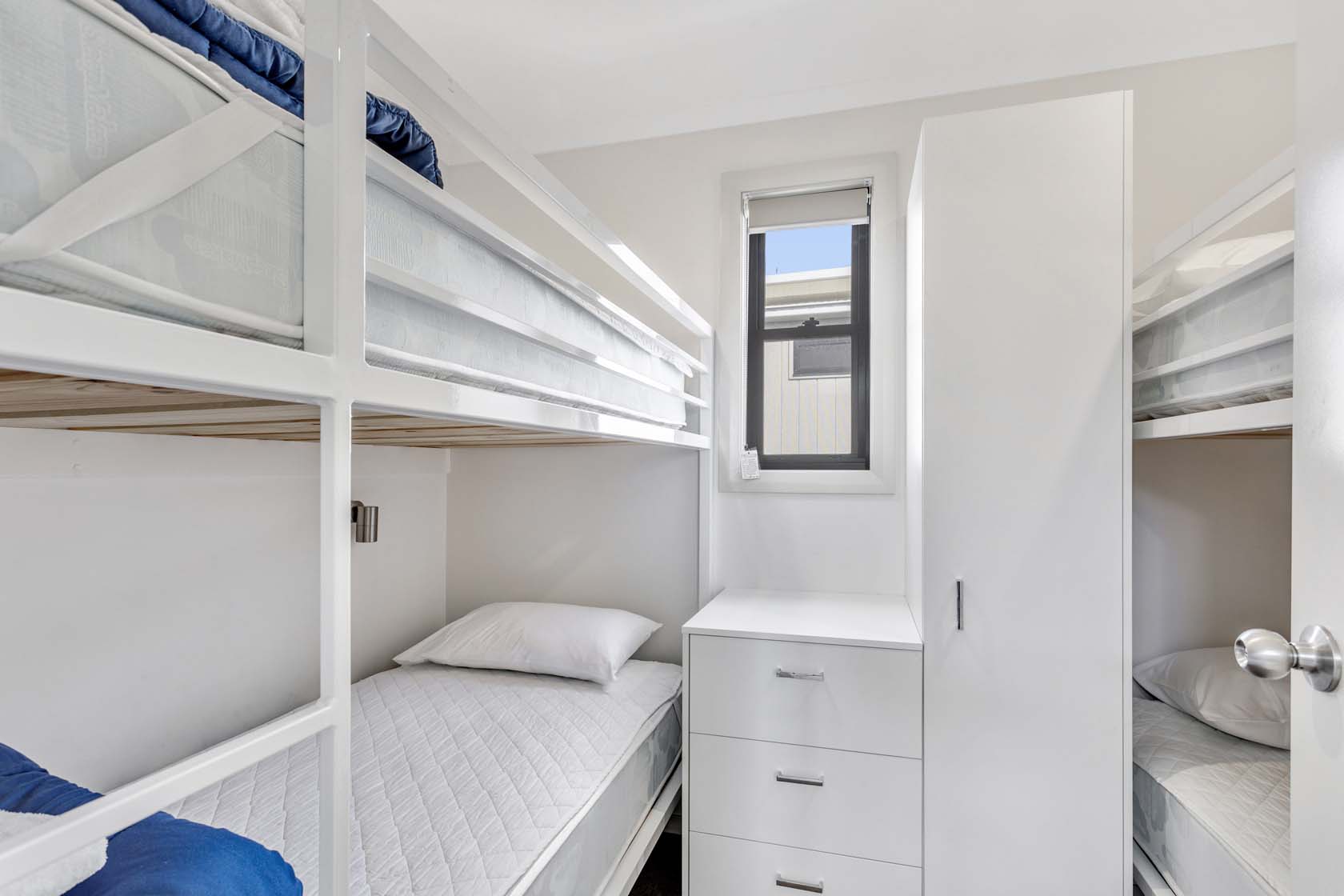 Enjoy panoramic views from the private deck, complete with BBQ and outdoor setting. Inside, find two bathrooms, a spacious living area, and a full kitchen with gas oven, microwave, and dishwasher. Bedding includes a queen, a double, and two sets of bunks—ideal for kids. Comforts like air conditioning, ceiling fans, and TV ensure a relaxing stay.