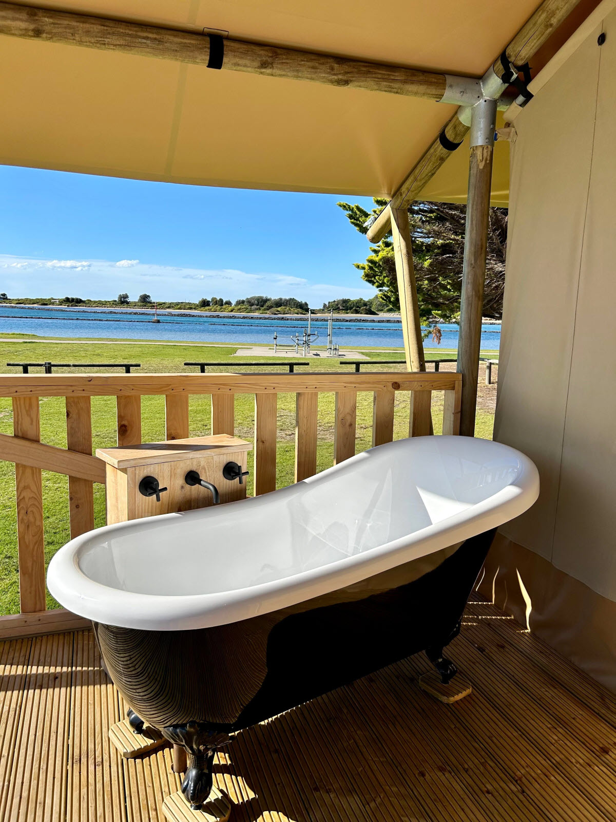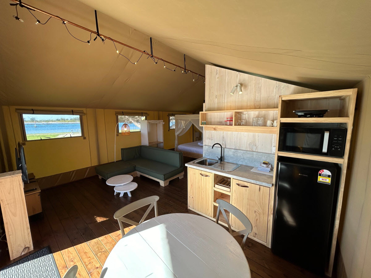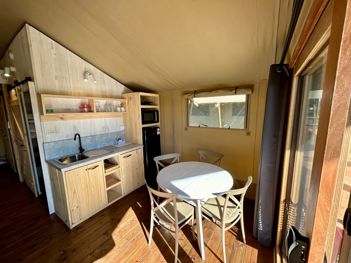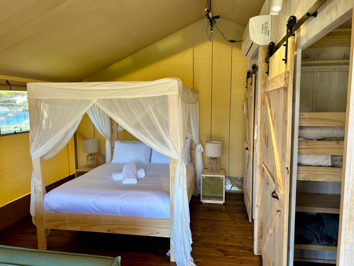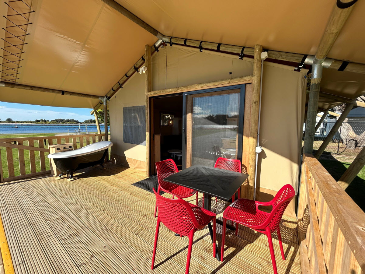 The Safari Glamping Tent offers the perfect blend of luxury and comfort, ideal for a relaxing escape with stunning waterfront views.