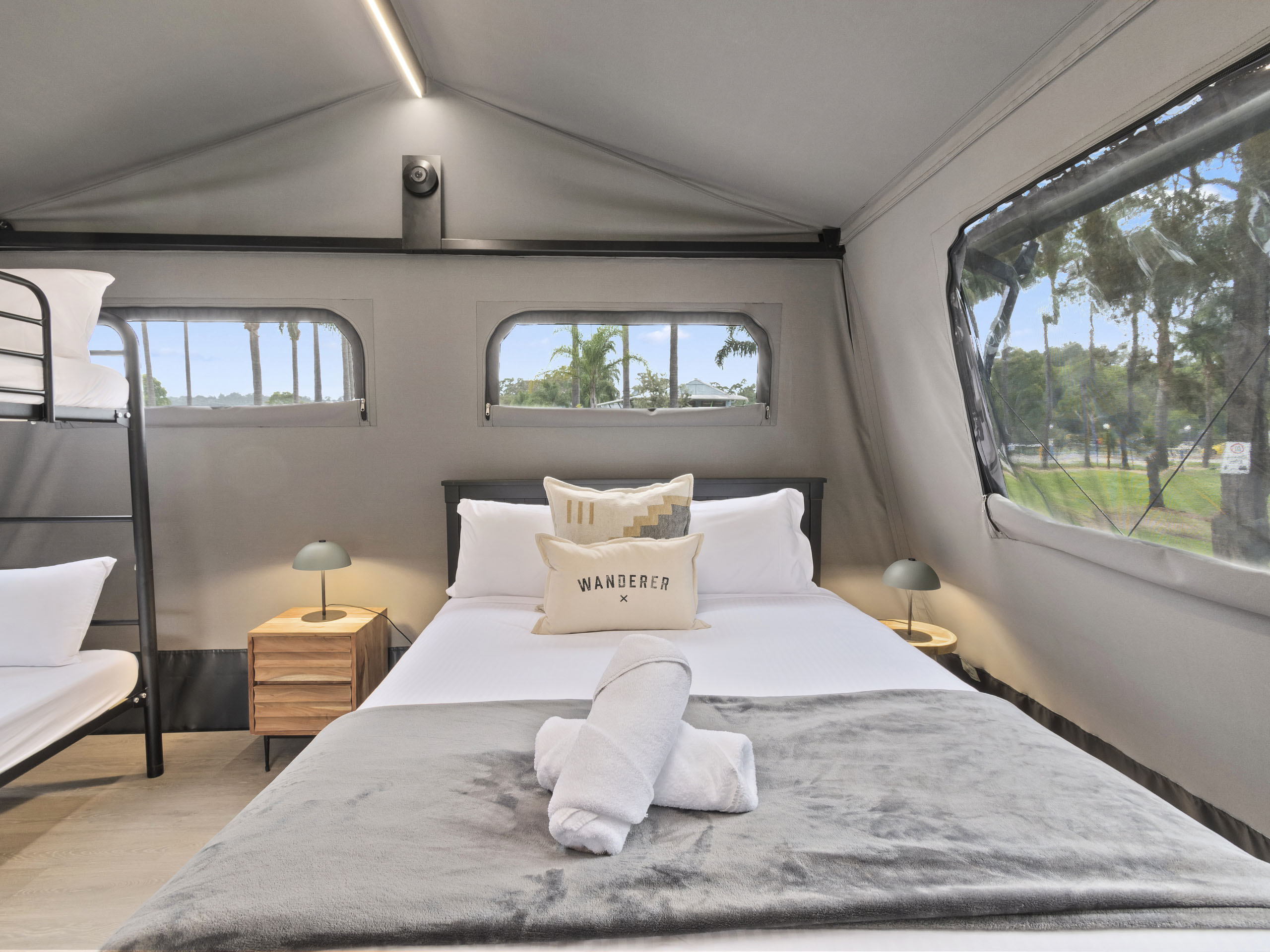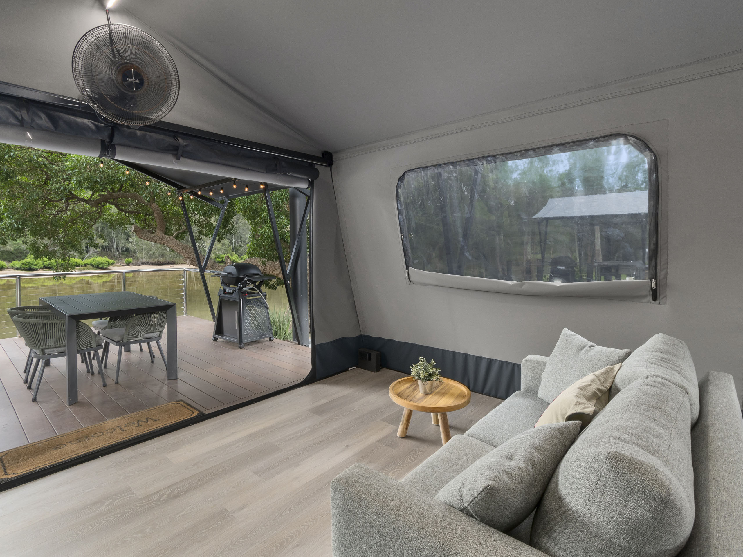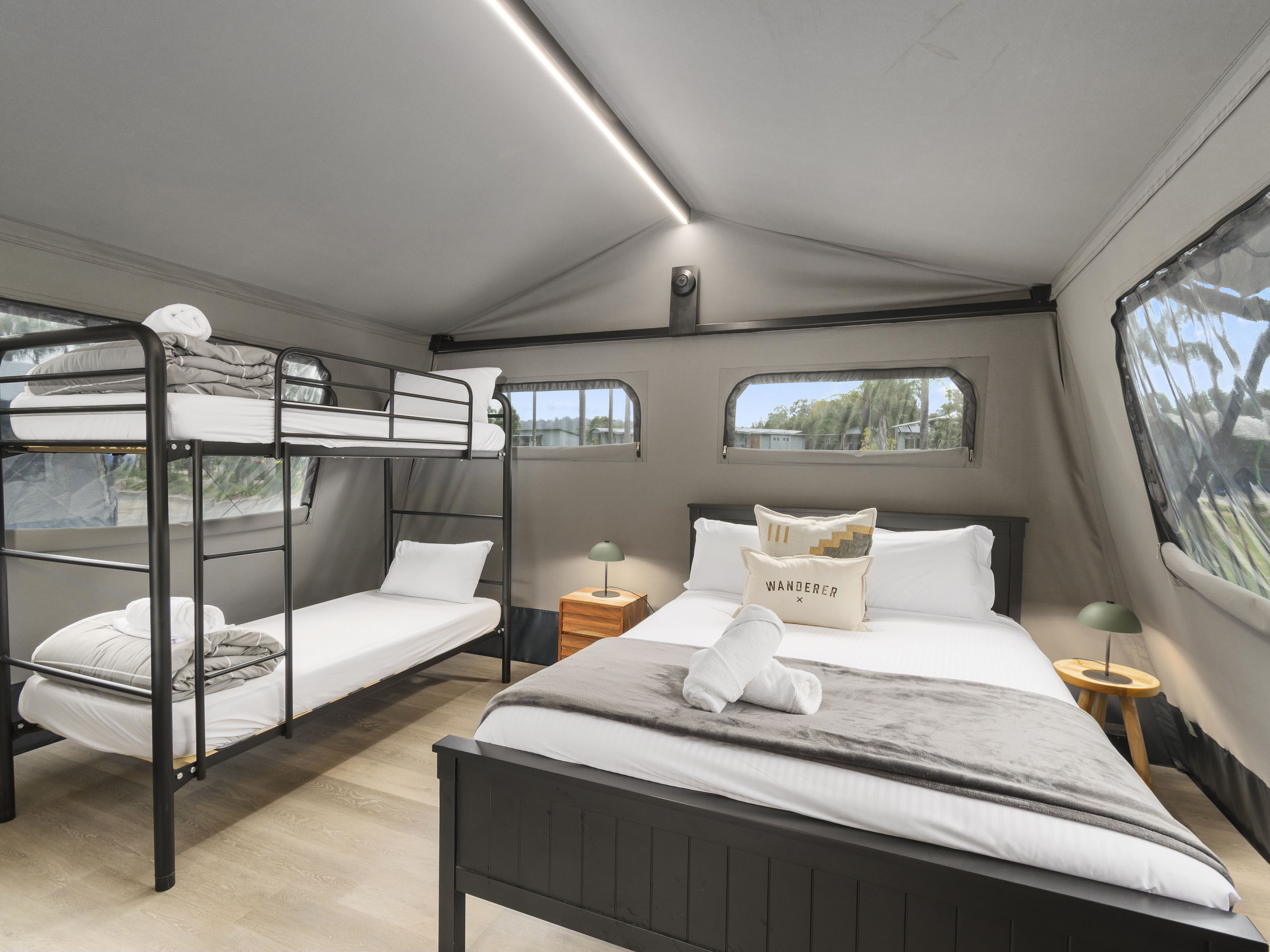 It features one queen bed and a bunk, plus a bar fridge, toaster, kettle, and fan. Shared amenities and cooking facilities are nearby. Set on a timber deck with water views, it's a great option for families after a fuss-free, glamping-style stay.