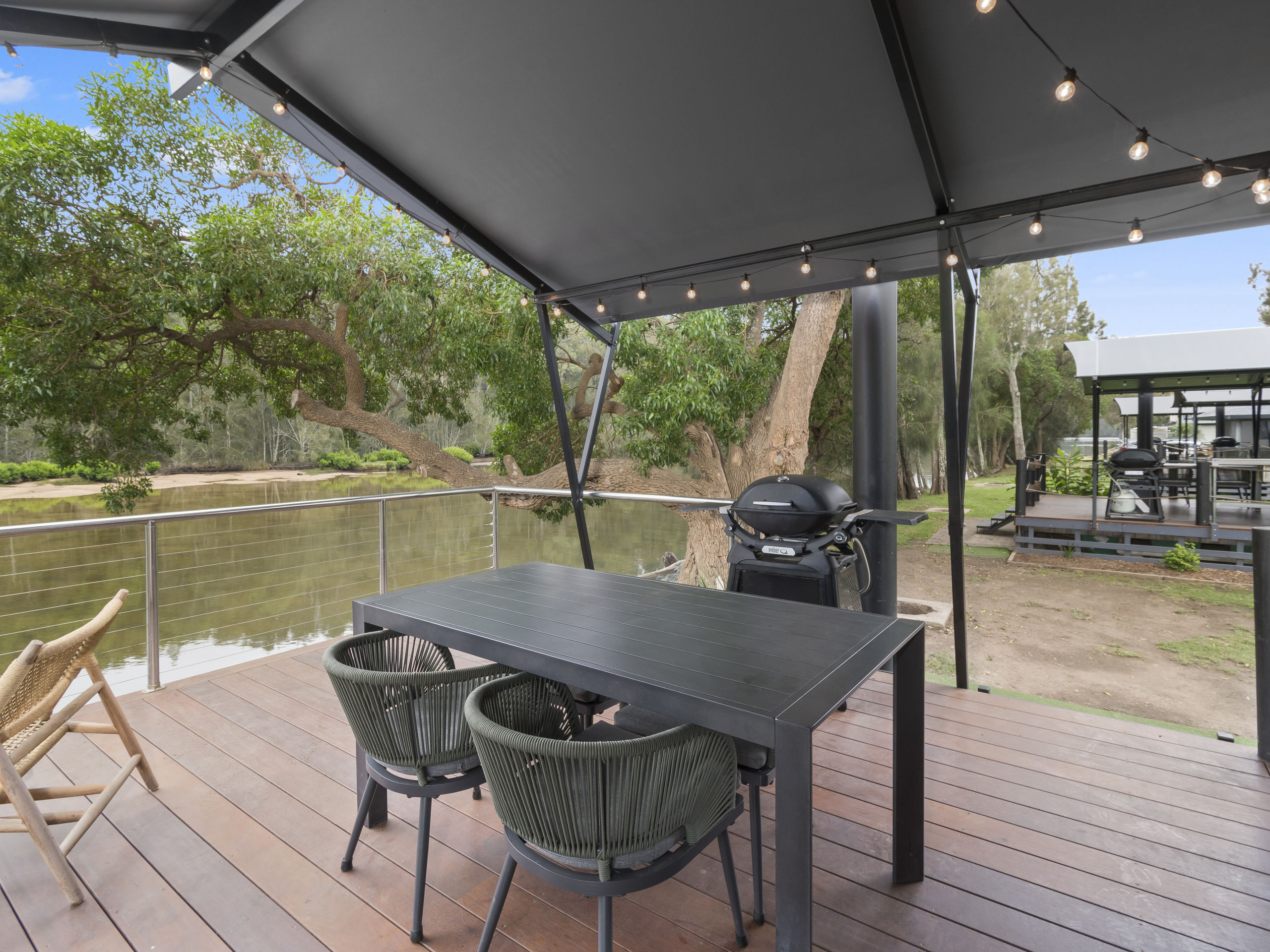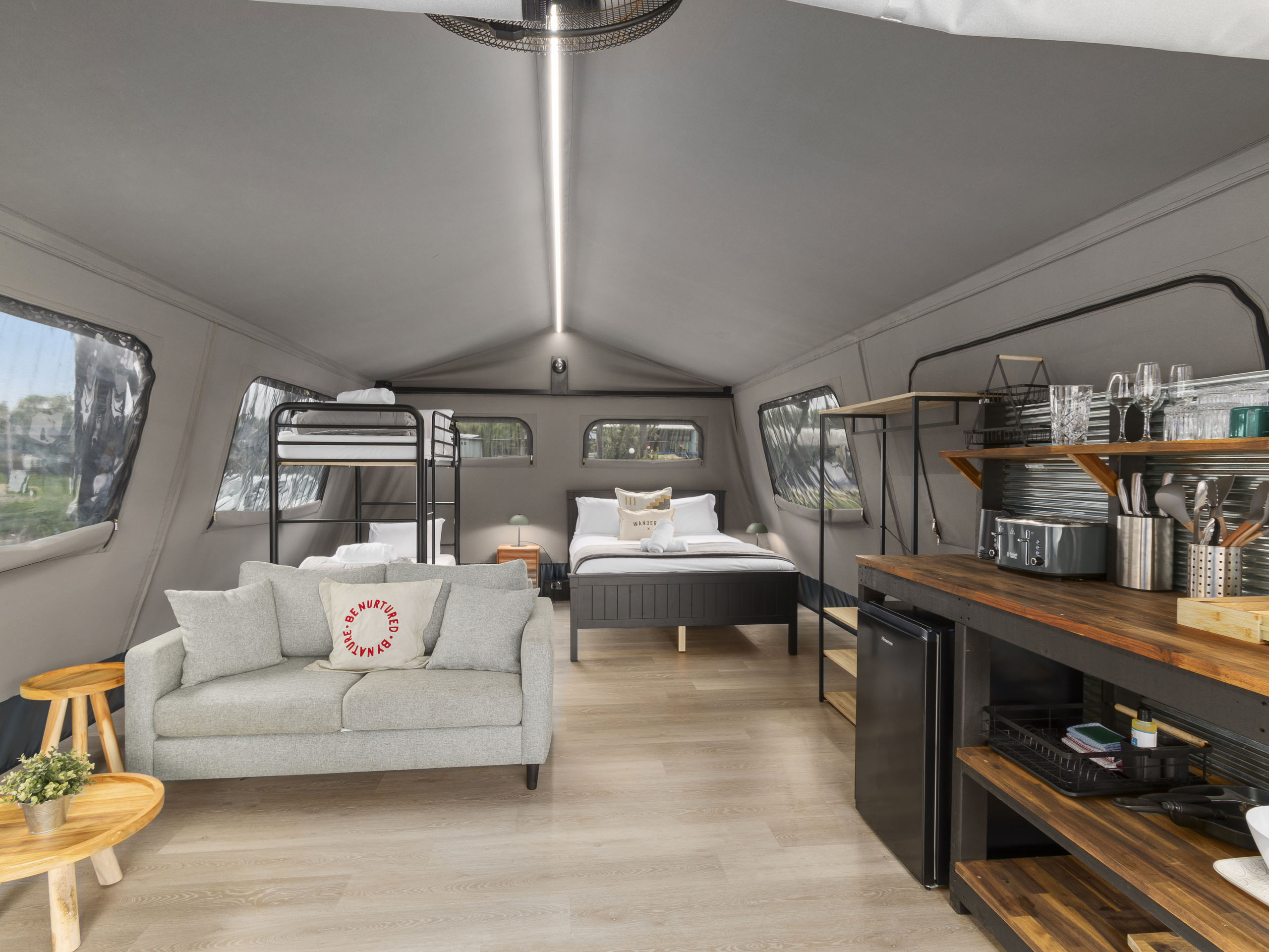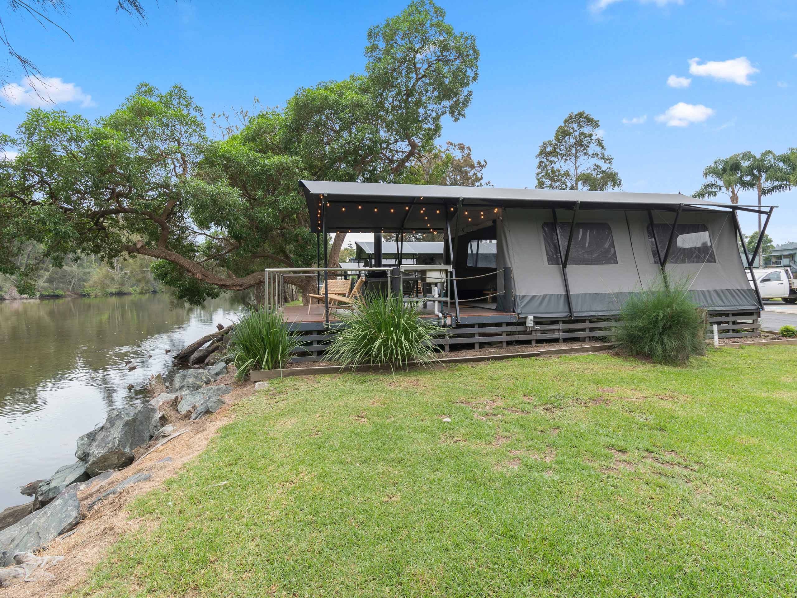 It features one queen bed and a bunk, plus a bar fridge, toaster, kettle, and fan. Shared amenities and cooking facilities are nearby. Set on a timber deck with water views, it's a great option for families after a fuss-free, glamping-style stay.