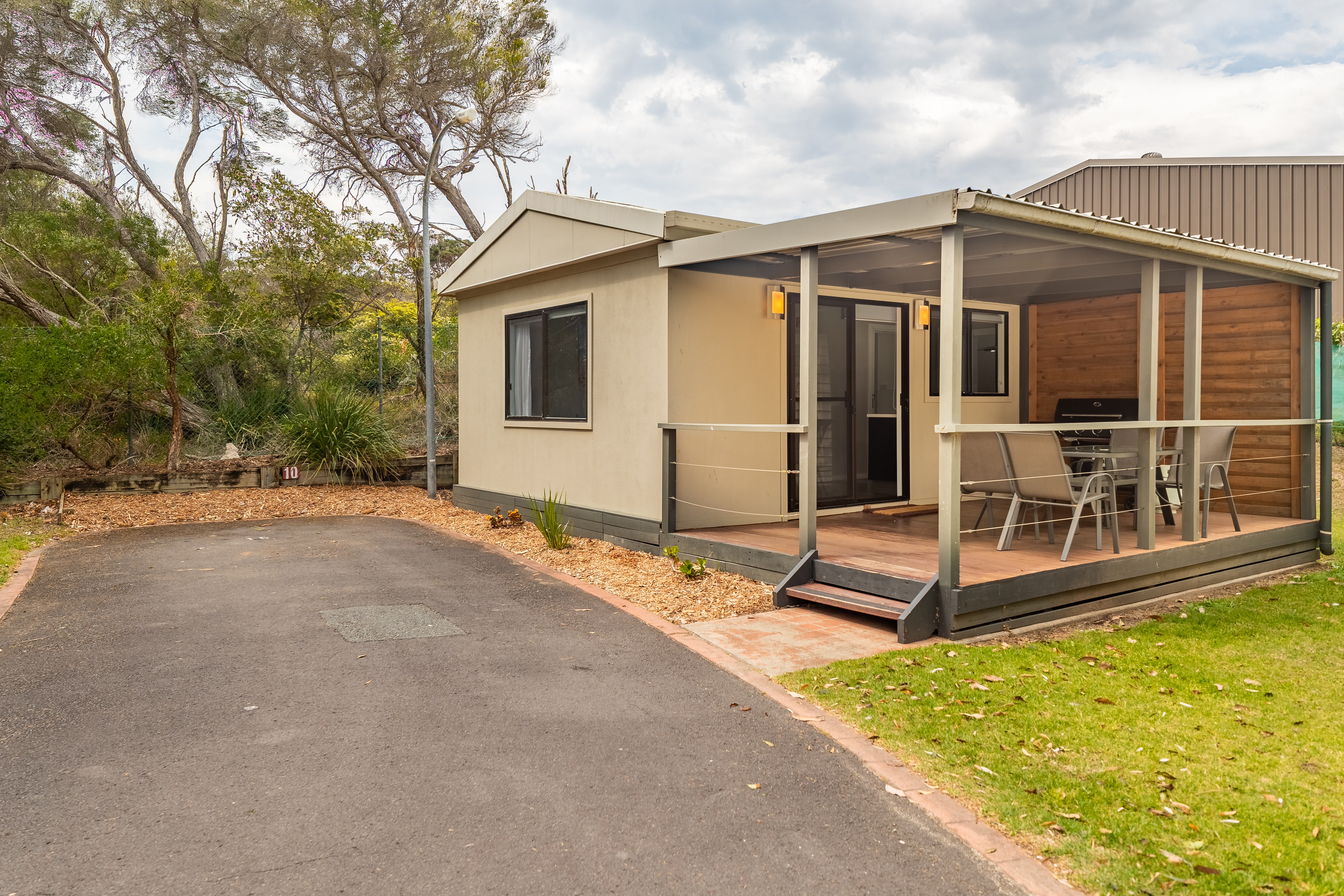 This two-bedroom cabin is ideal for a family setting sleeping 6 and is located close to the beach access. Layout includes bedroom 1 with a queen bed, bedroom 2 with two sets of bunks, and an open-planned living dining area. This room features air-conditioning, a large bathroom, modern kitchen including a stove, oven, microwave, and full fridge. Enjoy alfresco dining and outdoor setting on the veranda.