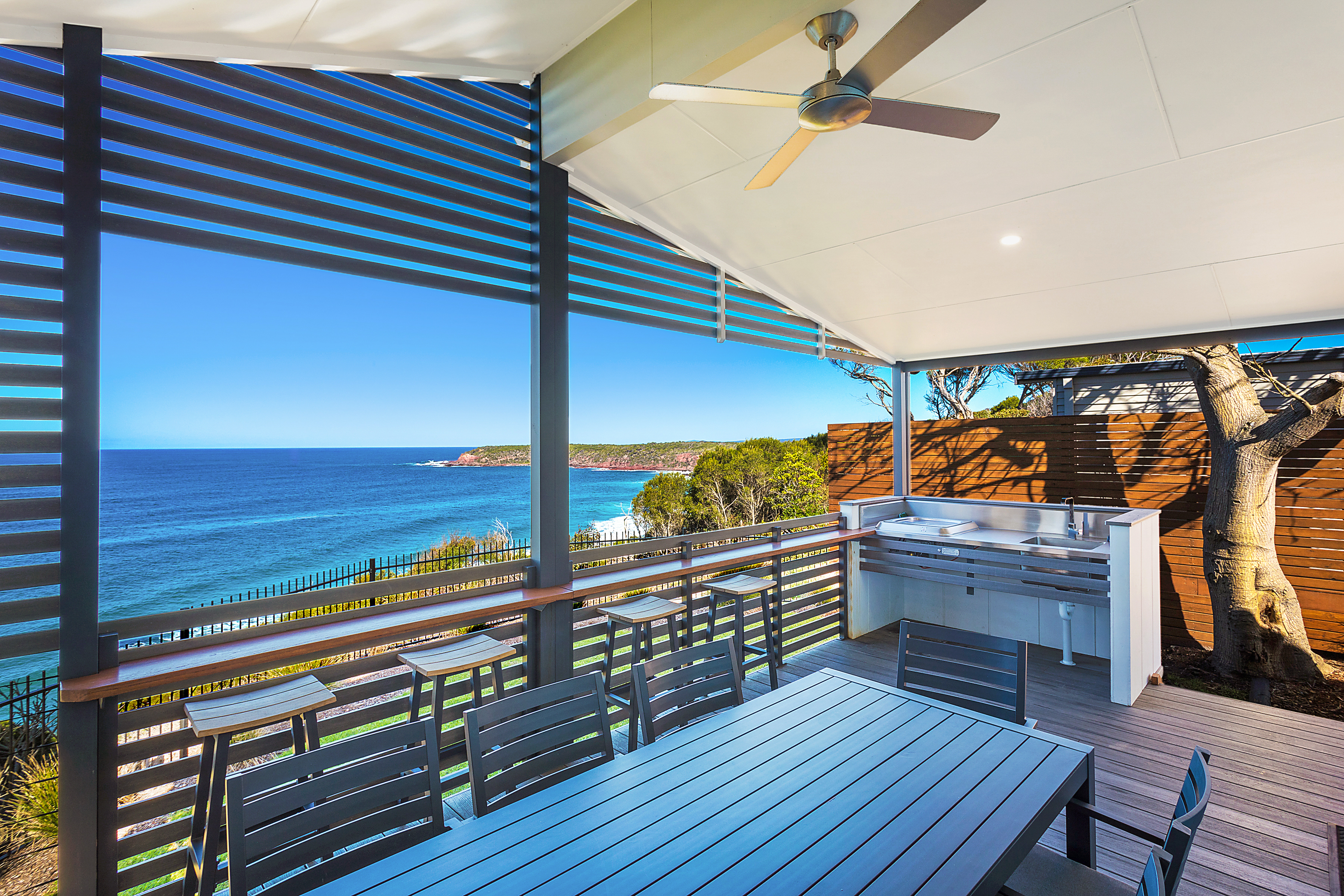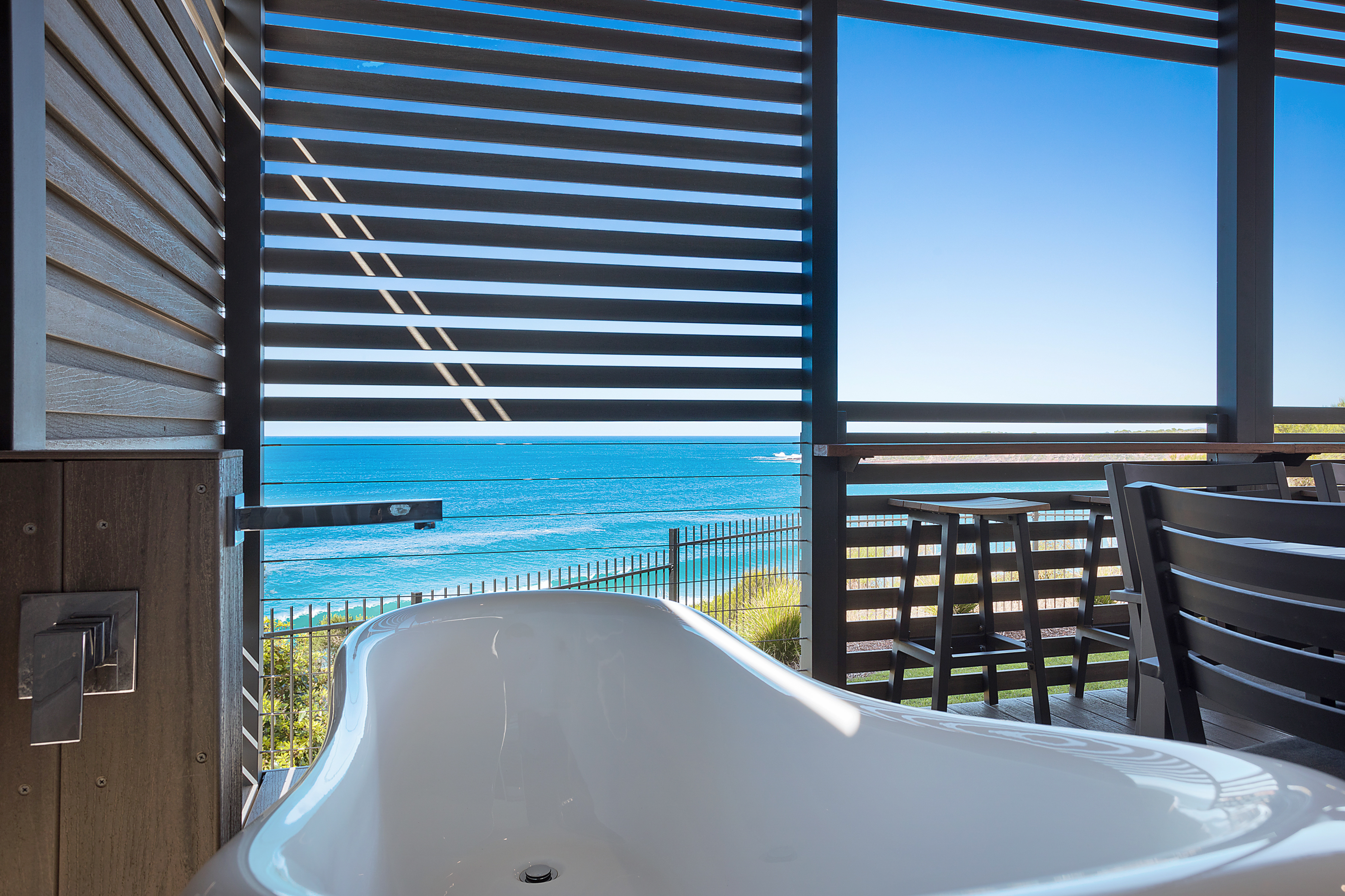 One queen, one king split (two singles on request) and two single bunks. Features air-conditioning; full kitchen; dining and lounge; two bathrooms; two TVs; washing machine; veranda and BBQ; outdoor bath; outdoor dining and breakfast bar. One parking space next to villa.Availability
