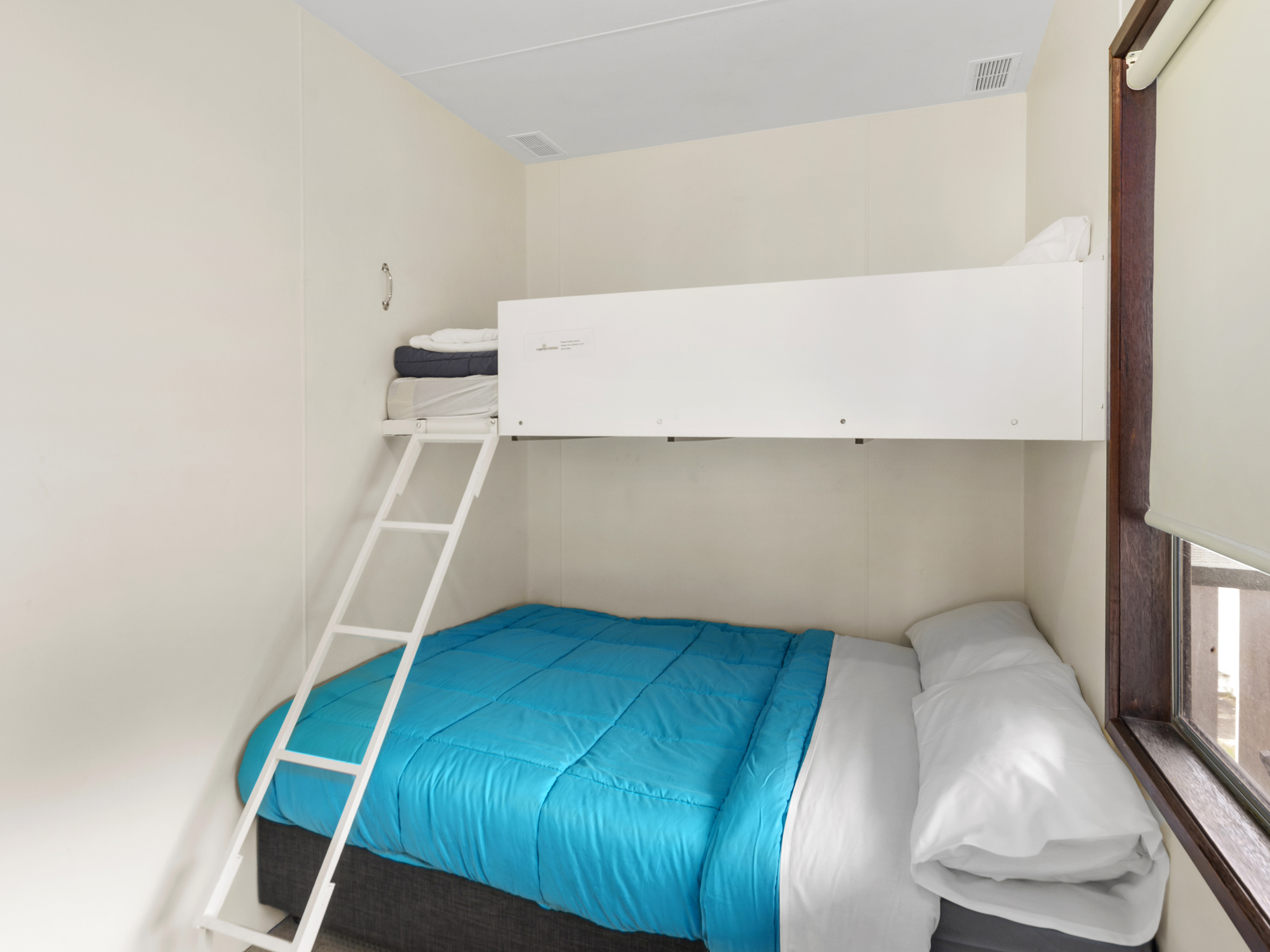 Perfect for families or small groups, this economy two-bedroom cabin sleeps up to five guests with a double bed and one single-over-double bunk.