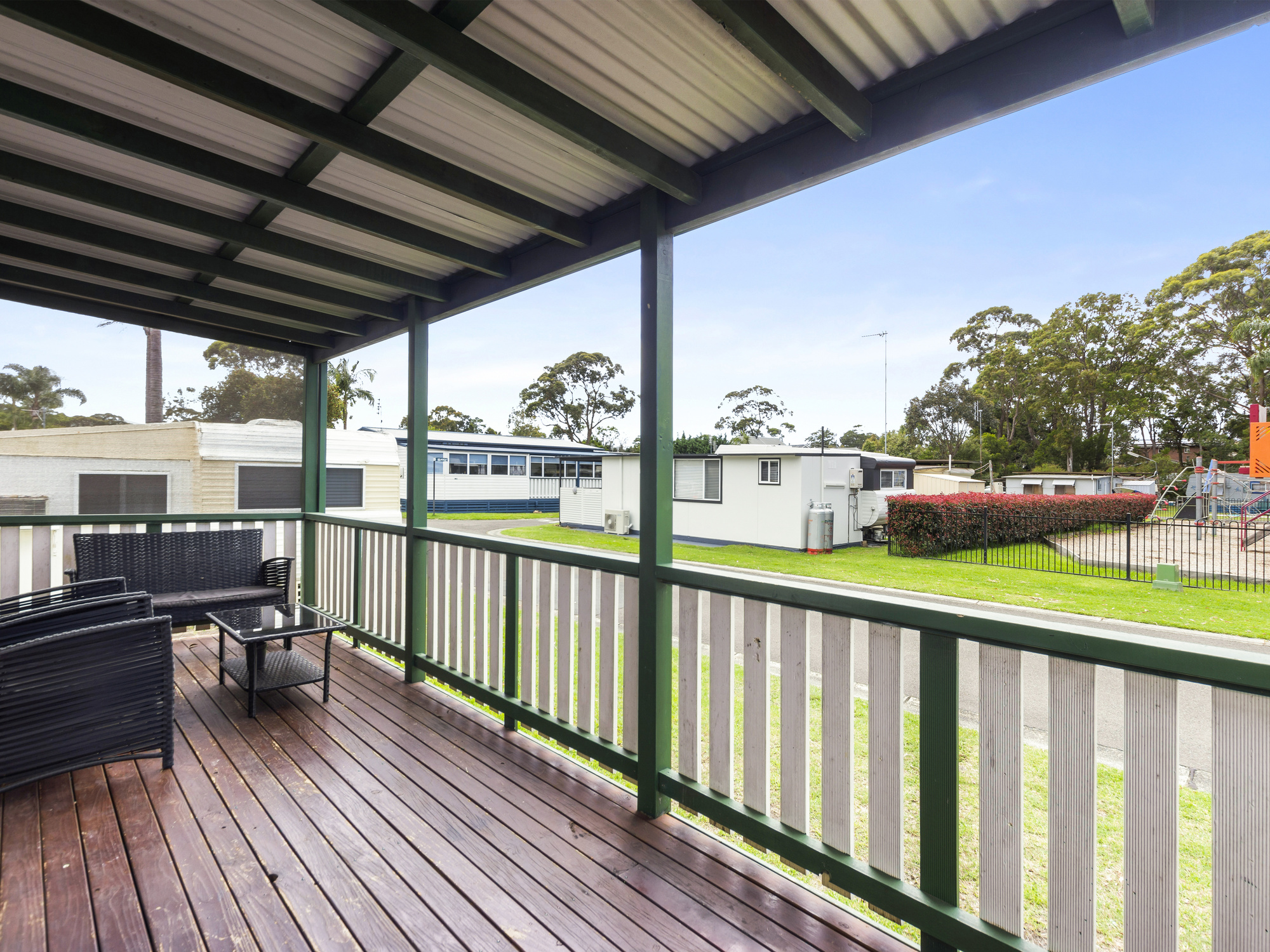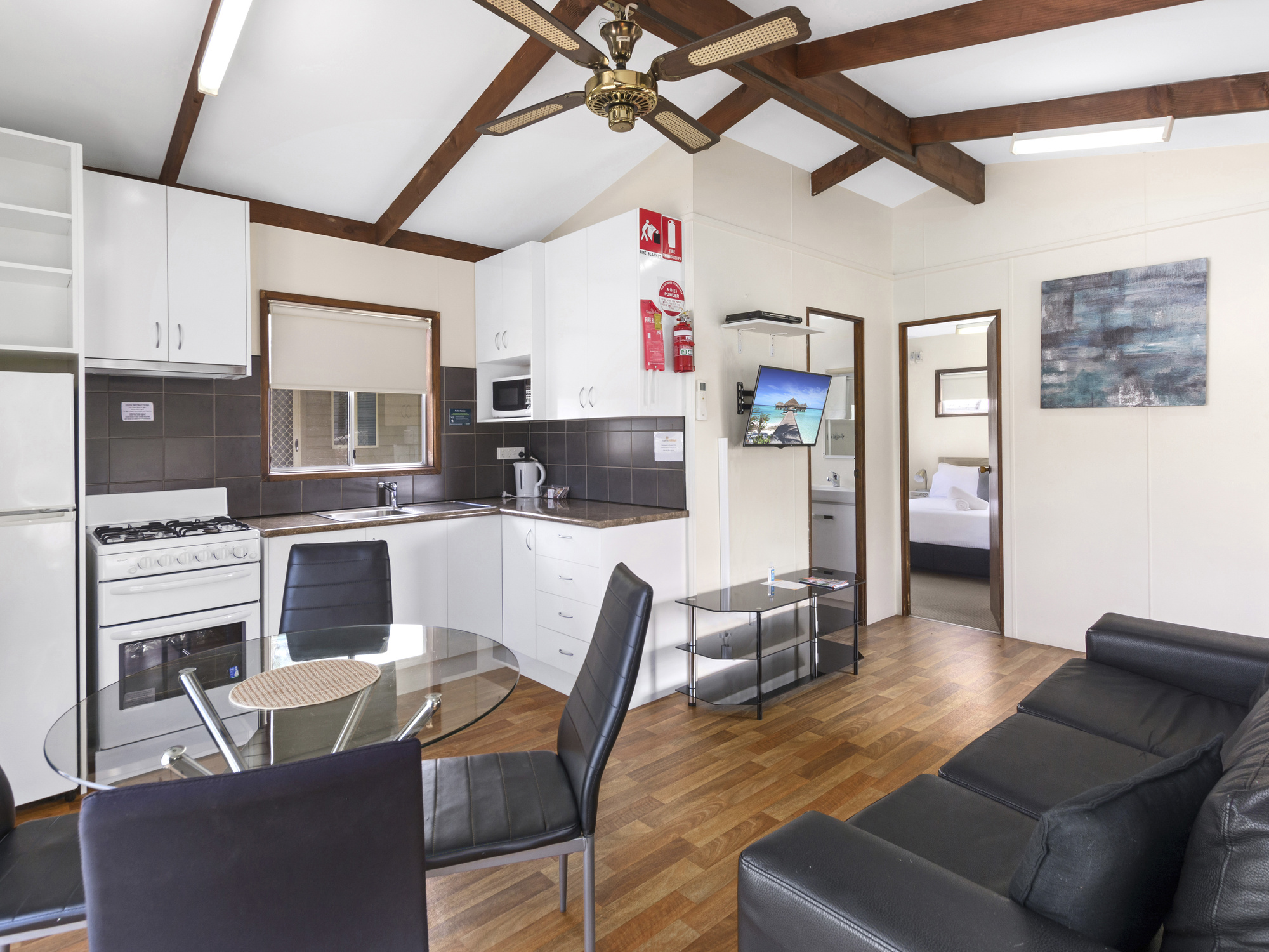 Enjoy the convenience of a full kitchen with gas oven, microwave and full-size fridge, plus a private bathroom. The open-plan living area flows to a private deck with outdoor dining, ideal for relaxed coastal stays. Includes TV, fan, and linen.