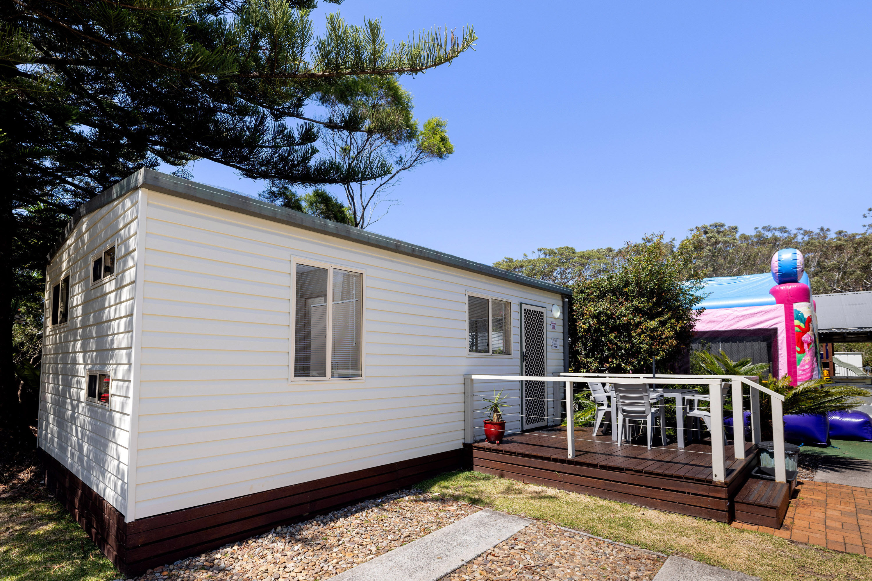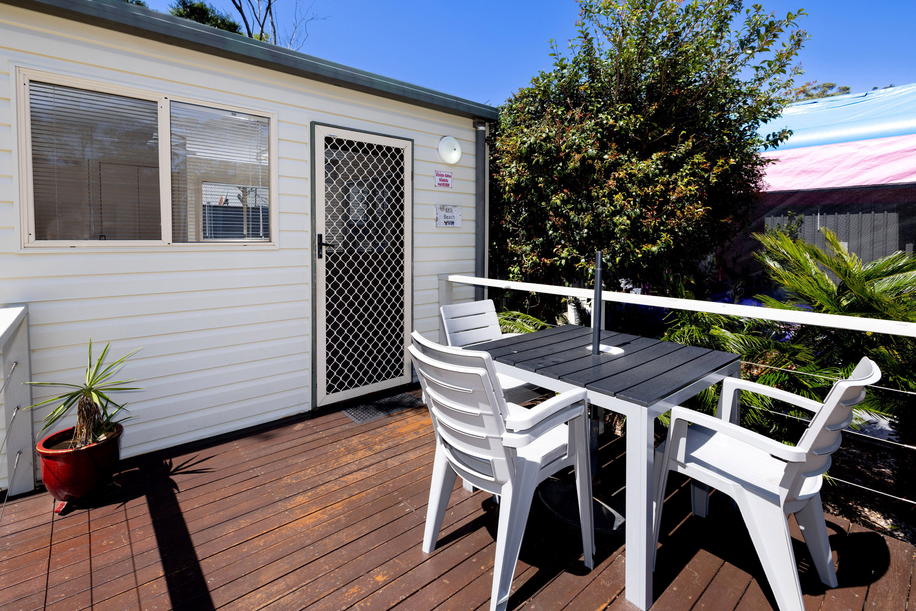 The Courtyard Two Bedroom Cabins at BIG4 South Durras are fully self contained with a timber deck and outdoor setting.