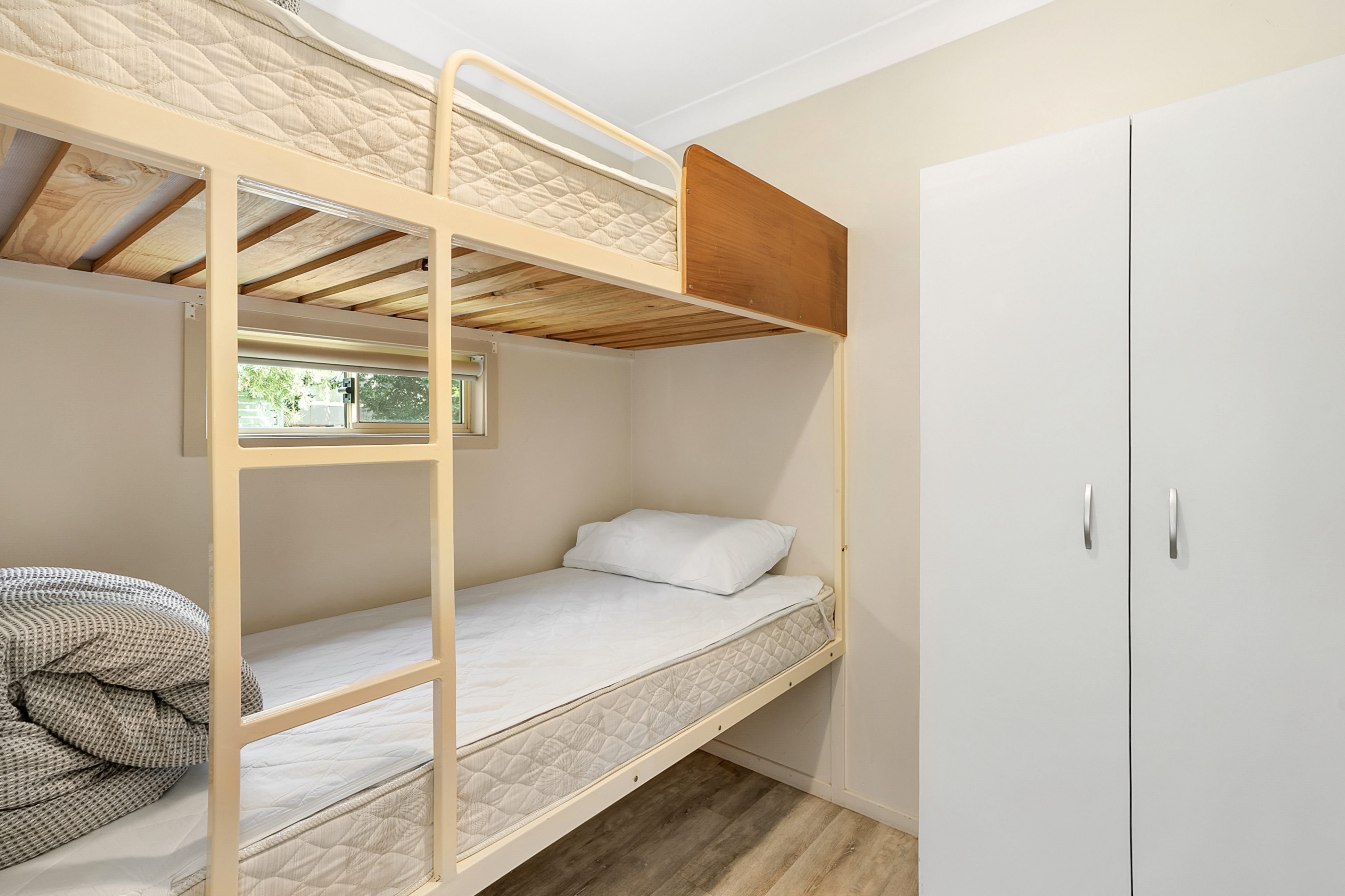This cabin is perfect for a family of 4 and is situated close to the pool and children's play area. There is a double bed in the main bedroom and a set of double bunks in the second bedroom. This cabin has a lovely lounge living area with all the comforts of home including a TV, reverse cycle air conditioning as well as a small deck and gas BBQ.