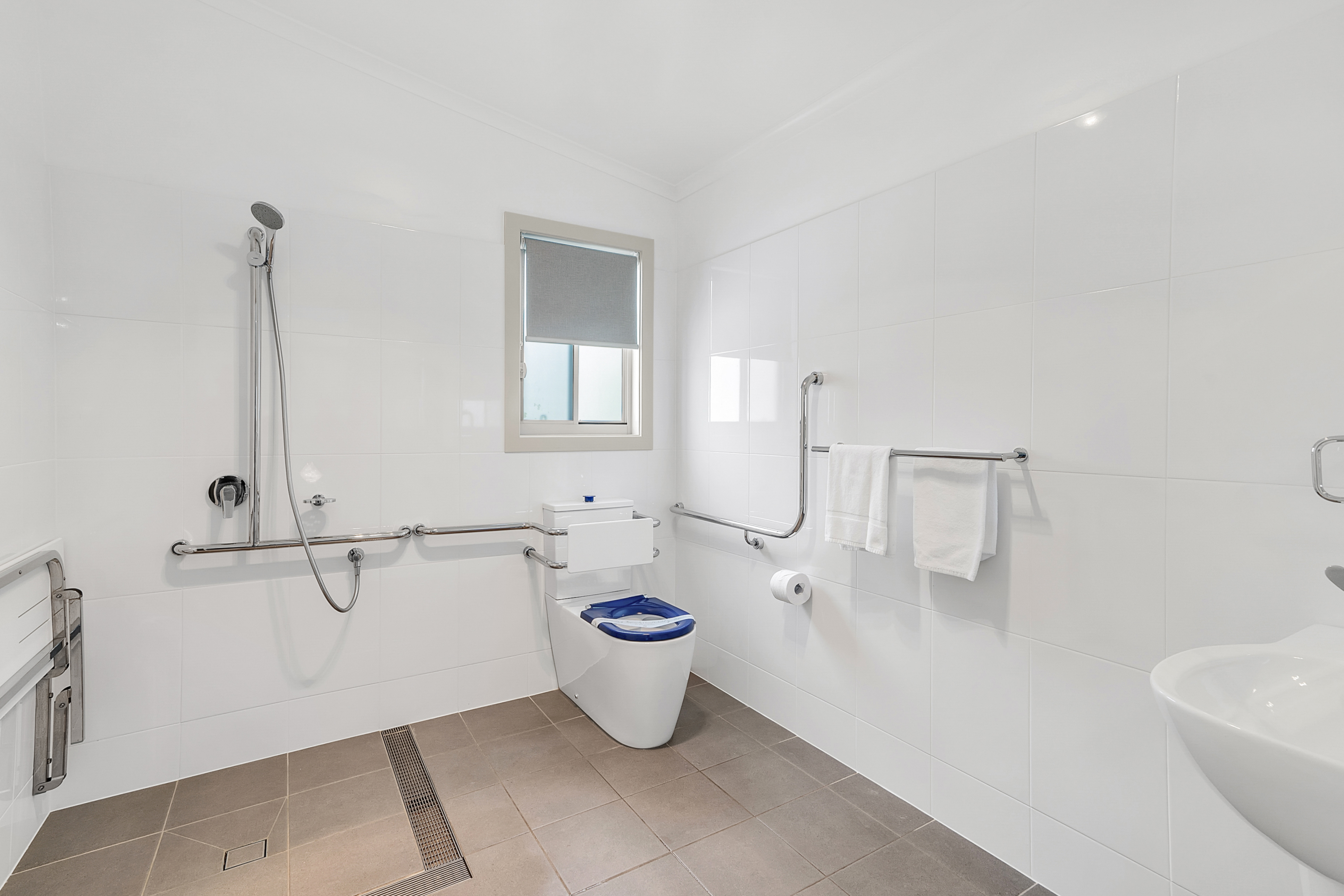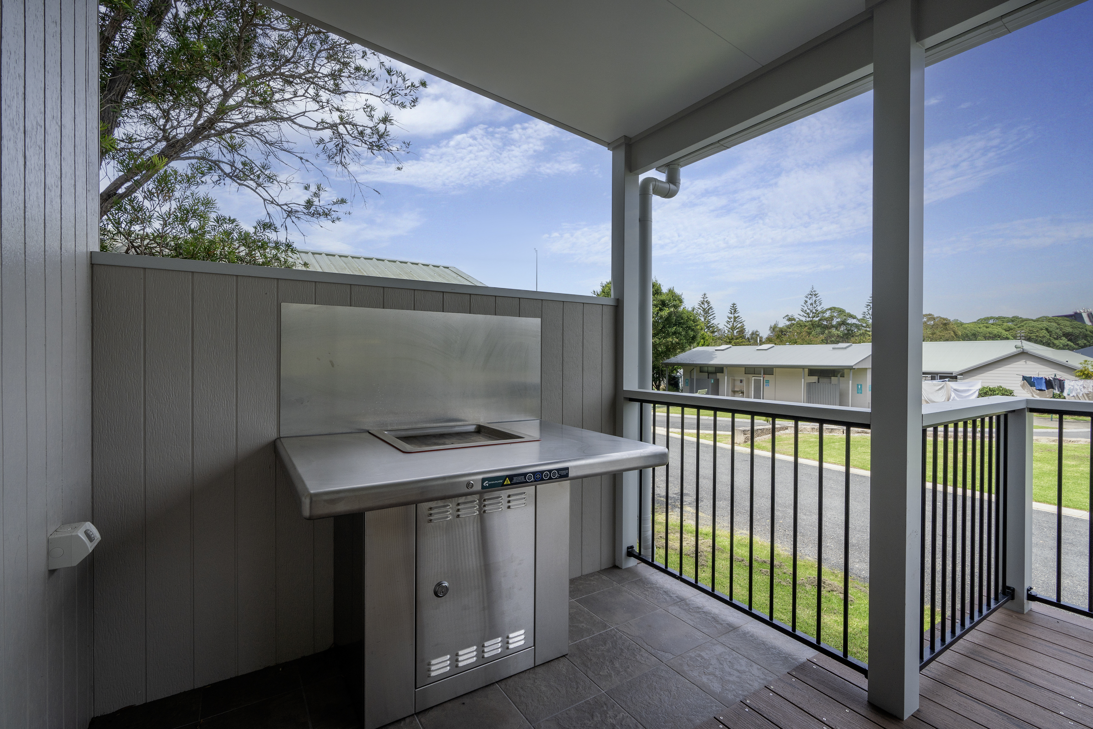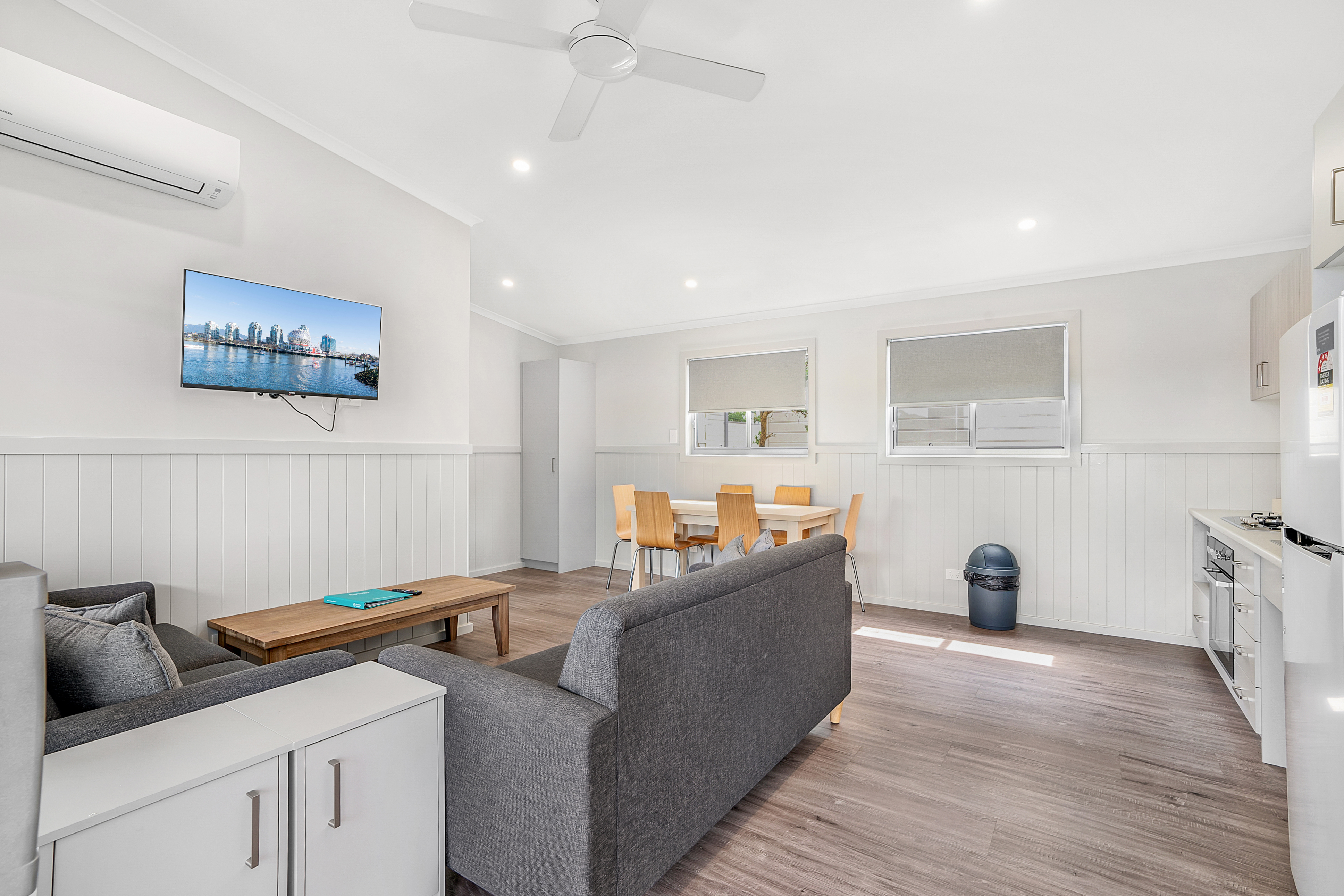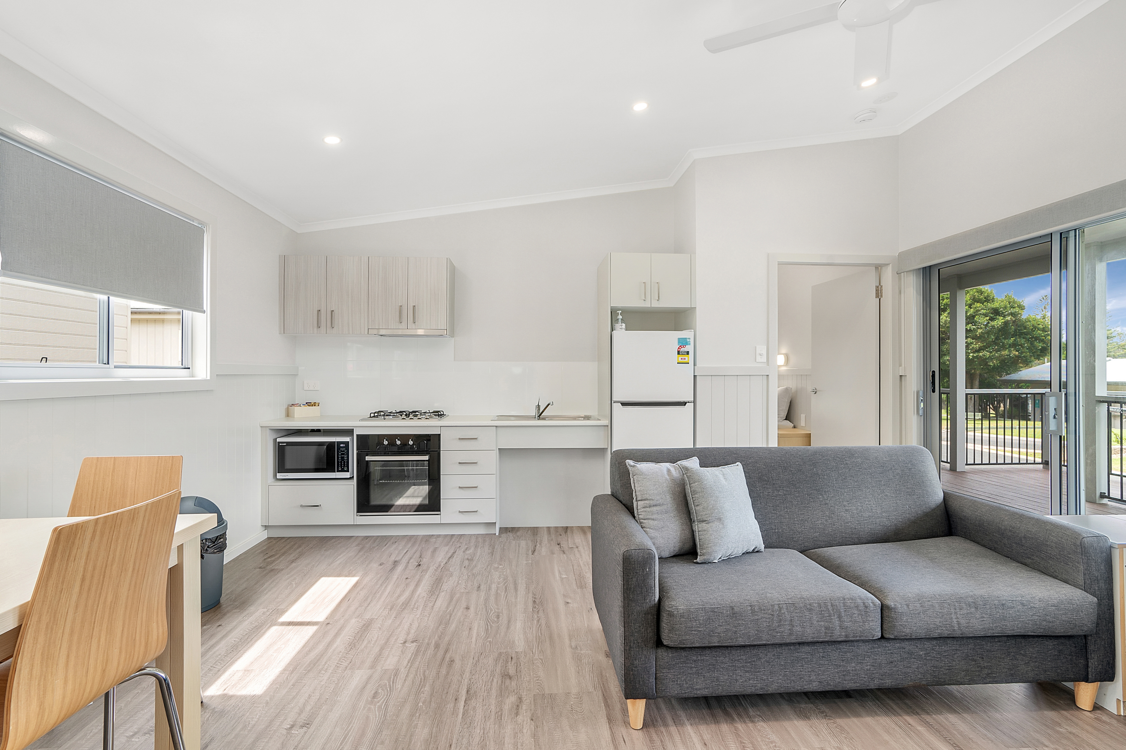Our accessible cabin has an open-plan living/dining area with a flat-screen TV, reverse-cycle air conditioning, and a fully equipped kitchen. The easy-access bathroom is extra spacious and the ideal space to refresh and rejuvenate after a long day of exploring the natural wonders around the local area. Have dinner on your very own covered outdoor deck, complete with an accessible BBQ and a comfy outdoor dining setting. Sleeps 6 (max 4 adults).