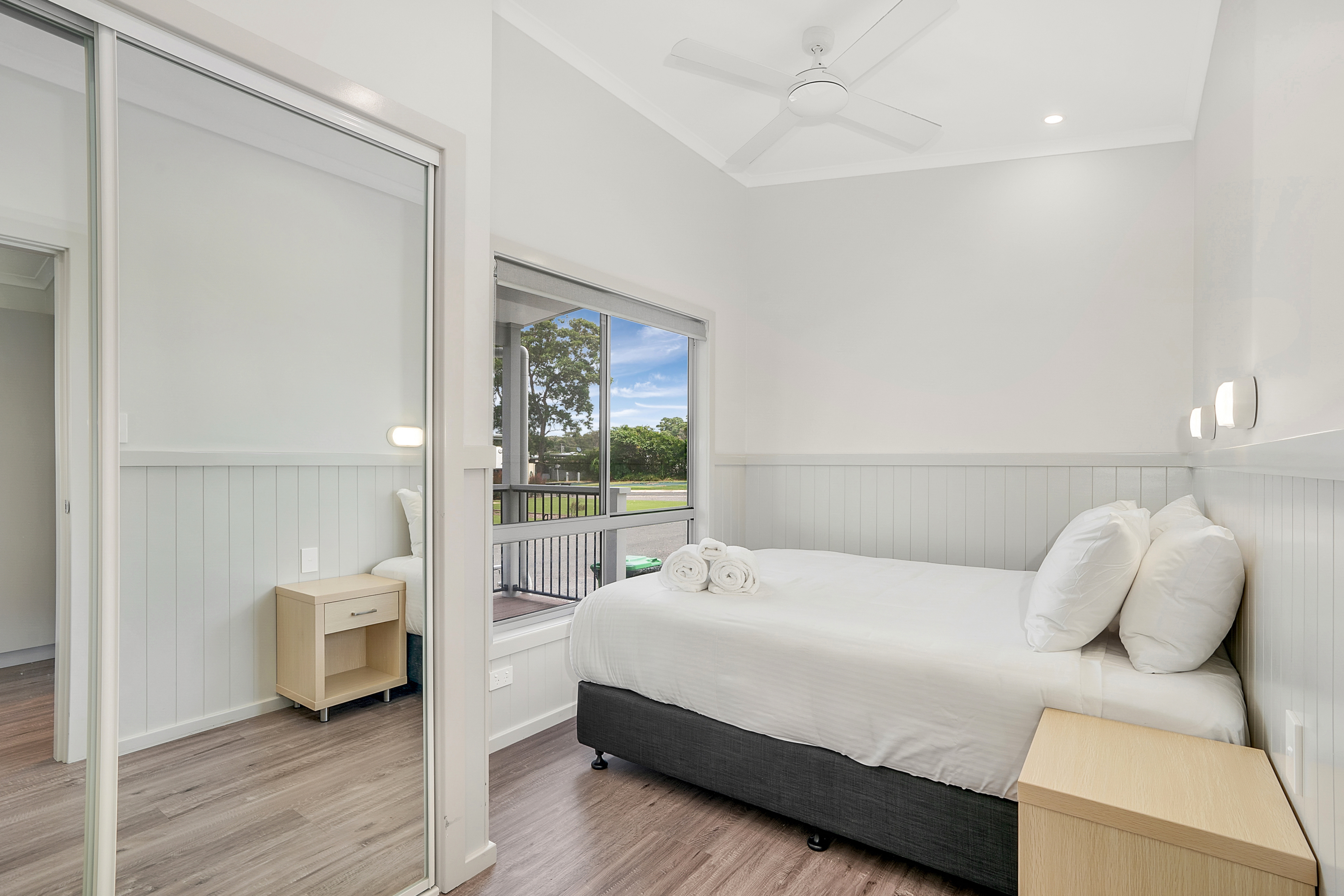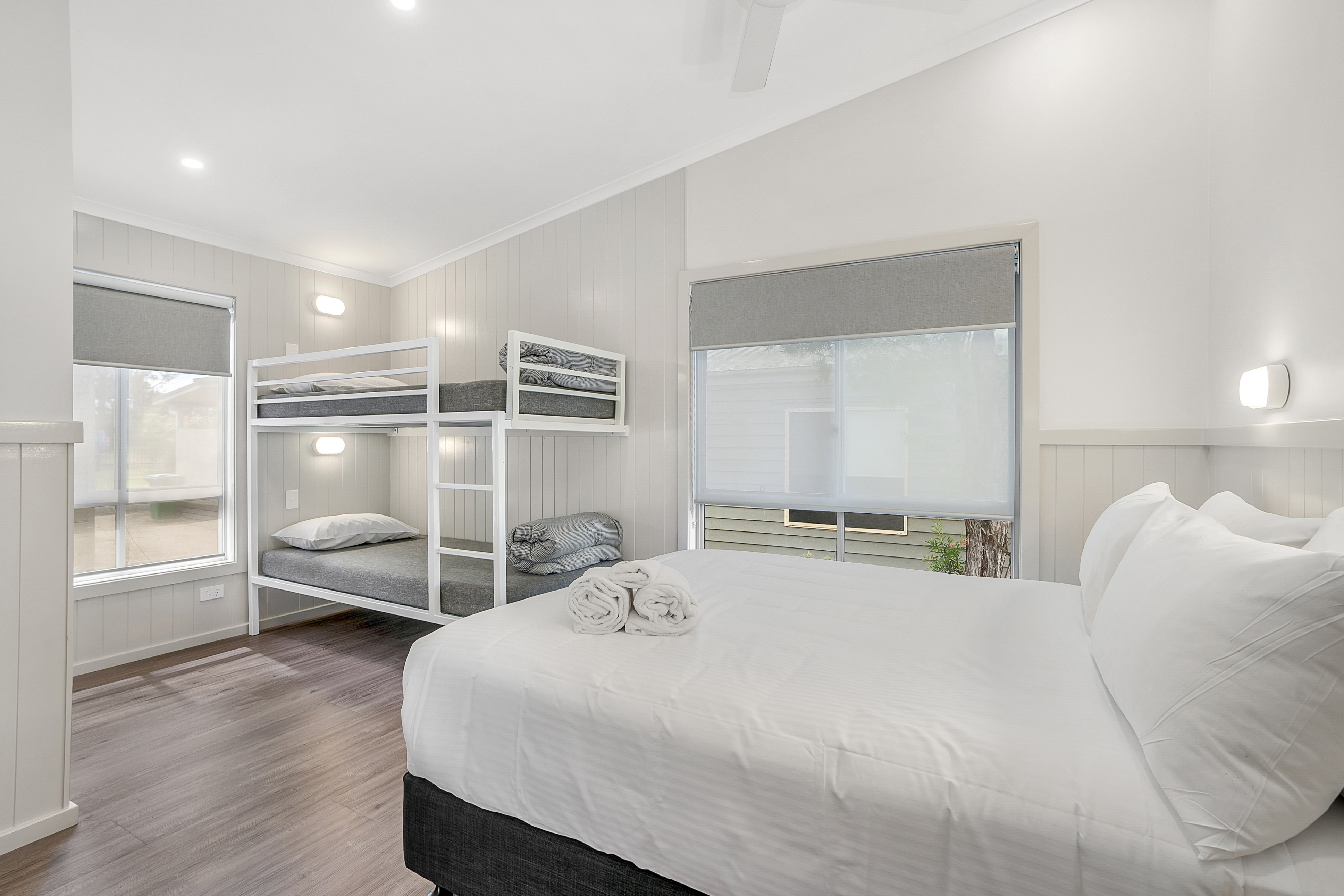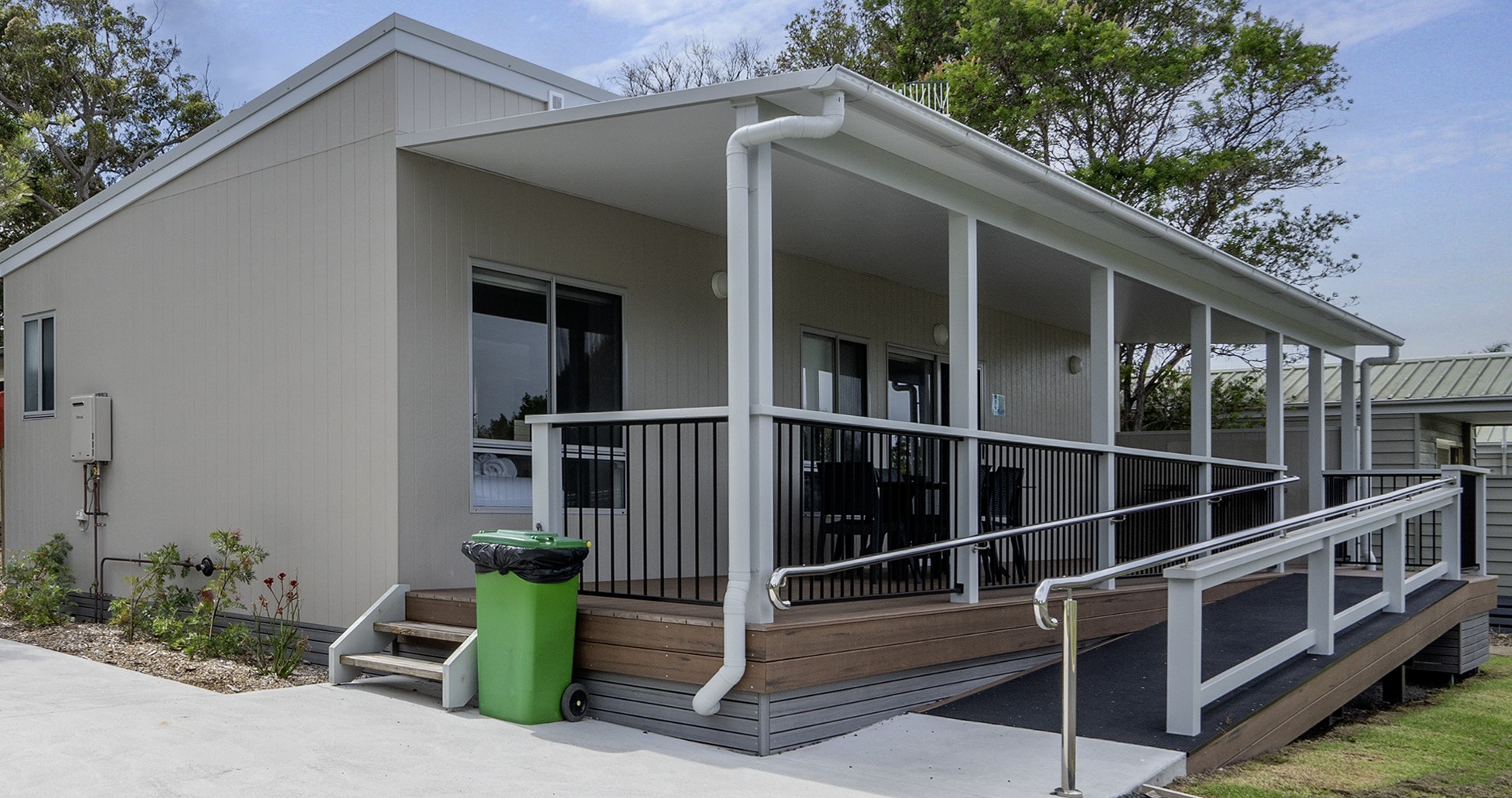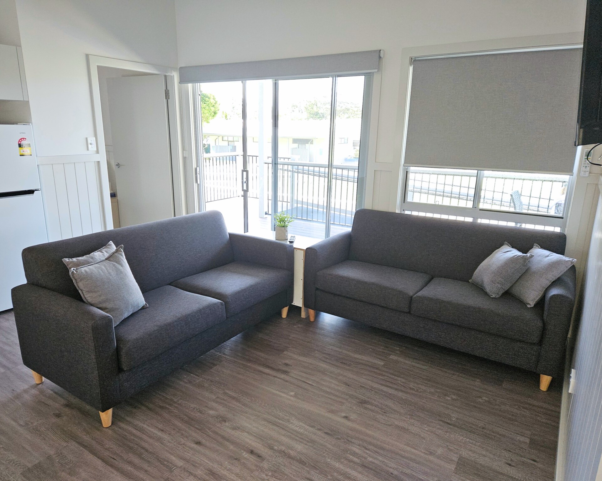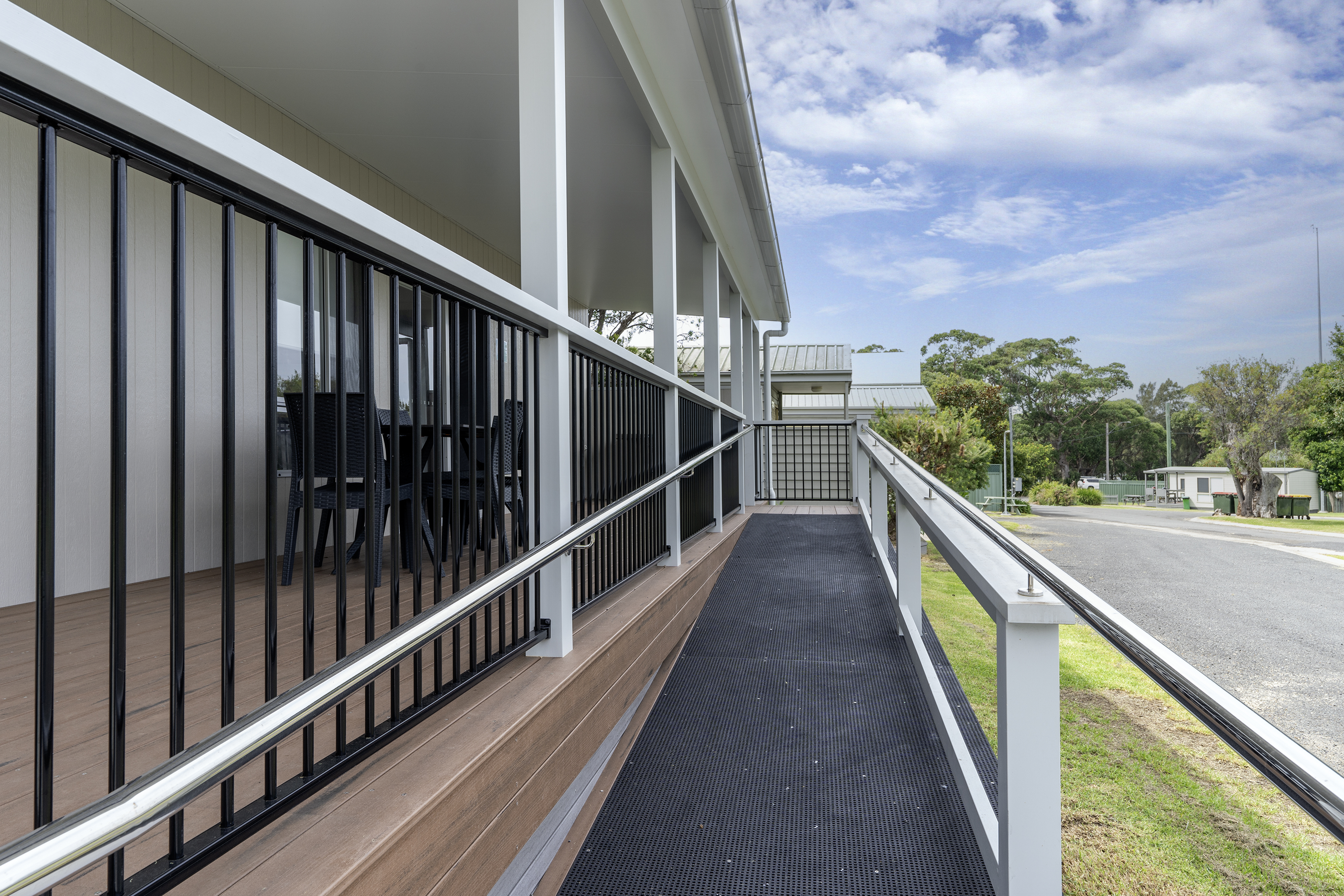 This brand new fully self-contained accessible cabin includes a ramp for easy access to the cabin. This beautiful 2 bedroom cabin is your home away from home with a queen bed in the main bedroom and two single beds in the second bedroom, making it the perfect choice for families or two couples travelling together.
