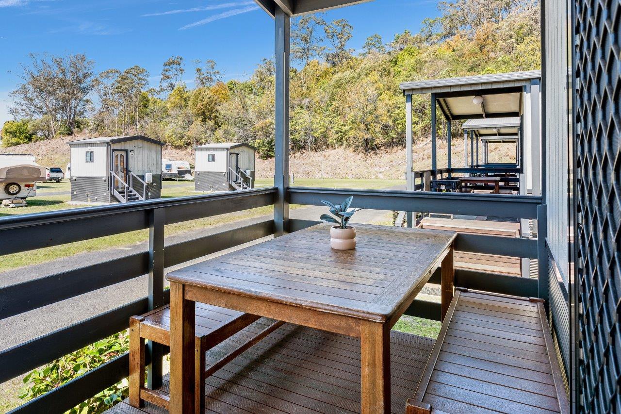 Fully equipped kitchen, 3-seater lounges, TV, and air conditioning. Front deck with outdoor setting. Bathroom with washing machine, separate toilet.