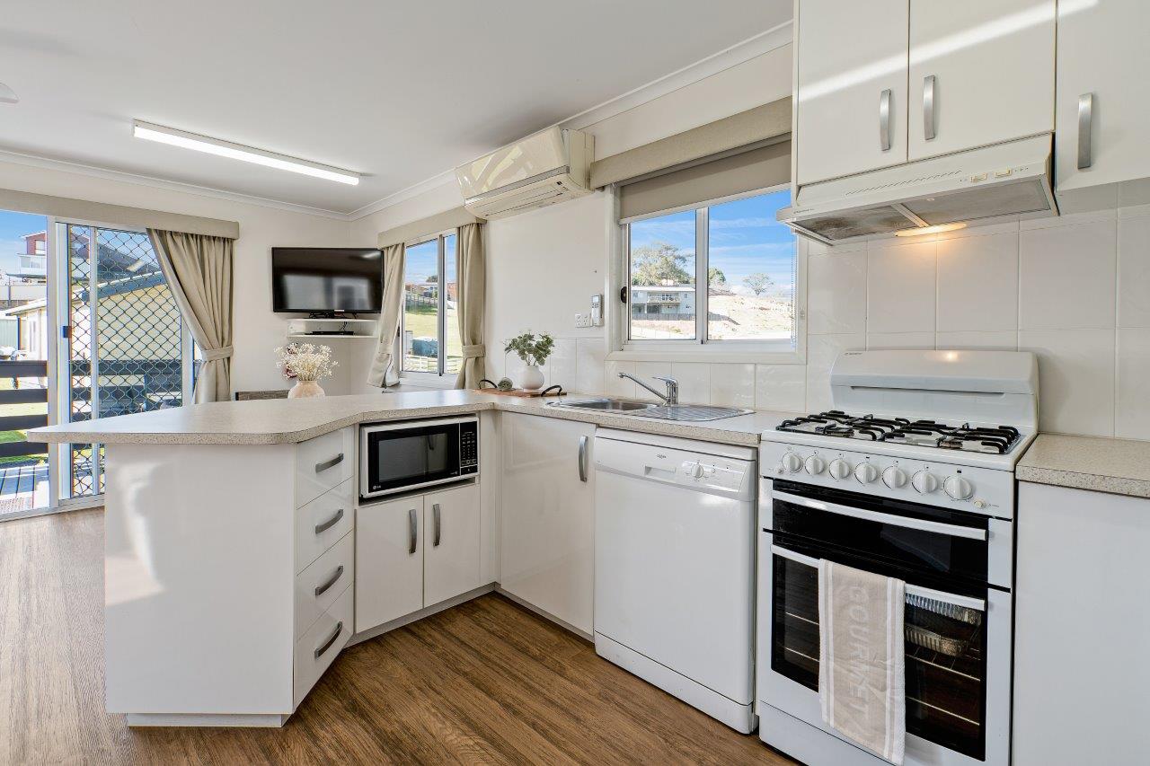 The 3-bedroom Kalinda Cabin features a fully equipped kitchen with modern appliances, a spacious lounge with a sofa bed.