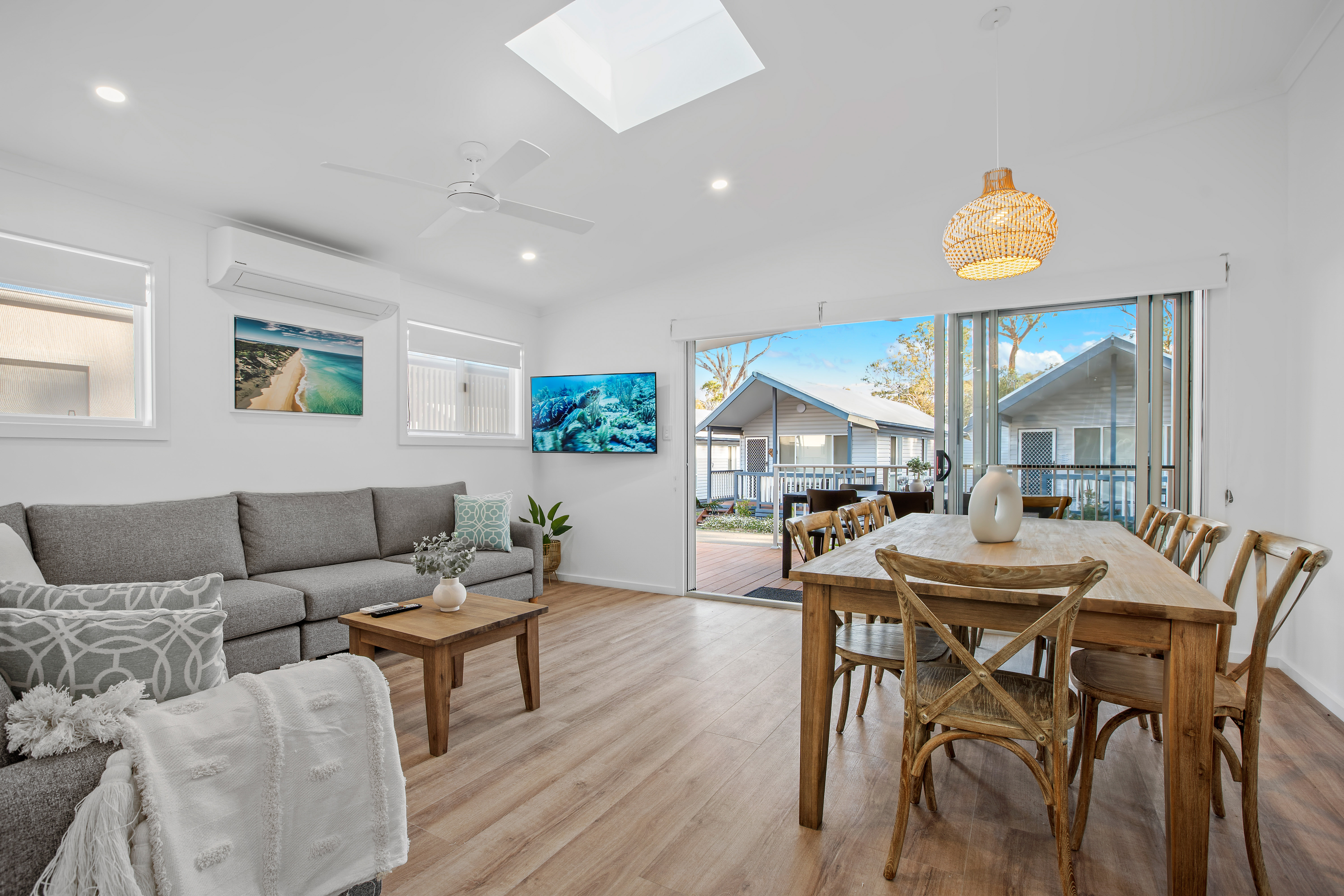 Situated in close proximity to the pool and playground, and just a short walk from the beach, our brand-new Deluxe Family Villas provide an ideal retreat. The villa has a spacious balcony and open plan living area with a generous kitchen that comes equipped with all you could need to prepare a delicious meal. The villa has three bedrooms, comprised of two queen rooms, as well as a room for the kids, with two king single twin bunks.