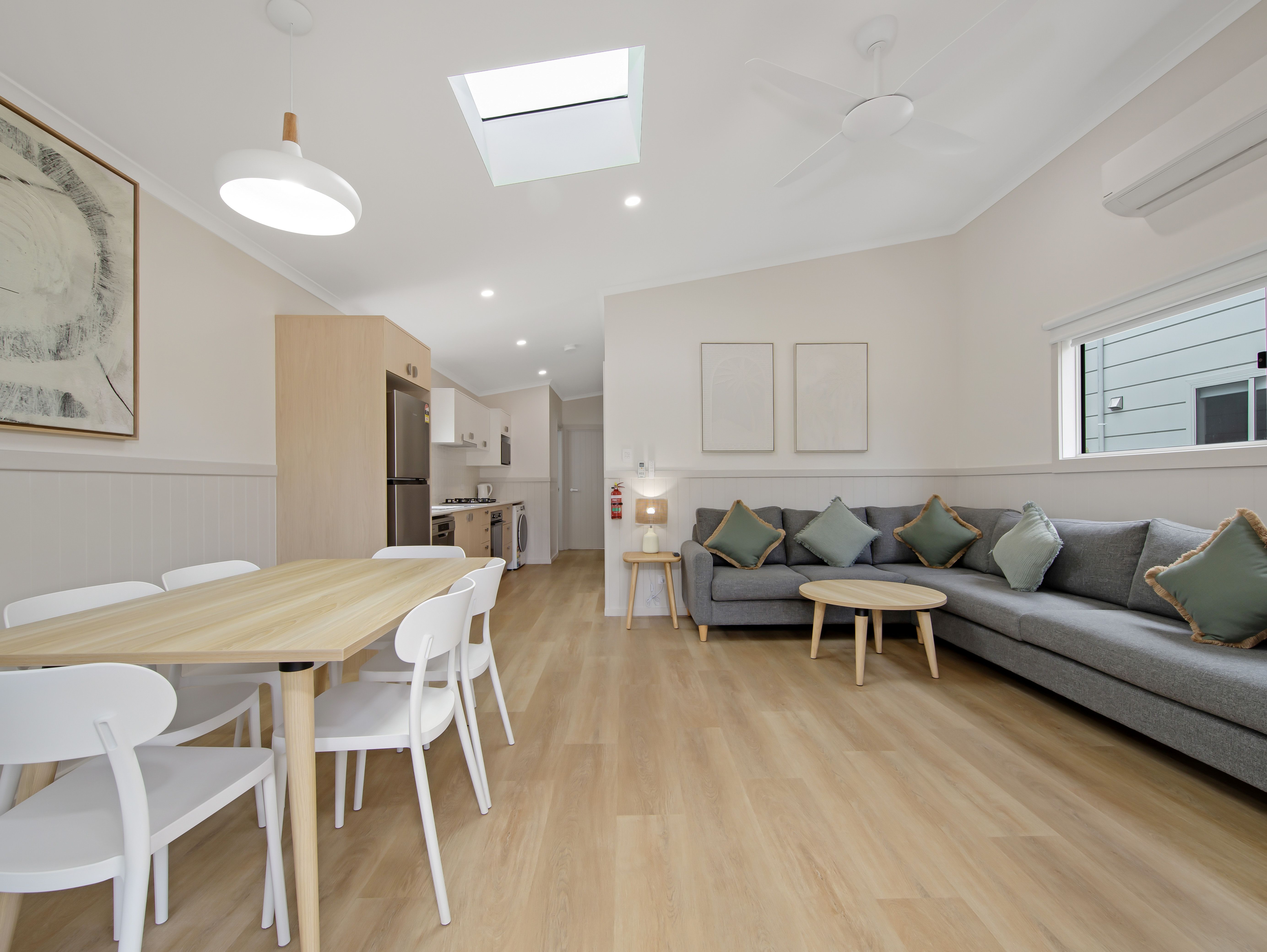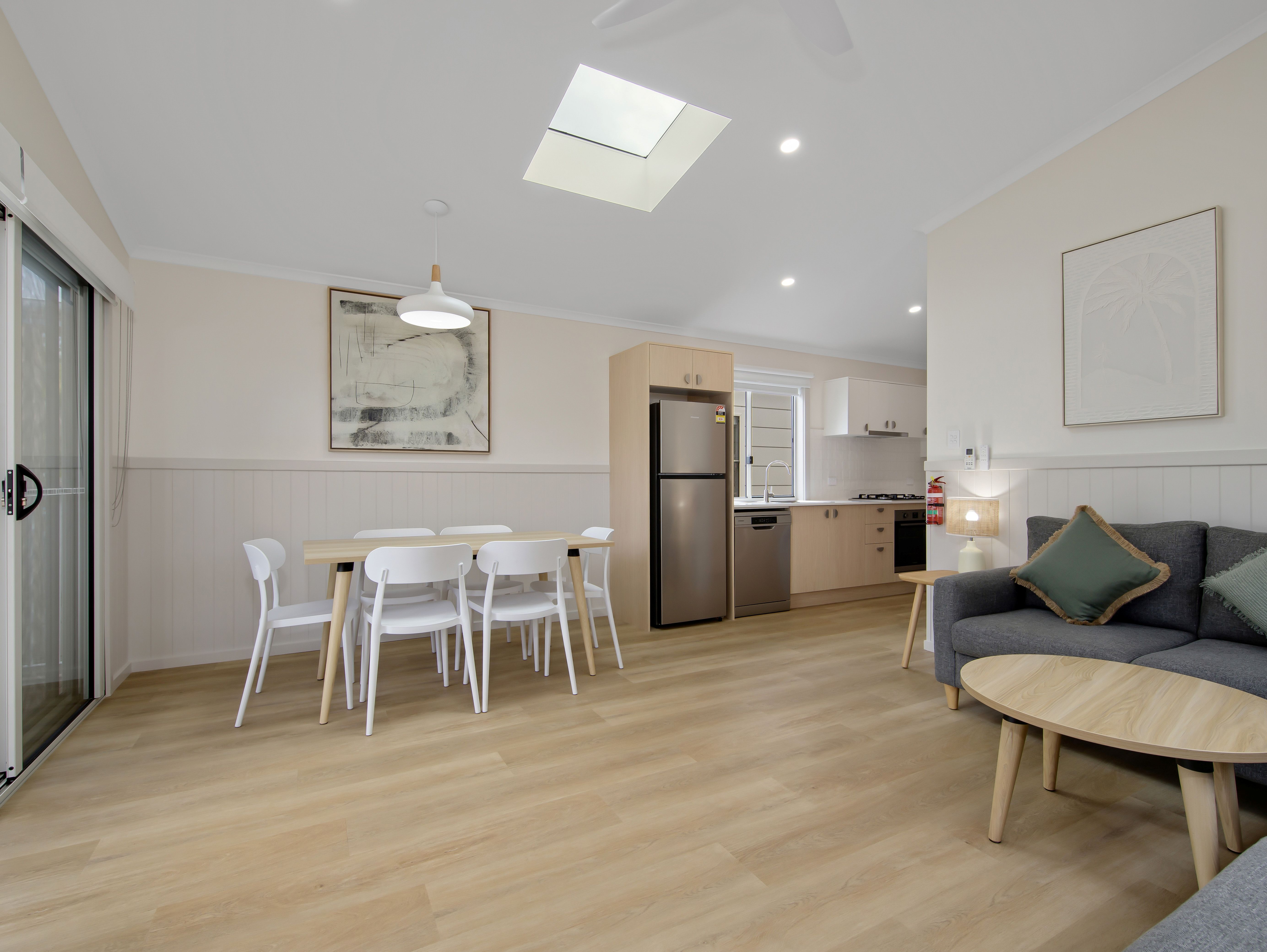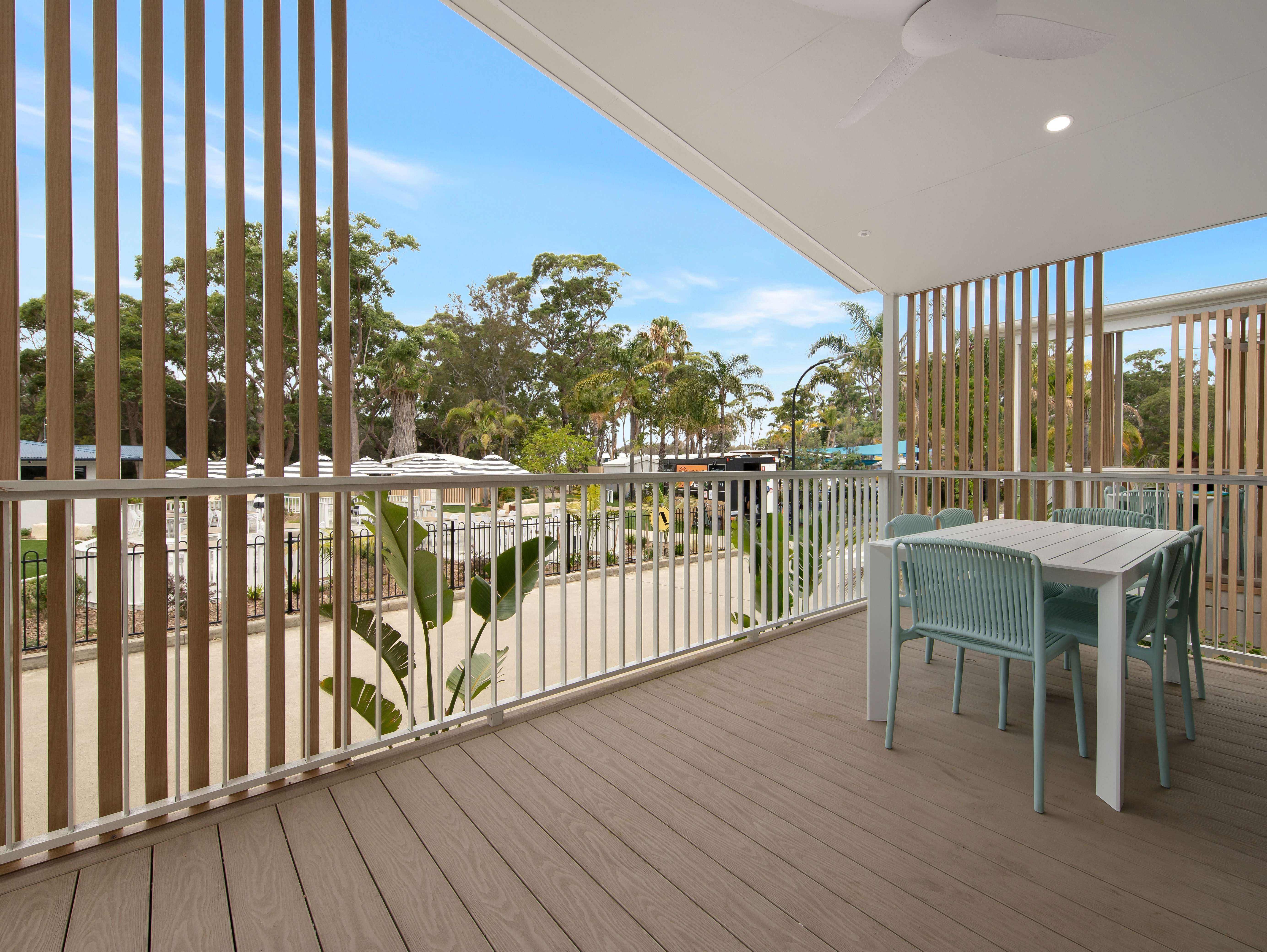 Our light and airy Premium Poolside Villas are perfect for the family that love to spend time in the pool. The Premium Poolside Villas have a main bedroom with a queen sized bed, and a second bedroom with twin bunks, comfortably sleeping up to 6 people. The spacious, air-conditioned living area has a large lounge and flat screen TV. The open plan kitchen is fully equipped with a full-sized fridge, microwave, cooktop, crockery and utensils and leads onto an internal dining area and a spacious balcony with outdoor seating overlooking the pool.