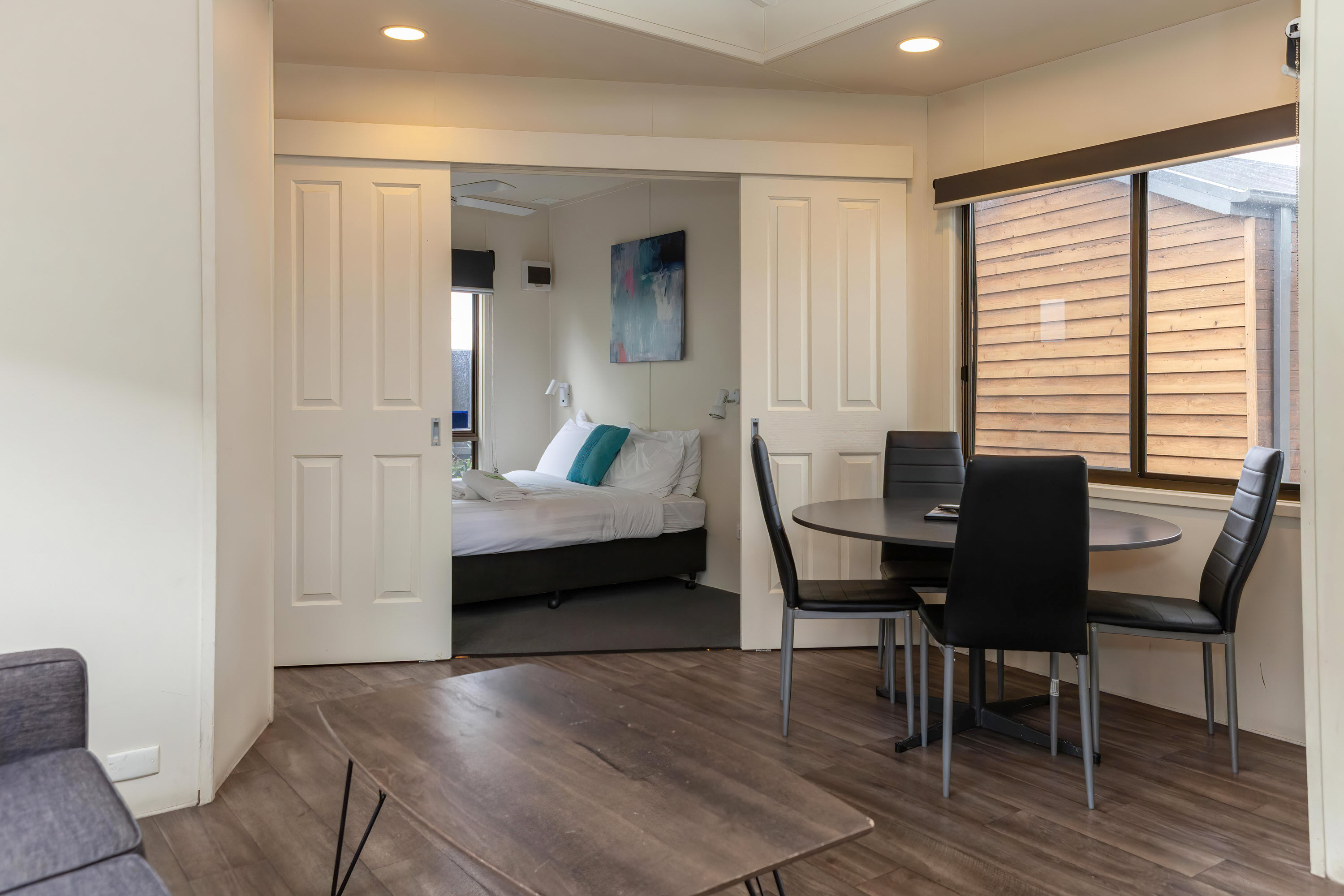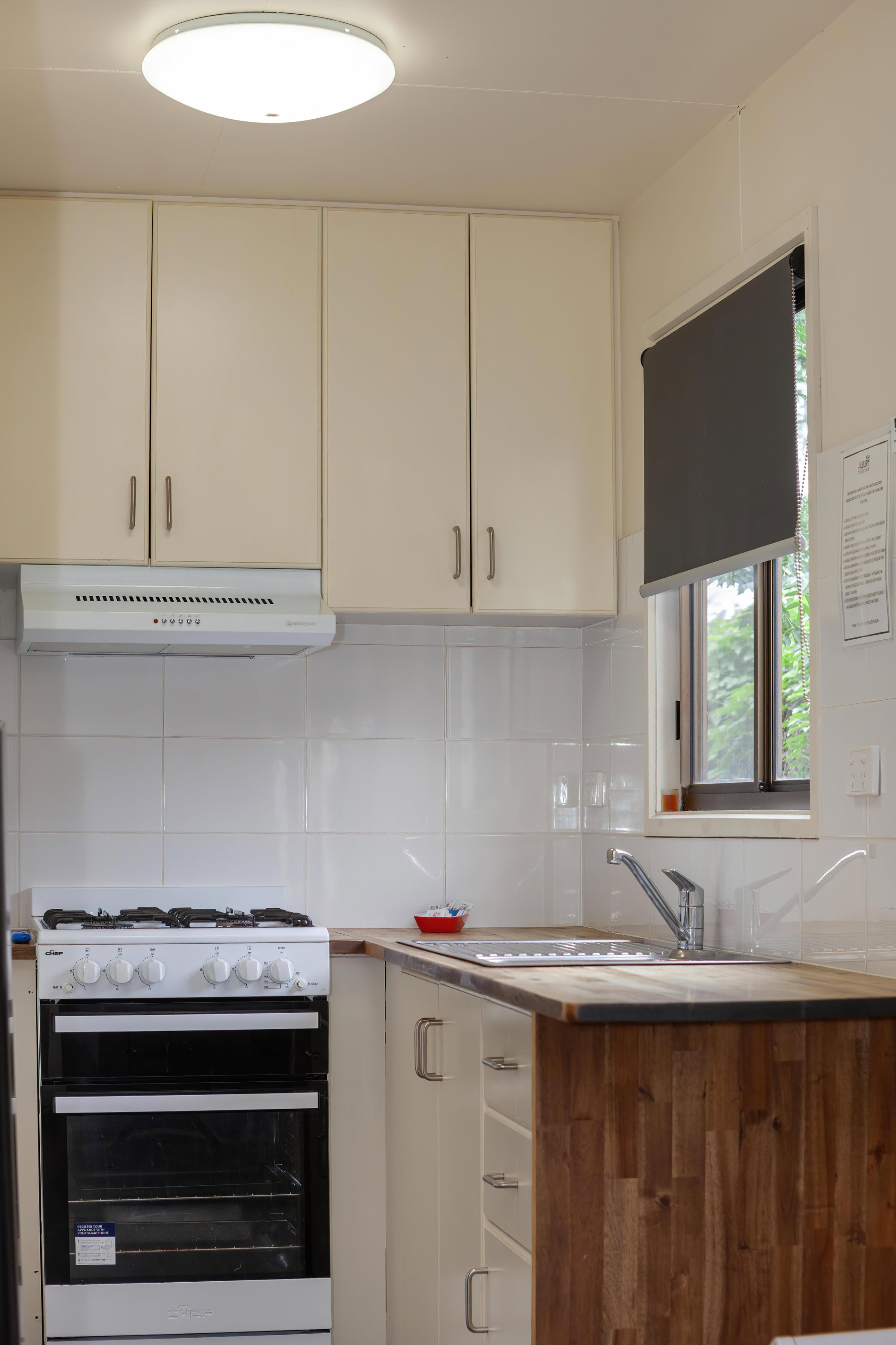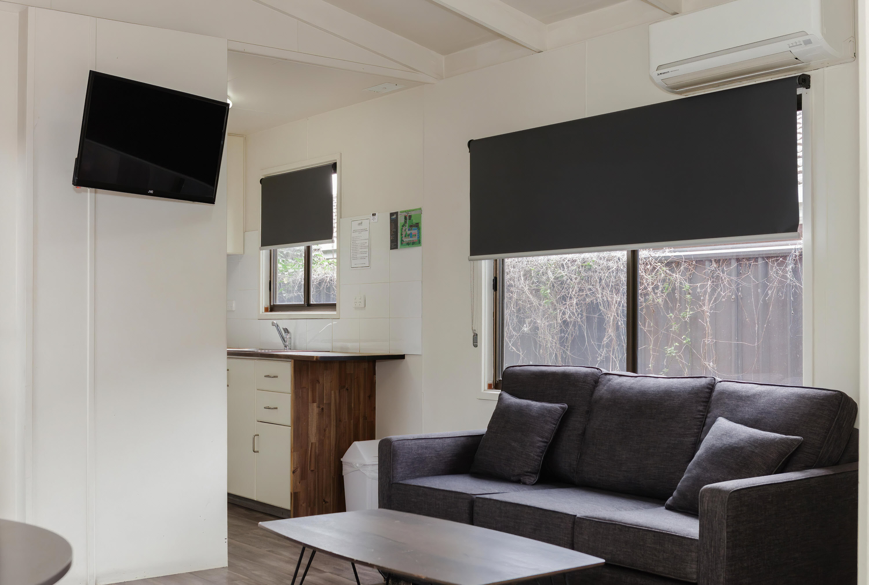 Holidaying can make for hungry work. So, feeding the troops will be a little more relaxing with a full kitchen as well as a lounge/dining area providing plenty of room for everyone to relax or join in the cooking. Of course, our two bedroom park cabin also comes with a flatscreen TV, reverse cycle A/C and parking alongside the cabin.