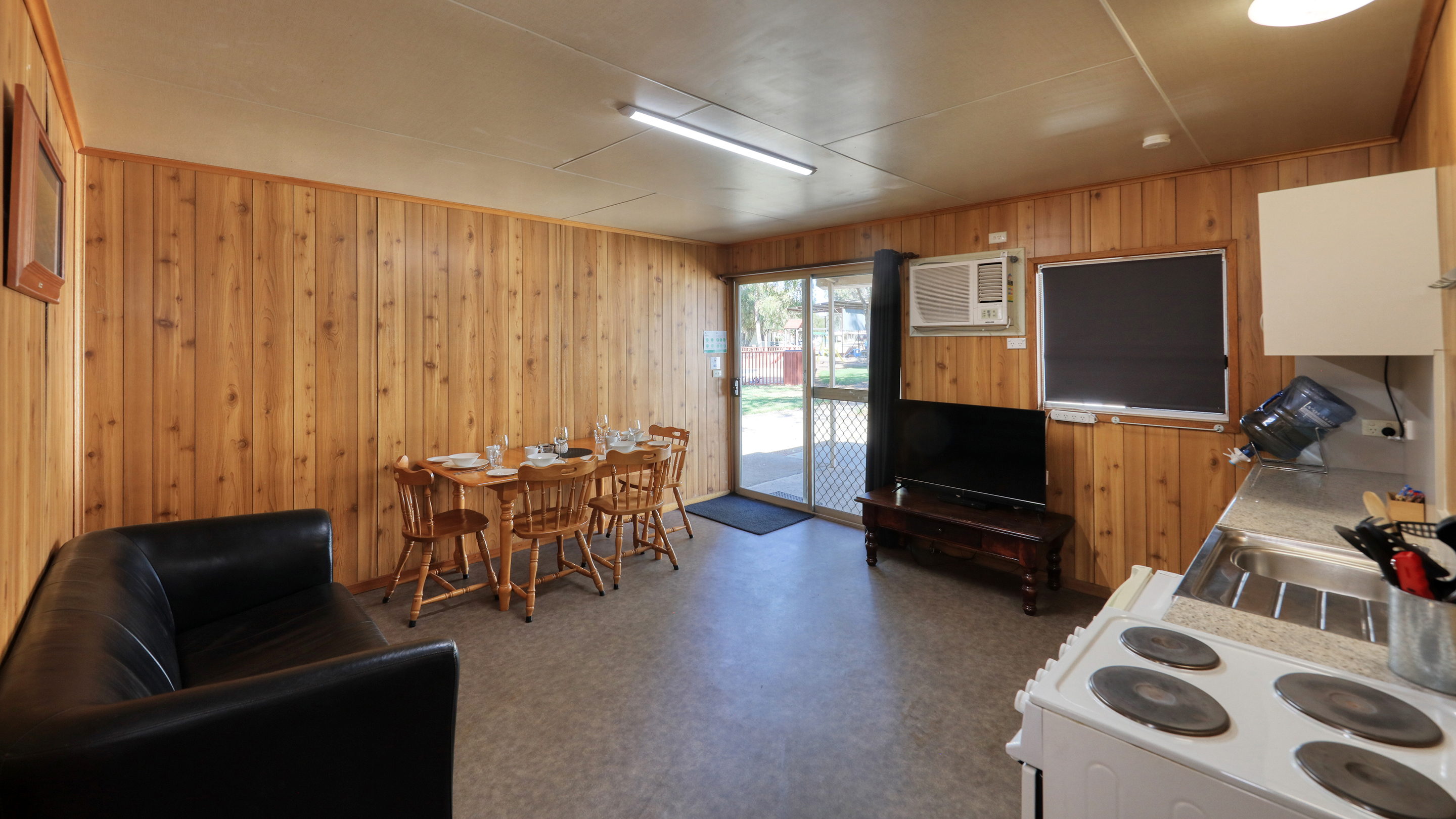The bedrooms sit around a spacious living area with a comfy two-seater couch, table suitable for 6 and a TV.