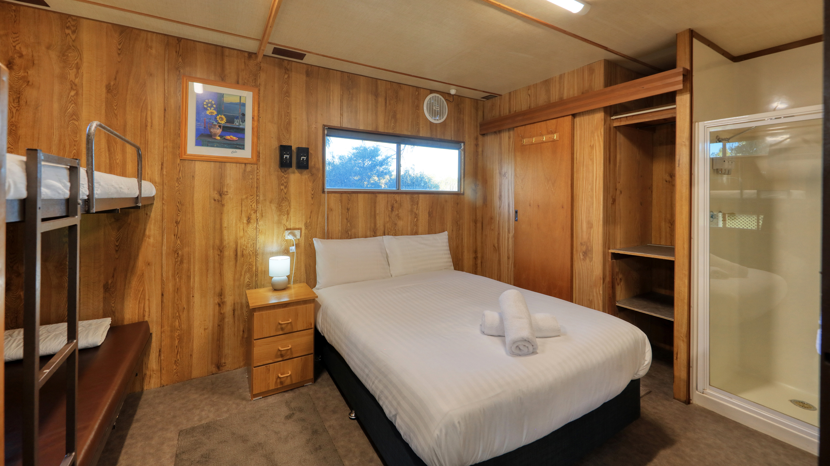 The bedroom features a compact ensuite and shower. It includes a double bed with an electric blanket, linen, and newly carpeted floors, along with a set of double bunks (linen kits available for the bunks). A curtained archway separates the room from the living area.
