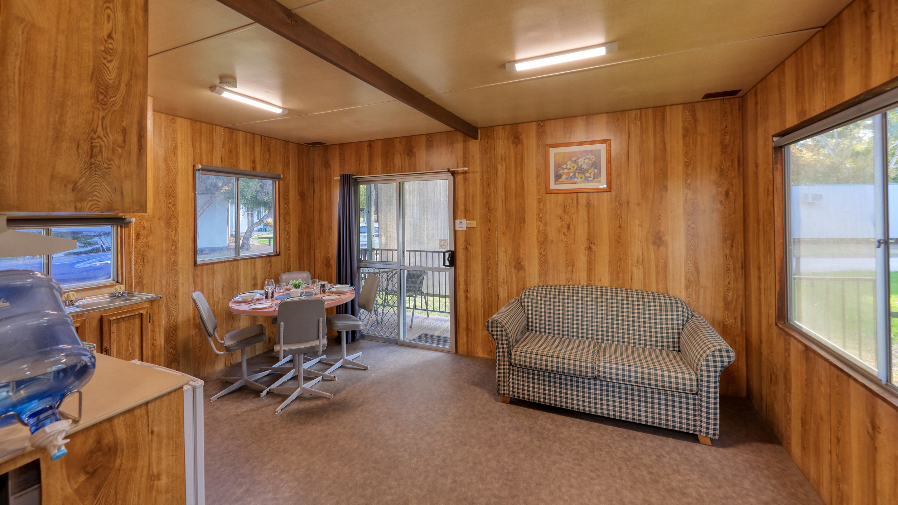 The spacious living area has a four-seater table, a comfy two-seater couch, and a TV.