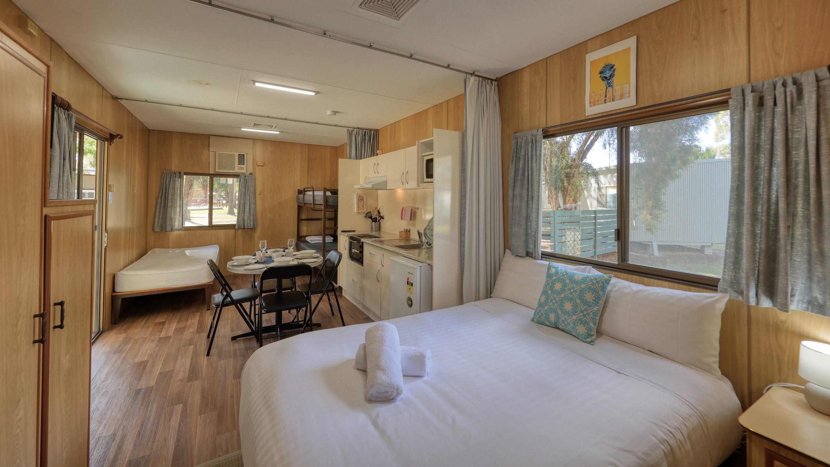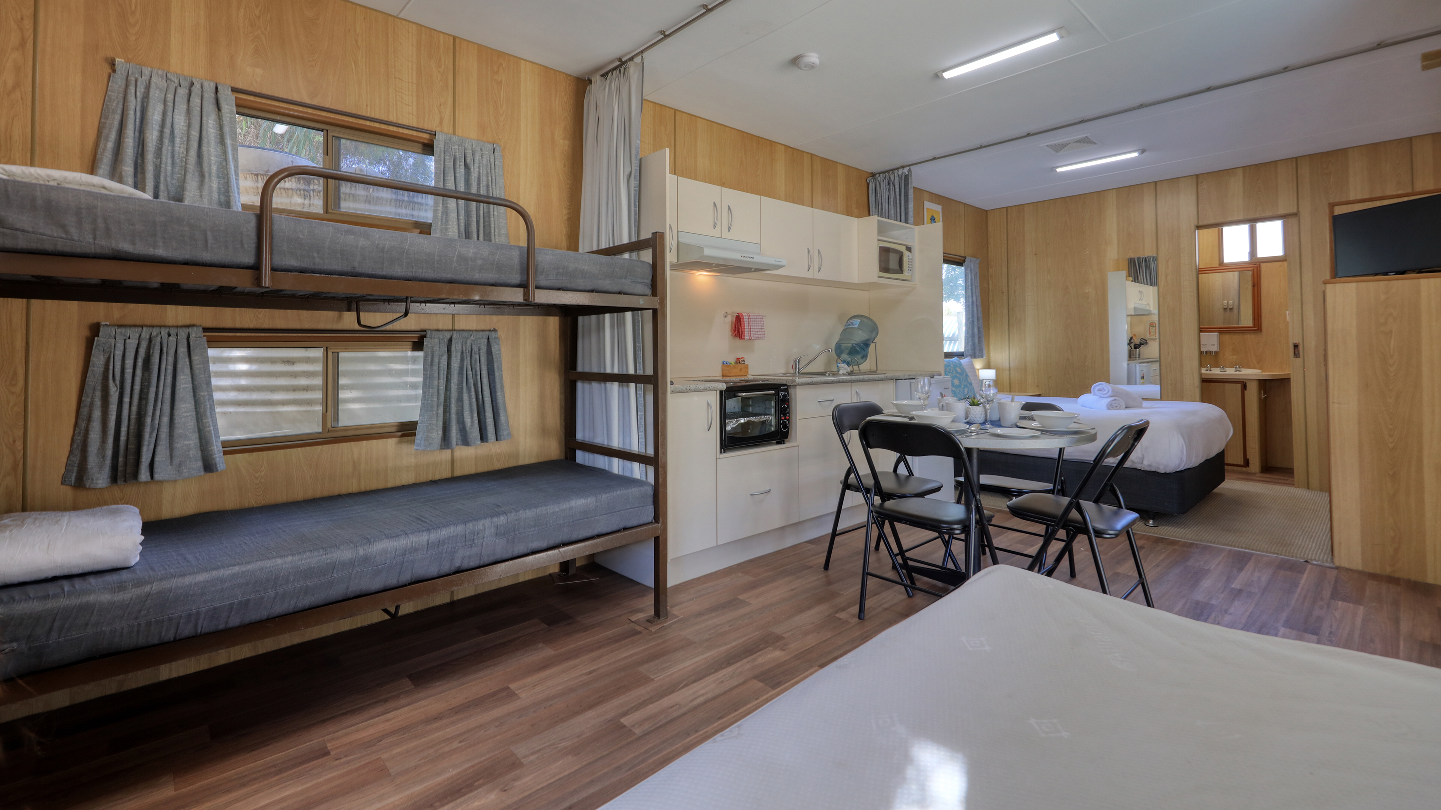 A cosy double bed (with electric blanket) sits on a carpeted area next to a full Ensuite and is separated from the single bed area by a spacious kitchen living area in between.