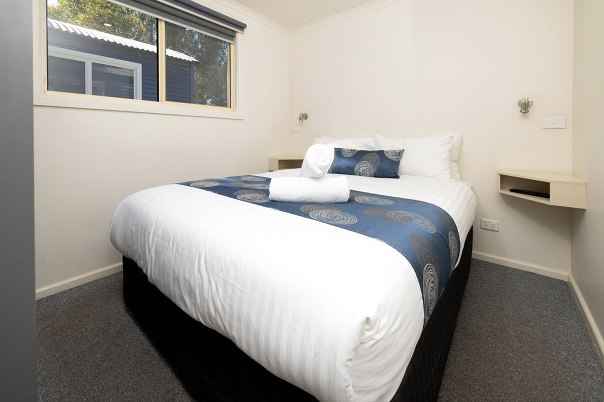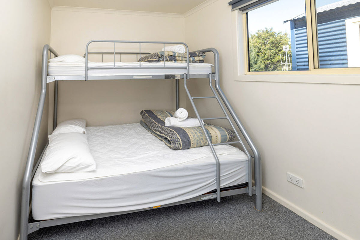 - The cabins have two bedrooms with a queen bed in main bedroom and a double bed with a single overhead bunk in the 2nd bedroom.
