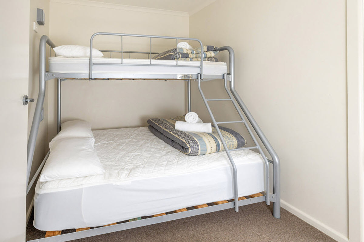 - There are two bedrooms with a queen bed in the main bedroom and a double bed with a single overhead bunk in 2nd bedroom.
