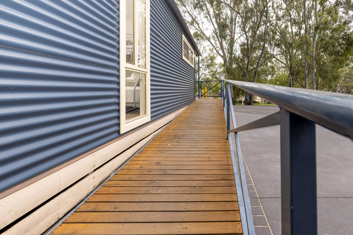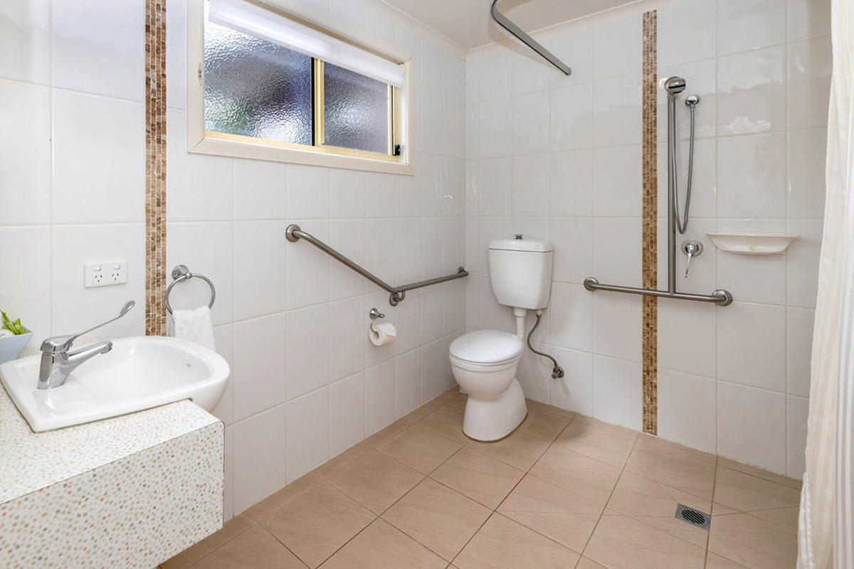 This cabin has been specifically designed for easy access via wheelchair, with ramp and wide doorways. All rooms are accessible and spacious allowing easy wheelchair movement, including bedrooms. The bathroom has grab rails and the shower level floor surface is free of steps with a shower chair provided. All fittings throughout the unit can be accessed from a seated position.