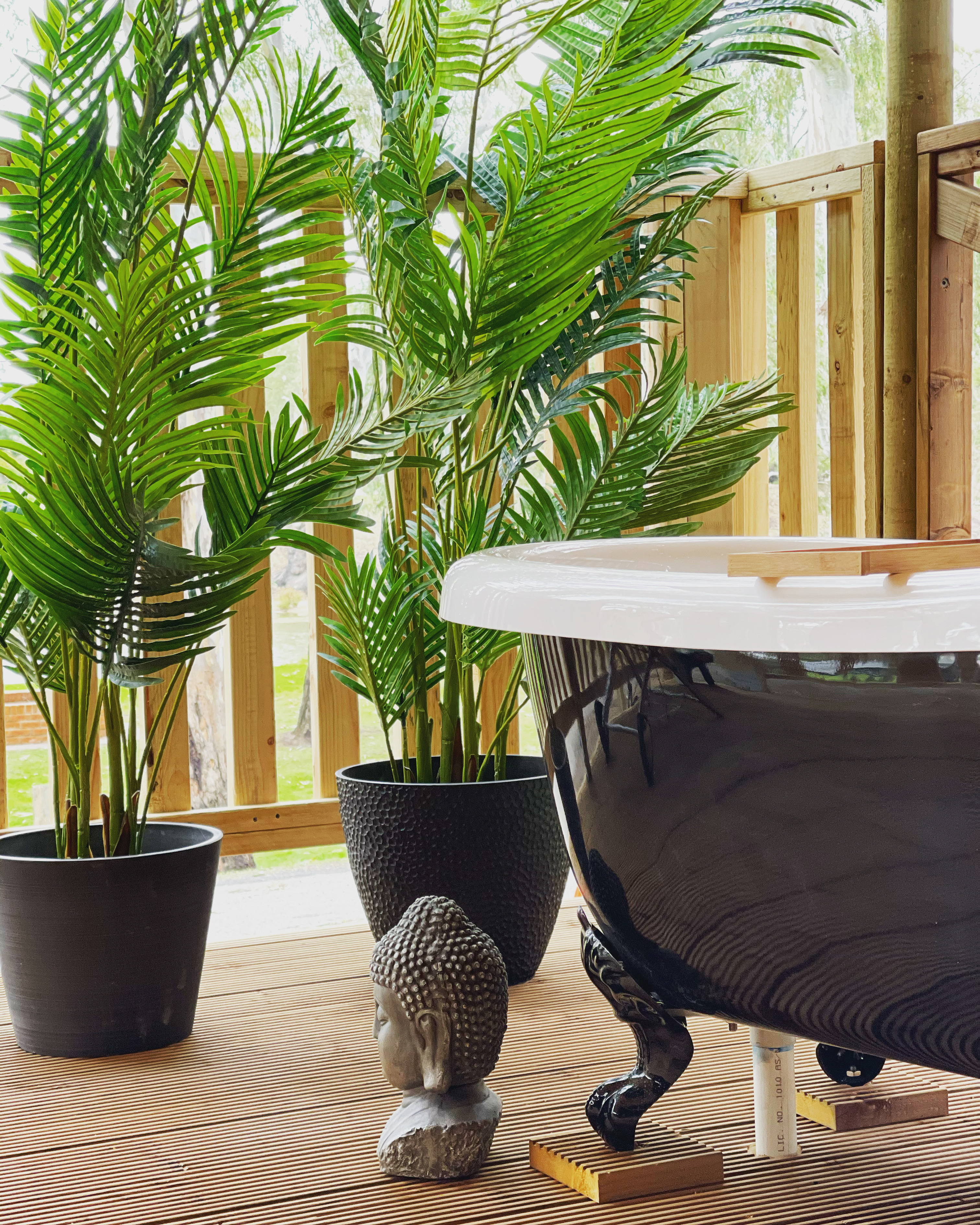 Two of our glampers feature large outdoor baths on the deck — perfect for a soothing soak under the stars or a splash with the kids. The other two offer a relaxed outdoor lounge setting, ideal for kicking back with a book.