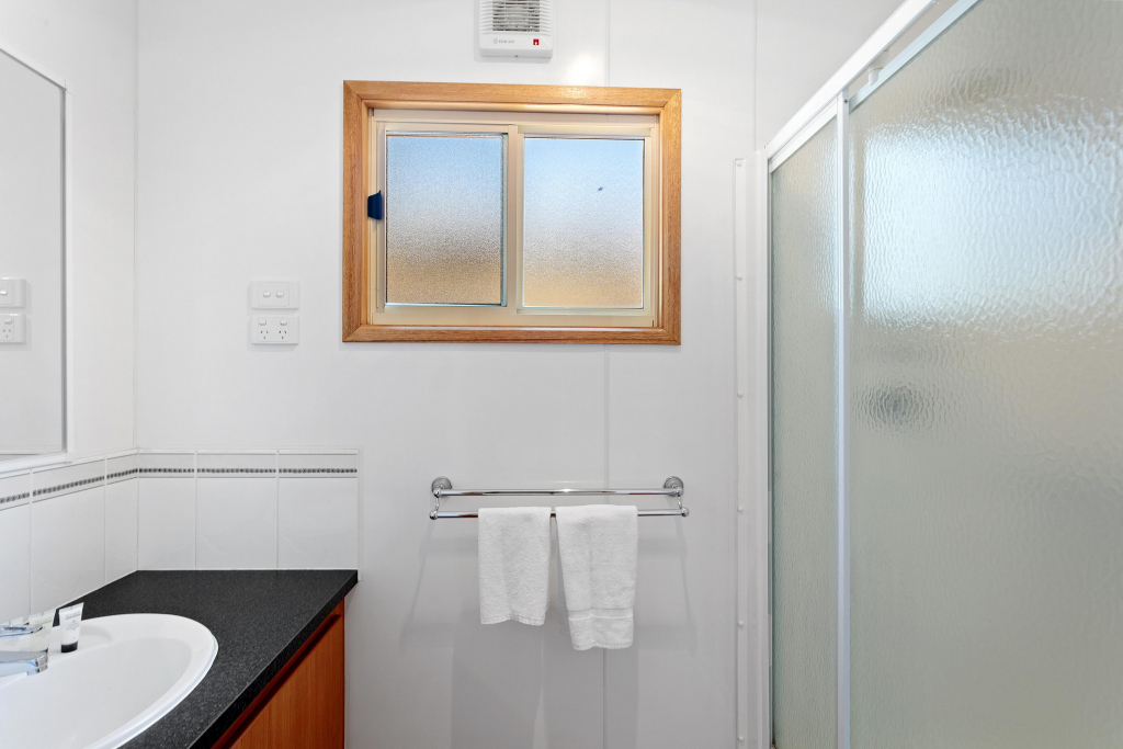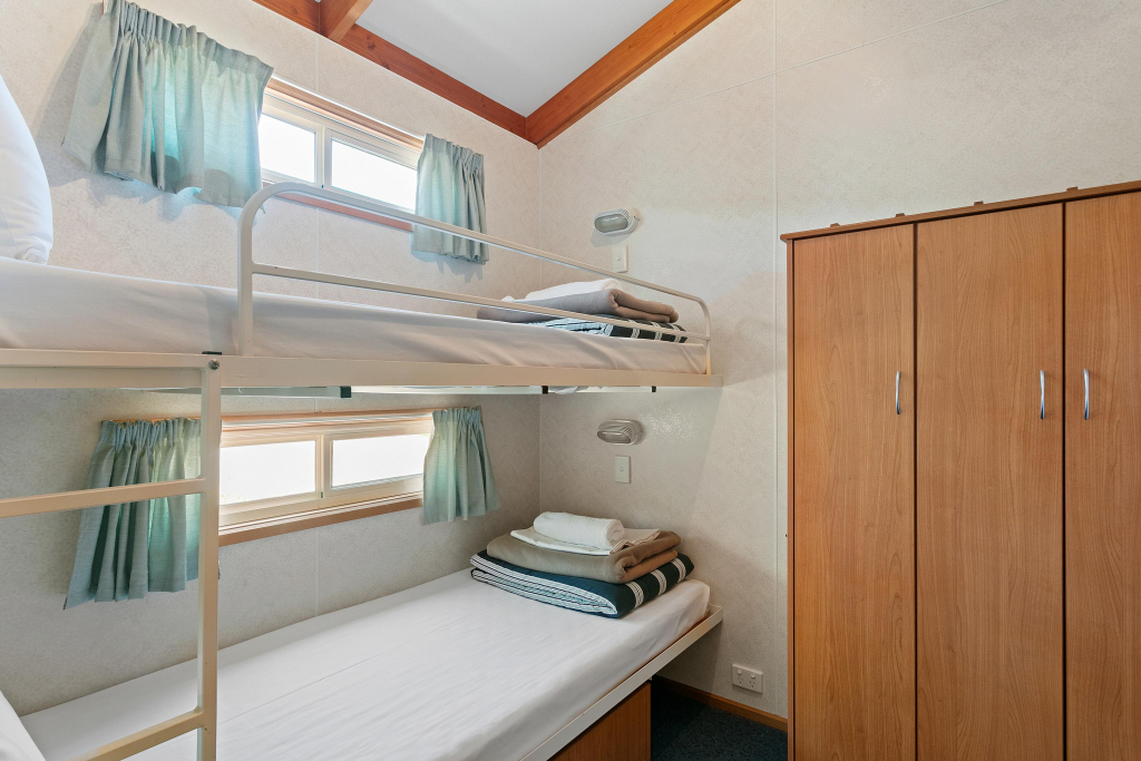 With a queen bed in the main room with a ceiling fan, a large wardrobe (with spare pillows), and TV. The second bedroom has a double bed with a fold-down single above and side wardrobes. The third bedroom has 1 bunk bed (2 singles) with a large wardrobe.
