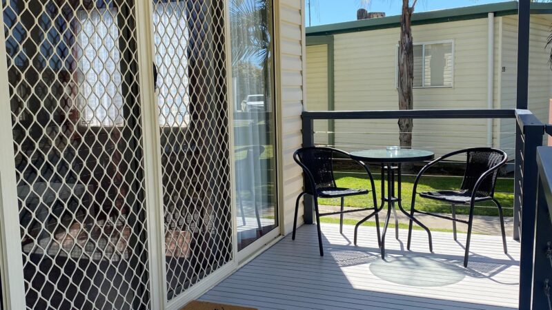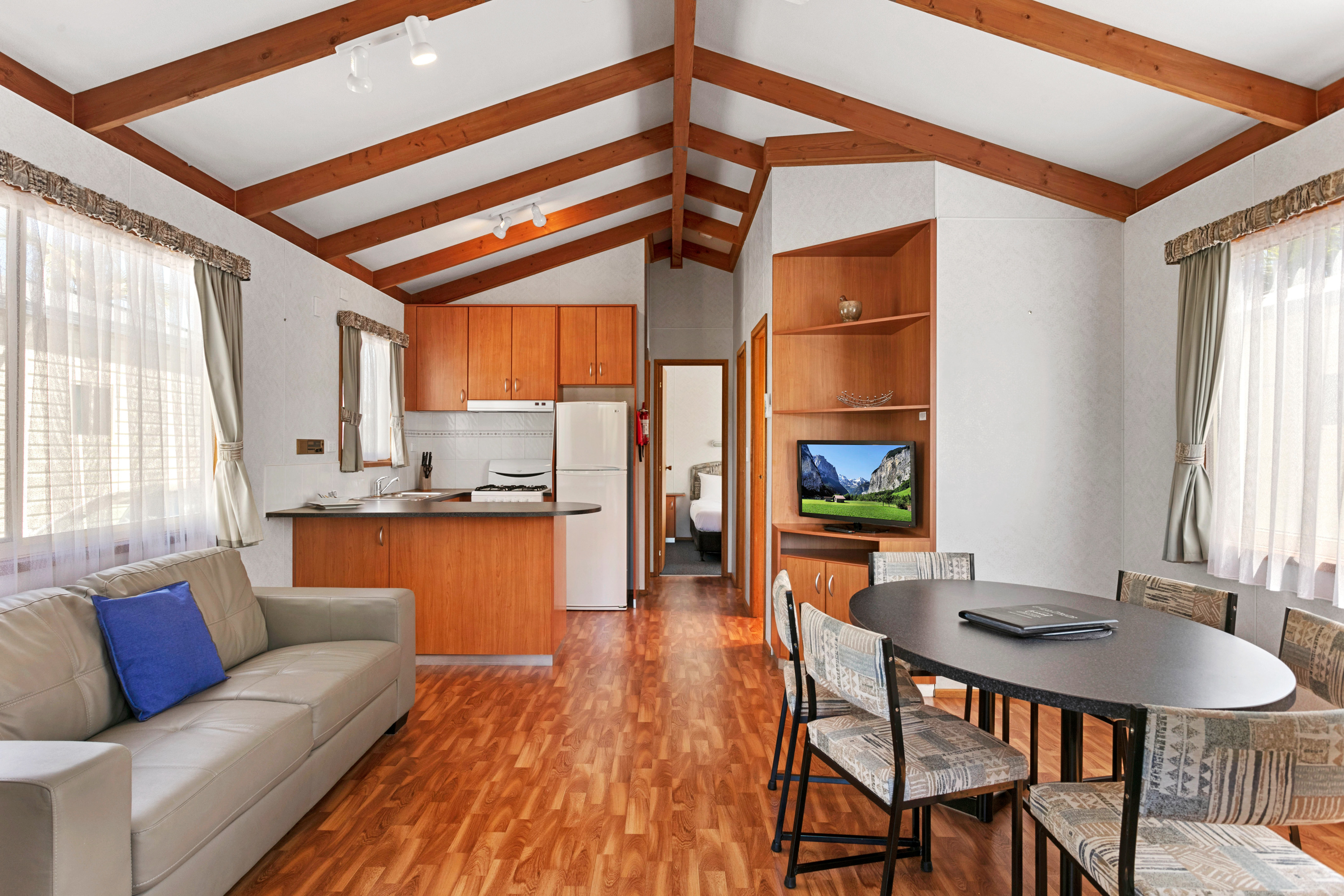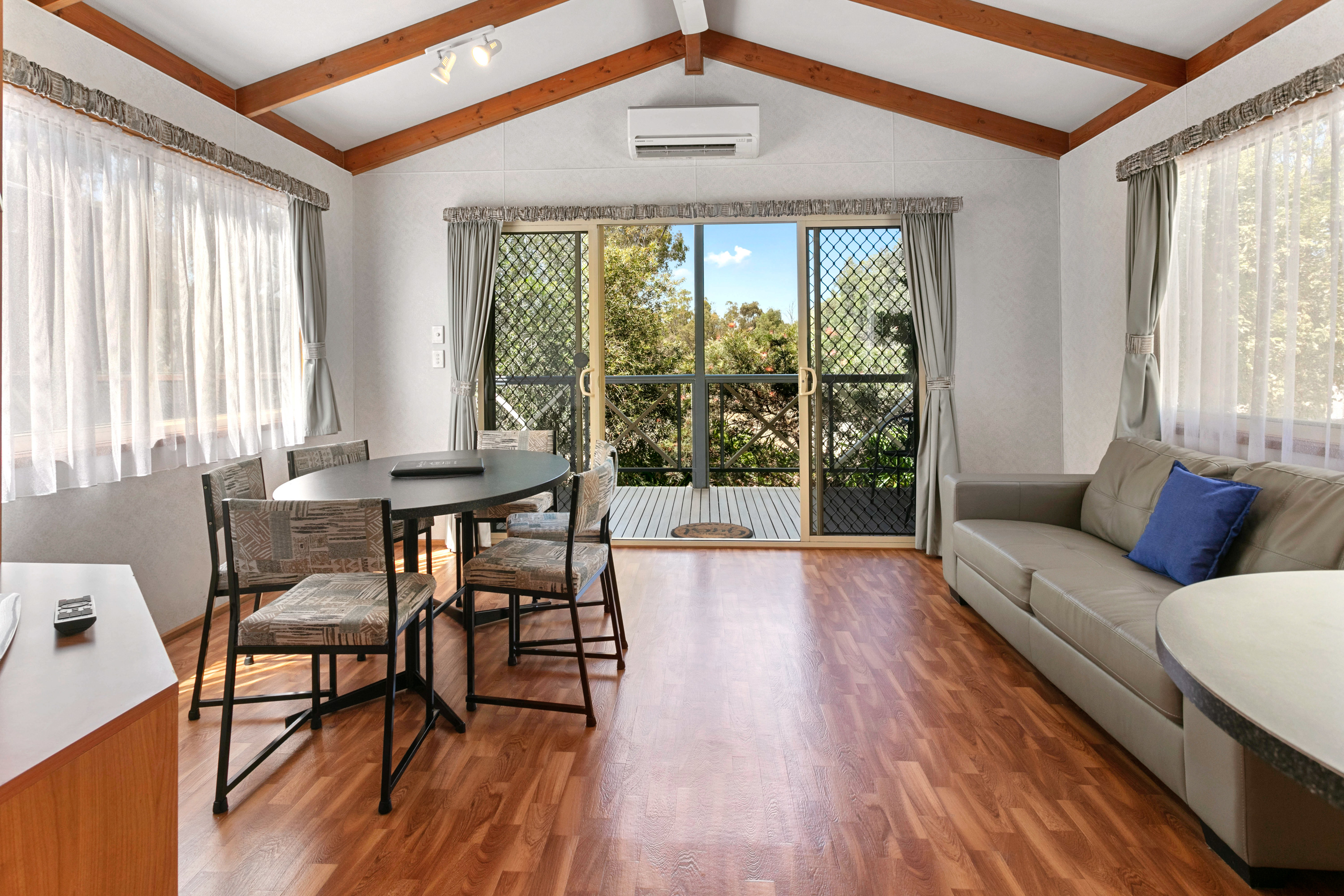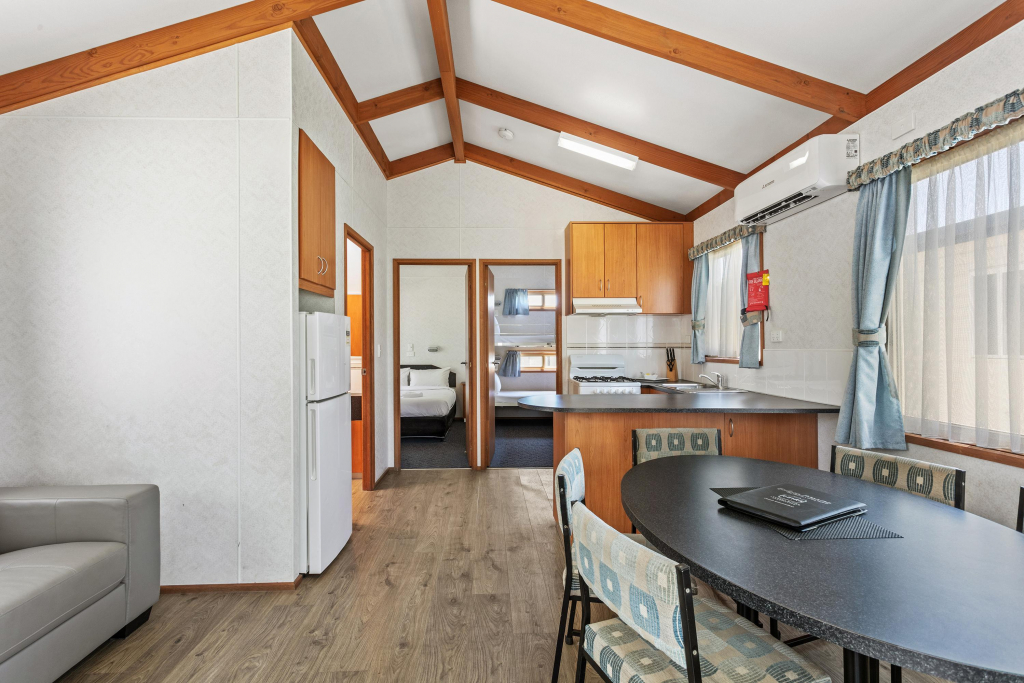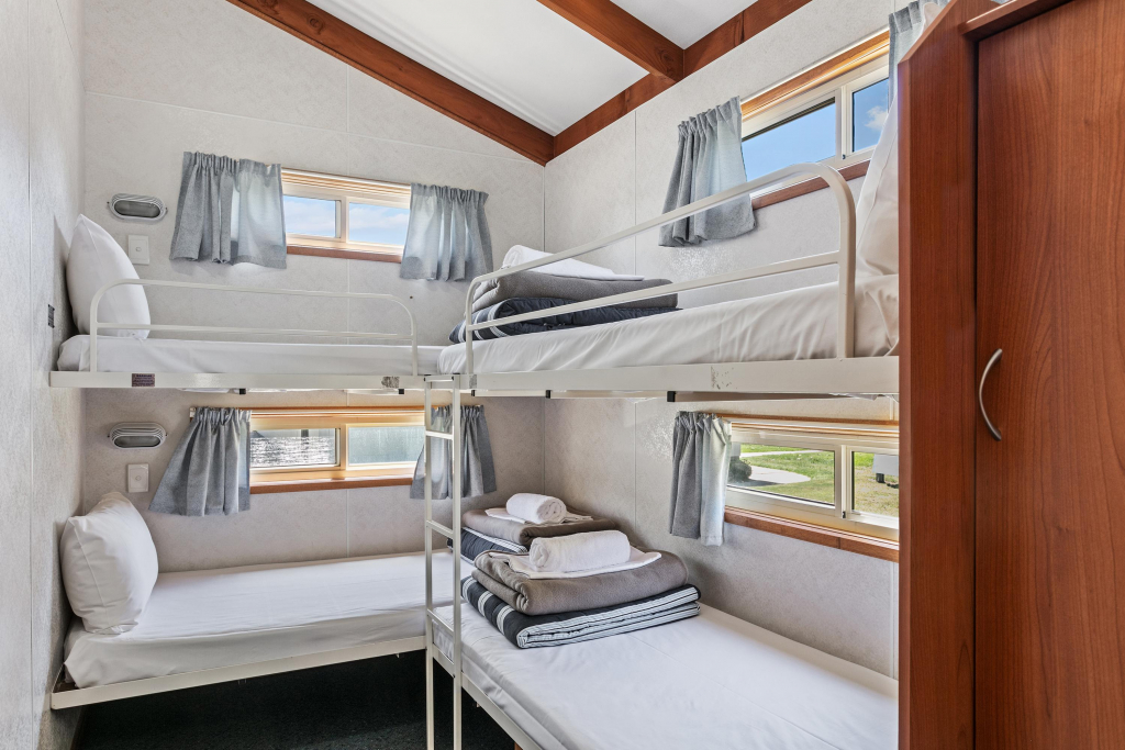 Our 2 bedroom Wattle Cabin consists of a queen bed in the main room with large wardrobe and 2 corner bunks (4 singles) in the second bedroom with a large wardrobe.