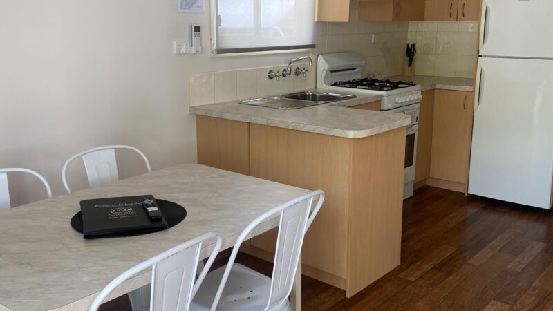 Bathroom with hair dryer, open plan living-dining area with 3 seater couch, split system heating and cooling with ceiling fan in the lounge room and main room, large dining table, and fully equipped kitchen with large fridge. Iron and iron board included.