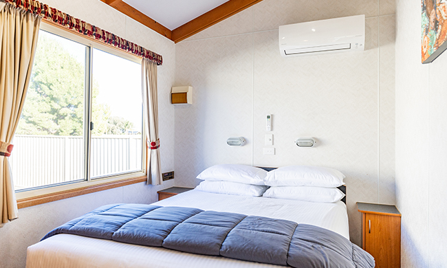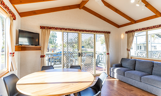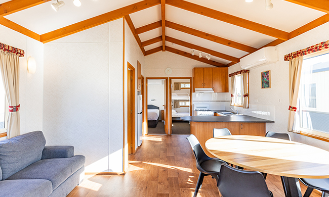 Two bedroom cabin, located close to tennis courts, recreation room and barbecue facilities. One queen and two single bunks. Featuring a stylish interior with air-conditioning; kitchen including oven and stovetop; bathroom; spacious dining and lounge area; TV; covered veranda with outdoor setting and private barbecue.