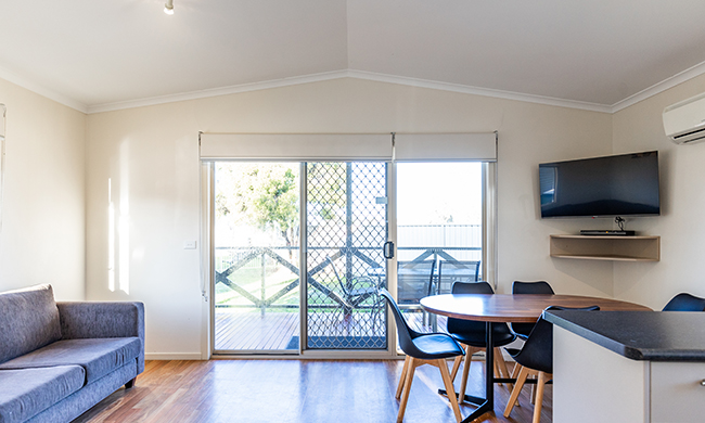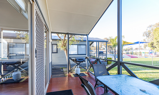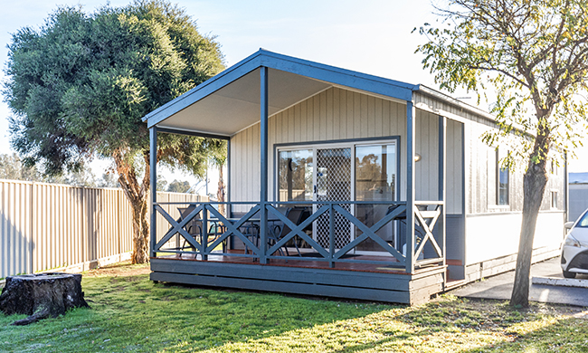 Executive two bedroom cabin with large veranda for entertaining or relaxing. Two bedrooms. One queen and two single bunks. Features air-conditioning; full kitchen including oven and microwave; bathroom; dining area; large lounge setting; TV; veranda with private barbecue.